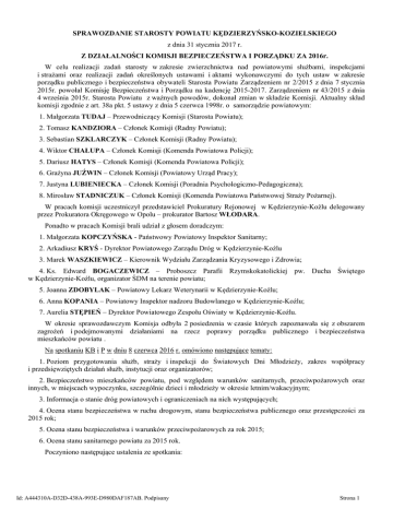 SPRAWOZDANIE STAROSTY POWIATU KĘDZIERZYŃSKO-KOZIELSKIEGO z dnia 31 stycznia 2017 r. Z DZIAŁALNOŚCI KOMISJI BEZPIECZEŃSTWA I PORZĄDKU ZA 2016r. W celu realizacji zadań starosty w zakresie zwierzchnictwa nad powiatowymi służbami, inspekcjami i strażami oraz realizacji zadań określonych ustawami i aktami wykonawczymi do tych ustaw w zakresie porządku publicznego i bezpieczeństwa obywateli Starosta Powiatu Zarządzeniem nr 2/2015 z dnia 7 stycznia 2015r. powołał Komisję Bezpieczeństwa i Porządku na kadencję 2015-2017. Zarządzeniem nr 43/2015 z dnia 4 września 2015r. Starosta Powiatu z ważnych powodów, dokonał zmian w składzie Komisji. Aktualny skład komisji zgodnie z art. 38a pkt. 5 ustawy z dnia 5 czerwca 1998r. o samorządzie powiatowym: 1. Małgorzata TUDAJ – Przewodniczący Komisji (Starosta Powiatu); 2. Tomasz KANDZIORA – Członek Komisji (Radny Powiatu); 3. Sebastian SZKLARCZYK – Członek Komisji (Radny Powiatu); 4. Wiktor CHAŁUPA – Członek Komisji (Komenda Powiatowa Policji); 5. Dariusz HATYS – Członek Komisji (Komenda Powiatowa Policji); 6. Grażyna JUŹWIN – Członek Komisji (Powiatowy Urząd Pracy); 7. Justyna LUBIENIECKA – Członek Komisji (Poradnia Psychologiczno-Pedagogiczna); 8. Mirosław STADNICZUK – Członek Komisji (Komenda Powiatowa Państwowej Straży Pożarnej). W pracach komisji uczestniczył przedstawiciel Prokuratury Rejonowej w Kędzierzynie-Koźlu delegowany przez Prokuratora Okręgowego w Opolu – prokurator Bartosz WŁODARA. Ponadto w pracach Komisji brali udział z głosem doradczym: 1. Małgorzata KOPCZYŃSKA - Państwowy Powiatowy Inspektor Sanitarny; 2. Arkadiusz KRYŚ - Dyrektor Powiatowego Zarządu Dróg w Kędzierzynie-Koźlu 3. Marek WASZKIEWICZ – Kierownik Wydziału Zarządzania Kryzysowego i Zdrowia; 4. Ks. Edward BOGACZEWICZ – Proboszcz Parafii Rzymskokatolickiej pw. Ducha Świętego w Kędzierzynie-Koźlu, organizator ŚDM na terenie powiatu; 5. Joanna ZDOBYLAK – Powiatowy Lekarz Weterynarii w Kędzierzynie-Koźlu; 6. Anna KOPANIA – Powiatowy Inspektor nadzoru Budowlanego w Kędzierzynie-Koźlu; 7. Aurelia STĘPIEŃ – Dyrektor Powiatowego Zespołu Oświaty w Kędzierzynie-Koźlu. W okresie sprawozdawczym Komisja odbyła 2 posiedzenia w czasie których zapoznawała się z obszarem zagrożeń i podejmowanymi działaniami na rzecz poprawy porządku publicznego i bezpieczeństwa mieszkańców powiatu . Na spotkaniu KB i P w dniu 8 czerwca 2016 r. omówiono następujące tematy: 1. Poziom przygotowania służb, straży i inspekcji do Światowych Dni Młodzieży, zakres współpracy i przedsięwziętych działań służb, instytucji oraz organizatorów; 2. Bezpieczeństwo mieszkańców powiatu, pod względem warunków sanitarnych, przeciwpożarowych oraz innych, w miejscach wypoczynku, szczególnie dzieci i młodzieży w okresie letnim/wakacyjnym; 3. Informacja o stanie dróg powiatowych i ograniczeniach na nich występujących; 4. Ocena stanu bezpieczeństwa w ruchu drogowym, stanu bezpieczeństwa publicznego oraz przestępczości za 2015 rok; 5. Ocena stanu bezpieczeństwa i warunków przeciwpożarowych za rok 2015; 6. Ocena stanu sanitarnego powiatu za 2015 rok. Poczyniono następujące ustalenia ze spotkania: Id: A444310A-D32D-438A-993E-D980DAF187AB. Podpisany Strona 1 1. Światowe Dni Młodzieży w Krakowie odbyły się w terminie od: 26.07.2016r. do 31.07.2016 r. W powiecie kędzierzyńsko-kozielskim, pobyt pielgrzymów wiązał się nie tylko z kwestią udzielenia noclegów, ale także organizacji im czasu w ramach tzw. imprez towarzyszących. - Imprezy towarzyszące Światowym Dniom Młodzieży w lipcu 2016 roku na terenie powiatu kędzierzyńskokozielskiego zostały zaplonowane na około 300 pielgrzymów. W kwestii organizacji imprez i ich zabezpieczenia, organizator posiadał już wyznaczonych wolontariuszy, natomiast w kwestii zapewnienia porządku i bezpieczeństwa był w trakcie podpisywania odpowiednich umów z firmami świadczącymi usługi ochrony. Organizator poinformował także o ścisłej współpracy zUrzędem Miasta Kędzierzyna-Koźla, jak i z Komendą Powiatową Policji w Kędzierzynie-Koźlu. Ustalono że każdy z pielgrzymów zostanie wyposażony w lokalną plakietkę identyfikacyjną, oprócz tej którą będzie posiadał w ramach wykupionego „pakietu pielgrzyma”. - Rozkazem odgórnym, w ramach odwodu operacyjnego KSRG zdecydowano o wydelegowaniu dwóch samochodów z obsługą, służących w Jednostce Ratowniczo Gaśniczej w Azotach, na organizację Światowych dni Młodzieży w Brzegach koło Krakowa. Pomimo przekazania tych samochodów, KP PSP kadrowo utrzymuje stan minimum tj. 22 ratowników, a który w ciągu 30 minut jest w stanie podwoić do prawie 50 pracowników. Jednocześnie Komendant PSP w Kędzierzynie-Koźlu wystąpił do WIOŚ w Opolu o wypożyczenie (zdublowanie) sprzętu służącego do wykrywania i rozpoznawania skażeń chemicznych, biologicznych i radiologicznych. - Służby sanitarne także przygotowywały się do ŚDM. W obszarze zainteresowań PSSE w omawianym okresie będzie żywność, i miejsca wyżywienia zbiorowego, zaopatrzenie w wodę oraz miejsca noclegowe. Przyjęto że miejsca te na terenie powiatu są inspekcji sanitarnej bardzo dobrze znane i są objęte stałym nadzorem. Noclegi natomiast odbywać się będą na zasadzie „gościny” w mieszkaniach osób prywatnych, stąd nie mają tu zastosowania przepisy co do minimalnych wymogów zakwaterowania. Poza obiadami zakłada się, że wyżywienie pozostaje w kwestii prywatnej- poczęstunek w domach mieszkańców goszczących pielgrzymów. PSSE nie może w tej kwestii ingerować, ale przygotuje akcję informacyjną co do zasad żywienia i przechowywania żywności, które przy współpracy z organizatorem ŚDM w powiecie, rozkolportuje po mieszkańcach. 2. Analogicznie jak w latach poprzednich problemem związanym z miejscami wypoczynku jest fakt, że pomimo dużej ilości zbiorników wodny