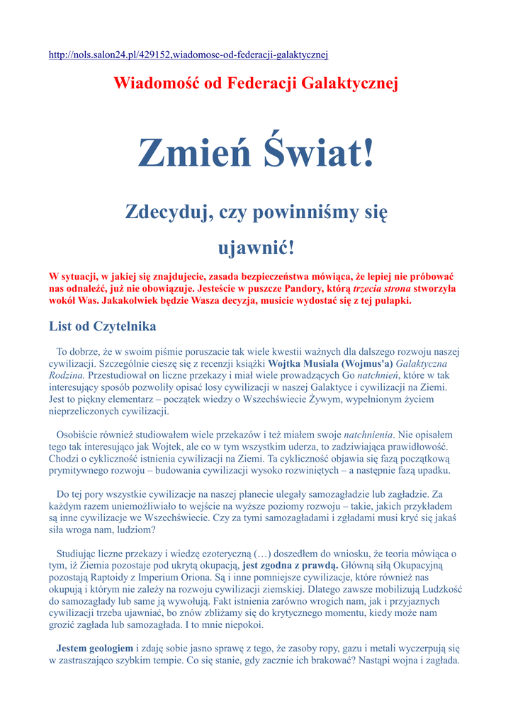 http://nols.salon24.pl/429152,wiadomosc-od-federacji-galaktycznej Wiadomość od Federacji Galaktycznej Zmień Świat! Zdecyduj, czy powinniśmy się ujawnić! W sytuacji, w jakiej się znajdujecie, zasada bezpieczeństwa mówiąca, że lepiej nie próbować nas odnaleźć, już nie obowiązuje. Jesteście w puszcze Pandory, którą trzecia strona stworzyła wokół Was. Jakakolwiek będzie Wasza decyzja, musicie wydostać się z tej pułapki. List od Czytelnika To dobrze, że w swoim piśmie poruszacie tak wiele kwestii ważnych dla dalszego rozwoju naszej cywilizacji. Szczególnie cieszę się z recenzji książki Wojtka Musiała (Wojmus'a) Galaktyczna Rodzina. Przestudiował on liczne przekazy i miał wiele prowadzących Go natchnień, które w tak interesujący sposób pozwoliły opisać losy cywilizacji w naszej Galaktyce i cywilizacji na Ziemi. Jest to piękny elementarz – początek wiedzy o Wszechświecie Żywym, wypełnionym życiem nieprzeliczonych cywilizacji. Osobiście również studiowałem wiele przekazów i też miałem swoje natchnienia. Nie opisałem tego tak interesująco jak Wojtek, ale co w tym wszystkim uderza, to zadziwiająca prawidłowość. Chodzi o cykliczność istnienia cywilizacji na Ziemi. Ta cykliczność objawia się fazą początkową prymitywnego rozwoju – budowania cywilizacji wysoko rozwiniętych – a następnie fazą upadku. Do tej pory wszystkie cywilizacje na naszej planecie ulegały samozagładzie lub zagładzie. Za każdym razem uniemożliwiało to wejście na wyższe poziomy rozwoju – takie, jakich przykładem są inne cywilizacje we Wszechświecie. Czy za tymi samozagładami i zgładami musi kryć się jakaś siła wroga nam, ludziom? Studiując liczne przekazy i wiedzę ezoteryczną (…) doszedłem do wniosku, że teoria mówiąca o tym, iż Ziemia pozostaje pod ukrytą okupacją, jest zgodna z prawdą. Główną siłą Okupacyjną pozostają Raptoidy z Imperium Oriona. Są i inne pomniejsze cywilizacje, które również nas okupują i którym nie zależy na rozwoju cywilizacji ziemskiej. Dlatego zawsze mobilizują Ludzkość do samozagłady lub same ją wywołują. Fakt istnienia zarówno wrogich nam, jak i przyjaznych cywilizacji trzeba ujawniać, bo znów zbliżamy się do krytycznego momentu, kiedy może nam grozić zagłada lub samozagłada. I to mnie niepokoi. Jestem geologiem i zdaję sobie jasno sprawę z tego, że zasoby ropy, gazu i metali wyczerpują się w zastraszająco szybkim tempie. Co się stanie, gdy zacznie ich brakować? Nastąpi wojna i zagłada. Już dziś duże koncerny i bogate państwa kładą swoja łapę na złożach krajów słabych i małych (…) Prowadząc taką zaborczą politykę, koncerny wpędzają w biedę liczne kraje, które dzięki swoim zasobom mogłyby być bogate, a ludzie w nich mogliby żyć dostatnio! Również w moim regionie zauważam początki tej wojny: przedsiębiorcy walczą ze sobą zaciekle o złoża piasków i żwirów. Chodzi o złoża o małej miąższości, zaglinione, zapylone, o słabej jakości kruszywa, na które 10 lat temu nikt nawet by nie spojrzał. A oni walczą o nie, bo czują biznes. Dobre złoża o dobrej jakości kruszywa wyczerpały się już prawie zupełnie. Walka pomiędzy przedsiębiorcami przyjmuje czasem bardzo wyrafinowane formy. Podkupują sobie nawzajem grunty, uniemożliwiając wydobycie lub robią inne świństwa i świństewka. Ktoś wszczepił w ludzi zachłanność i brak rozsądku, skoro nie widzą, że walczą o coś, co się nieubłaganie wyczerpuje. Żyją tylko dniem dzisiejszym, chwilowym zyskiem, w myśl zasady po nas choćby i potop. A przecież po nas przyjdzie jeszcze niezliczona liczba pokoleń, które też muszą jakoś żyć. Zamiast więc ze sobą walczyć, aby przetrwać, potrzebujemy współpracy i nowych rewolucyjnych wręcz technologii. Jeśli Ludziom na Ziemi brakuje rozsądku, może są jakieś mądre i rozsądne siły, które mogą nam pomóc przetrwać, tak jak pomagały napisać Wojmus'owi Galaktyczną Rodzinę? Trafiłem kiedyś na mądry przekaz od Federacji Galaktycznej. Ponieważ mówi on sam za siebie, nie będę go komentował. Wierzę, że znajdzie się kiedyś dla niego miejsce na stronach Nieznanego Świata. Niech ludzie go przemyślą. Jacek S. ________________________________________________________________________________ ____ Wiadomość od Federacji Galaktycznej Zmień świat! Decyzja jest w twoich rękach …...........................................................