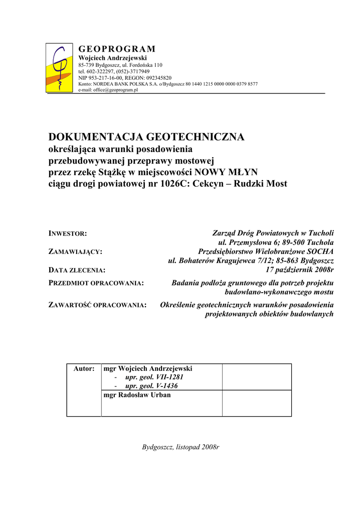 GEOPROGRAM Wojciech Andrzejewski 85-739 Bydgoszcz, ul. Fordońska 110 tel. 602-322297, (052)-3717949 NIP 953-217-16-00, REGON: 092345820 Konto: NORDEA BANK POLSKA S.A. o/Bydgoszcz 80 1440 1215 0000 0000 0379 8577 e-mail: [email protected] DOKUMENTACJA GEOTECHNICZNA określająca warunki posadowienia przebudowywanej przeprawy mostowej przez rzekę Stążkę w miejscowości NOWY MŁYN ciągu drogi powiatowej nr 1026C: Cekcyn – Rudzki Most Zarząd Dróg Powiatowych w Tucholi ul. Przemysłowa 6; 89-500 Tuchola Przedsiębiorstwo Wielobranżowe SOCHA ul. Bohaterów Kragujewca 7/12; 85-863 Bydgoszcz 17 październik 2008r INWESTOR: ZAMAWIAJĄCY: DATA ZLECENIA: PRZEDMIOT OPRACOWANIA: ZAWARTOŚĆ OPRACOWANIA: Autor: Badania podłoża gruntowego dla potrzeb projektu budowlano-wykonawczego mostu Określenie geotechnicznych warunków posadowienia projektowanych obiektów budowlanych mgr Wojciech Andrzejewski - upr. geol. VII-1281 - upr. geol. V-1436 mgr Radosław Urban Bydgoszcz, listopad 2008r Most na rzece Stążce – Nowy Młyn. Droga Powiatowa 1026C SPIS TREŚCI 1.WSTĘP 3 1.1. Podstawa opracowania 3 1.2. Cel i zakres opracowania 3 1.3. Materiały wykorzystane w opracowaniu 3 2.DANE OGÓLNE 5 2.1. Lokalizacja i opis terenu 5 2.2. Charakterystyka projektowanych obiektów 5 3. BADANIA PODŁOŻA GRUNTOWEGO 7 3.1. Zakres i metody wykonywanych badań 3.1.1. Prace polowe 3.1.2. Badania laboratoryjne 3.1.3.Prace kameralne 7 7 8 8 3.2 Środowisko geograficzne. Geomorfologia. 8 3.3 Budowa geologiczna 9 3.4 Warunki wodne 9 4.GEOTECHNICZNA CHARAKTERYSTYKA PODŁOŻA 10 5. WNIOSKI I ZALECENIA 12 G E O P R O G R A M – listopad 2008r 2 Most na rzece Stążce – Nowy Młyn. Droga Powiatowa 1026C 1.WSTĘP 1.1. Podstawa opracowania Podstawę opracowania stanowi zlecenie Jednostki Projektowej: Przedsiębiorstwa Wielobranżowego SOCHA, działającej w imieniu i z upoważnienia Inwestora: Zarząd Dróg Powiatowych w Tucholi. • Rozporządzenie Ministra Spraw Wewnętrznych i Administracji z dnia 24 września 1998 r. w sprawie ustalania geotechnicznych warunków posadawiania obiektów budowlanych. (Dz. U. Nr 126, poz. 839). • 1.2. Cel i zakres opracowania Celem opracowania jest określenie charakterystyki geotechnicznej podłoża gruntowego, ustalenie rodzaju gruntów, ich genezy, cech fizycznomechanicznych oraz warunków wodnych dla potrzeb projektu budowlanowykonawczego projektowanej przeprawy mostowej. Zakres opracowania obejmuje przedstawienie: • warunków geotechnicznych, zarysu geomorfologii, budowy geologicznej i stosunków wodnych, • wyników wykonanych badań polowych i laboratoryjnych, • miarodajnych wartości parametrów geotechnicznych gruntu, • podsumowania i zaleceń końcowych. 1.3. Materiały wykorzystane w opracowaniu 1. Instrukcja ITB nr.303. Ustalenie przydatności gruntów dla potrzeb budownictwa. Warszawa 1990. 2. PN-/B-02479:1998 Dokumentowanie geotechniczne. 3. PN-88/B-04481 Grunty budowlane. Badanie próbek gruntów. 4. PN-81/B-03020 Grunty budowlane. Projektowanie i obliczenia statyczne posadowień bezpośrednich. 5. PN-86/B-02480 Grunty budowlane. Podział, nazwy, symbole i określenia. 6. PN-B-04452:2002 Geotechnika. Badania polowe. 7. PN-B-06050 Geotechnika: Roboty ziemne budowlane. G E O P R O G R A M – listopad 2008r 3 Most na rzece Stążce – Nowy Młyn. Droga Powiatowa 1026C 8. Instrukcja badań podłoża gruntowego budowli drogowych i mostowych. Część 1 i 2. GDDP. Opr. IBDiM, Warszawa 1998. 9. Jerzy Kondracki 2000. Geografia regionalna Polski. PWN. Warszawa. 10. Dokumentowanie geotechniczne na potrzeby obiektów budowlanych w gospodarce przestrzennej i infrastrukturze, Seminarium ITB Warszawa 2004r 11. Nowoczesne metody badania gruntów, Seminarium ITB Warszawa 2003r. 12. Przeglądowa Mapa Geologiczno-Inżynierska Polski 1:300000, arkusz Poznań. 13. Rozporządzenie Ministra Spraw Wewnętrznych i Administracji z dnia 24 września 1998 r. w sprawie ustalania geotechnicznych warunków posadowienia obiektów budowlanych. (Dz. U. Nr 126, poz. 839). 14. Mapa sytuacyjno-wysokościowa przekazana przez Zamawiającego. G E O P R O G R A M – listopad 2008r 4 Most na rzece Stążce – Nowy Młyn. Droga Powiatowa 1026C 2.DANE OGÓLNE 2.1. Lokalizacja i opis terenu Projektowana przeprawa drogowa zlokalizowana jest na terenie Gminy Tuchola, w województwie kujawsko-pomorskim w miejscowości Nowy Młyn, w ciągu drogi powiatowej nr 1026C relacji Wielkie Gacno – Cekcyn Rudzki Most. Jest to teren użytków leśnych, zaś dolina rzeki stanowi podmokłą łąkę. Obecną przeprawę stanowi stary most drogowy, żelbetowy. Powierzchnia terenu została przemodelowana antropogenicznie. Droga powiatowa przebiega przez dolinę, na nasypie o wysokości 1-3m. Rzędne terenu na równinie zalewowej rzeki wynoszą ok. 89,6-89,9m n.p.m. Niweleta drogi zrealizowanej na nasypie kształtuje się na rzędnych 92,3-92,5m n.p.m. Zaniwelowane lustro wody w cieku znajdowało się w dniu 28.10.2008r na rzędnej 88,47m n.p.m., zmierzonej głębokości 35cm. Uzbrojenie podziemne stanowi tłoczny kolektor kanalizacji sanitarnej przebiegający po północnej stronie przeprawy mostowej oraz przewód teletechniczny po południowej jej stronie. Instalacje te przeprowadzono pod dnem cieku. Szczegóły lokalizacji przedstawiono na mapie sytuacyjno-wysokościowej w skali 1:500 dostarczonej przez Projektanta, załącznik 1. 2.2. Charakterystyka projektowanych obiektów Istniejący obiekt mostowy przez rzekę Stążkę (JNI 01006747 ) w miejscowości Nowy Młyn jest jednoprzęsłowym mostem drogowym. Część przejazdową wykonano jako płytę żelbetową o długości całkowitej 6,90m i rozpiętości teoretycznej 6,40m. Całkowita szerokość mostu – 8,56m, w tym szerokość jezdni na obiekcie wynosi 5,45m. Most posiada obustronne chodniki o szerokości ok. 1,20m każdy. Schemat statyczny stanowi płyta swobodnie podparta na 2 krawędziach. Posiada przyczółki masywne, betonowe. Posadowienie prawdopodobni