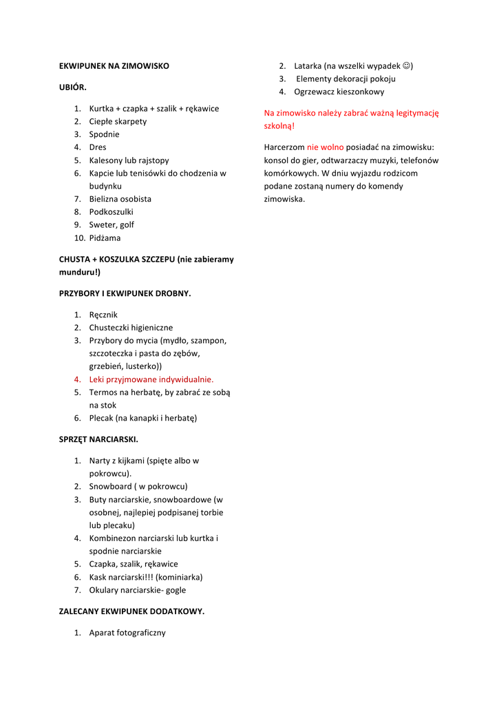 EKWIPUNEK NA ZIMOWISKO UBIÓR. 1. 2. 3. 4. 5. 6. 7. 8. 9. 10. Kurtka + czapka + szalik + rękawice Ciepłe skarpety Spodnie Dres Kalesony lub rajstopy Kapcie lub tenisówki do chodzenia w budynku Bielizna osobista Podkoszulki Sweter, golf Pidżama CHUSTA + KOSZULKA SZCZEPU (nie zabieramy munduru!) PRZYBORY I EKWIPUNEK DROBNY. 1. Ręcznik 2. Chusteczki higieniczne 3. Przybory do mycia (mydło, szampon, szczoteczka i pasta do zębów, grzebień, lusterko)) 4. Leki przyjmowane indywidualnie. 5. Termos na herbatę, by zabrać ze sobą na stok 6. Plecak (na kanapki i herbatę) SPRZĘT NARCIARSKI. 1. Narty z kijkami (spięte albo w pokrowcu). 2. Snowboard ( w pokrowcu) 3. Buty narciarskie, snowboardowe (w osobnej, najlepiej podpisanej torbie lub plecaku) 4. Kombinezon narciarski lub kurtka i spodnie narciarskie 5. Czapka, szalik, rękawice 6. Kask narciarski!!! (kominiarka) 7. Okulary narciarskie-‐ gogle ZALECANY EKWIPUNEK DODATKOWY. 1. Aparat fotograficzny 2. Latarka (na wszelki wypadek J) 3. Elementy dekoracji pokoju 4. Ogrzewacz kieszonkowy Na zimowisko należy zabrać ważną legitymację szkolną! Harcerzom nie wolno posiadać na zimowisku: konsol do gier, odtwarzaczy muzyki, telefonów komórkowych. W dniu wyjazdu rodzicom podane zostaną numery do komendy zimowiska.