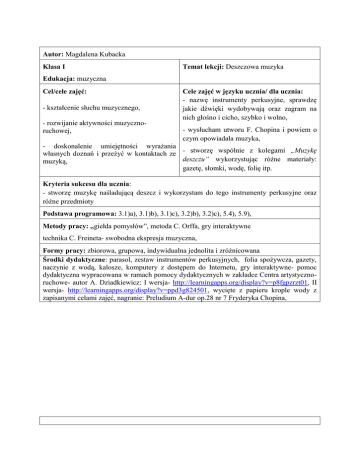 Autor: Magdalena Kubacka Klasa I Temat lekcji: Deszczowa muzyka Edukacja: muzyczna Cel/cele zajęć: - kształcenie słuchu muzycznego, - rozwijanie aktywności muzycznoruchowej, Cele zajęć w języku ucznia/ dla ucznia: - nazwę instrumenty perkusyjne, sprawdzę jakie dźwięki wydobywają oraz zagram na nich głośno i cicho, szybko i wolno, - wysłucham utworu F. Chopina i powiem o czym opowiadała muzyka, - doskonalenie umiejętności wyrażania własnych doznań i przeżyć w kontaktach ze - stworzę wspólnie z kolegami „Muzykę deszczu” wykorzystując różne materiały: muzyką, gazetę, słomki, wodę, folię itp. Kryteria sukcesu dla ucznia: - stworzę muzykę naśladującą deszcz i wykorzystam do tego instrumenty perkusyjne oraz różne przedmioty Podstawa programowa: 3.1)a), 3.1)b), 3.1)c), 3.2)b), 3.2)c), 5.4), 5.9), Metody pracy: „giełda pomysłów”, metoda C. Orffa, gry interaktywne technika C. Freineta- swobodna ekspresja muzyczna, Formy pracy: zbiorowa, grupowa, indywidualna jednolita i zróżnicowana Środki dydaktyczne: parasol, zestaw instrumentów perkusyjnych, folia spożywcza, gazety, naczynie z wodą, kalosze, komputery z dostępem do Internetu, gry interaktywne- pomoc dydaktyczna wypracowana w ramach pomocy dydaktycznych w zakładce Centra artystycznoruchowe- autor A. Dziadkiewicz: I wersja- http://learningapps.org/display?v=p8fgpzrzt01, II wersja- http://learningapps.org/display?v=ppd3g824501, wycięte z papieru krople wody z zapisanymi celami zajęć, nagranie: Preludium A-dur op.28 nr 7 Fryderyka Chopina, Przebieg zajęć Działania uczniów „Drogowskazy” -wskazówki i uwagi o realizacji Centra Aktywnej Edukacji 1. Uczniowie na podstawie zgromadzonych rekwizytów i instrumentów perkusyjnych dochodzą do tematu zajęć „Deszczowa muzyka”. Poznają cele i kryteria sukcesu. Powitanie w kręgu na dywanie. W kole polonistycznoułożone są różne instrumenty perkusyjne, komunikacyjne gazety, folia spożywcza, kalosze, parasol i woda. Zadaniem dzieci jest na ich podstawie wywnioskować, co mają ze sobą wspólnego. 2.Uczniowie nazywają zgromadzone instrumenty perkusyjne. Sprawdzają w jaki sposób i jaki wydobywa się z nich dźwięk. Następnie w dwóch grupach grają wymyślone przez siebie rytmy na instrumentach perkusyjnych. Zabawa muzyczna: „Rozmowa artystyczno-ruchowe instrumentów”- dzieci siadają w dwóch szeregach pod przeciwległymi ścianami. W obu szeregach zostają rozdane takie same instrumenty. Z każdego rodzaju powinna być tylko jedna para (tzn. 2 bębenki, 2 talerze itp.). „Rozmawiać ze sobą będą tylko takie same instrumenty. Wskazane dziecko w jednym szeregu gra w dowolny sposób, a odpowiada mu kolega z przeciwka na takim samym instrumencie. Podsumowanie wypowiedzi dzieci, wybór powtarzających się i wspólne ustalenie co będzie tematem zajęć. Nauczyciel przykleja do parasola krople deszczu na których zapisane są cele zajęć w języku ucznia. Następuje omówienie zadań jakie będą miały dzieci na lekcji oraz ustalenie co będzie kryterium sukcesu. Kolejne grające dzieci- zadające muzyczne pytanie powinny swoje propozycje różnicować zmieniając tempo, rytm czy dynamikę gry. Aby urozmaicić zabawę, nauczyciel może zawiesić w klasie zasłonę oddzielając rzędy grających uczniów. Odpowiadające na instrumencie dziecko będzie się kierowało wyłącznie słuchem. Musi nie tylko zapamiętać charakter improwizacji kolegi, ale również ma poznać bliźniaczy instrument po barwie dźwięku.1 Gra interaktywna – sprawdzenie polonistyczno3. Uczniowie pracując znajomości instrumentów perkusyjnych. komunikacyjne na komputerach dopasowują Uczniowie uruchamiają grę- pomoc instrument perkusyjny dydaktyczną wypracowaną w ramach do słyszanego pomocy dydaktycznych w zakładce Centra dźwięku. artystycznoruchoweautor: A. Dziadkiewicz. I wersjahttp://learningapps.org/display?v=p8fgpzrzt 01 II wersjahttp://learningapps.org/display?v=ppd3g82 4501 Nauczyciel sprawdza na monitorach poprawność wykonanego przez uczniów zadania. Wpisują palcem zamoczonym w naczyniu z wodą pierwszą literę swojego imienia na kropli przyklejonej do parasola potwierdzają osiągnięcie celu. 4. Uczniowie leżą na dywanie i z uwagą słuchają utworu. Gdy muzyka cichnie dzielą się swoimi wrażeniami: określają nastrój i mówią o czym ich zdaniem opowiadała muzyka? Jakie obrazy widziały w wyobraźni podczas słuchania muzyki? Ćwiczenia słuchowe „Deszczowa muzyka" artystyczno-ruchowe - słuchanie Preludium A-dur op.28 nr 7 Fryderyka Chopina. Uczniowie wpisują palcem zamoczonym w naczyniu z wodą pierwszą literę swojego imienia na kolejnej kropli przyklejonej do parasola - potwierdzają osiągnięcie celu. Naśladowanie odgłosów deszczu za pomocą wybranych z kufra różnych instrumentów perkusyjnych. Ustalenie, że deszcz: pada, puka, gra, dzwoni itp. - Wykorzystajcie zgromadzone materiały (wodę w naczyniu, słomki, gazety, folię spożywczą itp.) i zastanówcie się jak je wykorzystać do stworzenia muzyki deszczu? 5. Uczniowie tworzą „Muzykę 1 deszczu” uczniowie tworzą U. Smoczyńska-Nachtman, Muzyka dla dzieci, Wydawnictwa Szkolne i Pedagogiczne, Warszawa 1992, s. 255 grupy„Zespoły muzyków” i wspólnie opracowują „utwór”„Muzyka deszczu” według własnej inwencji twórczej. Skomponowany utwór każda grupa – „zespół muzyków” przedstawia na forum klasy. Występy „zespołów muzyków” odbywać się mogą na dywanie. 6. Dzieci kolejno podsumowują zajęcia kończąc zdanie: „Dziś dowiedziałem się, że…” Po prezentacjach uczniowie wpisują palcem zamoczonym w naczyniu z wodą pierwszą literę swojego imienia na kolejnej kropli przyklejonej do parasola - potwierdzają osiągnięcie celu. polonistycznokomunikacyjne Ewaluacja zajęć- uczniowie zgromadzeni przy parasolu z kroplami deszczu (osiągniętymi celami zajęć) podsumowują zajęcia kończąc zada