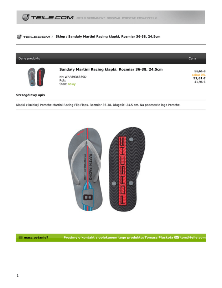 Sklep / Sandały Martini Racing klapki, Rozmiar 36-38, 24,5cm Dane produktu Cena Sandały Martini Racing klapki, Rozmiar 36-38, 24,5cm 51,61 € rabat 0% 51,61 € 41,96 € Nr: WAP8936380D Rok: Stan: nowy Szczegółowy opis Klapki z kolekcji Porsche Martini Racing Flip Flops. Rozmiar 36-38. Długość: 24,5 cm. Na podeszwie logo Porsche. masz pytanie? 1 Prosimy o kontakt z opiekunem tego produktu: Tomasz Pluskota [email protected] 2