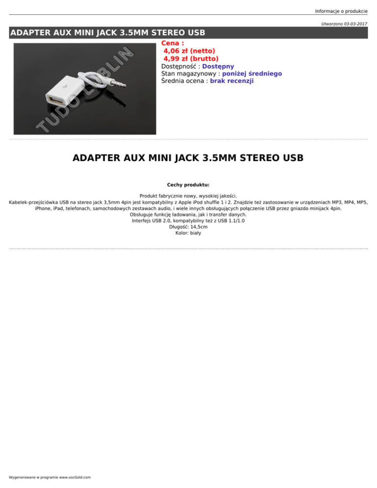 Informacje o produkcie Utworzono 03-03-2017 ADAPTER AUX MINI JACK 3.5MM STEREO USB Cena : 4,06 zł (netto) 4,99 zł (brutto) Dostępność : Dostępny Stan magazynowy : poniżej średniego Średnia ocena : brak recenzji ADAPTER AUX MINI JACK 3.5MM STEREO USB Cechy produktu: Produkt fabrycznie nowy, wysokiej jakości. Kabelek-przejściówka USB na stereo jack 3,5mm 4pin jest kompatybilny z Apple iPod shuffle 1 i 2. Znajdzie też zastosowanie w urządzeniach MP3, MP4, MP5, iPhone, iPad, telefonach, samochodowych zestawach audio, i wiele innych obsługujących połączenie USB przez gniazdo minijack 4pin. Obsługuje funkcję ładowania, jak i transfer danych. Interfejs USB 2.0, kompatybilny też z USB 1.1/1.0 Długość: 14,5cm Kolor: biały Wygenerowano w programie www.oscGold.com