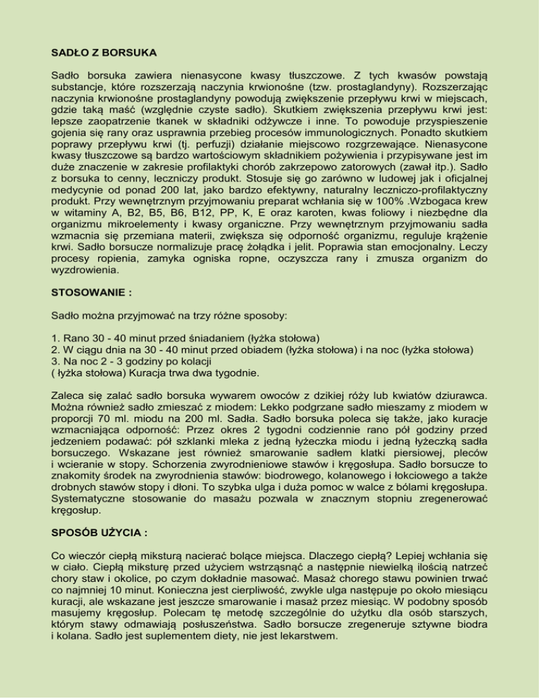 SADŁO Z BORSUKA Sadło borsuka zawiera nienasycone kwasy tłuszczowe. Z tych kwasów powstają substancje, które rozszerzają naczynia krwionośne (tzw. prostaglandyny). Rozszerzając naczynia krwionośne prostaglandyny powodują zwiększenie przepływu krwi w miejscach, gdzie taką maść (względnie czyste sadło). Skutkiem zwiększenia przepływu krwi jest: lepsze zaopatrzenie tkanek w składniki odżywcze i inne. To powoduje przyspieszenie gojenia się rany oraz usprawnia przebieg procesów immunologicznych. Ponadto skutkiem poprawy przepływu krwi (tj. perfuzji) działanie miejscowo rozgrzewające. Nienasycone kwasy tłuszczowe są bardzo wartościowym składnikiem pożywienia i przypisywane jest im duże znaczenie w zakresie profilaktyki chorób zakrzepowo zatorowych (zawał itp.). Sadło z borsuka to cenny, leczniczy produkt. Stosuje się go zarówno w ludowej jak i oficjalnej medycynie od ponad 200 lat, jako bardzo efektywny, naturalny leczniczo-profilaktyczny produkt. Przy wewnętrznym przyjmowaniu preparat wchłania się w 100% .Wzbogaca krew w witaminy A, B2, B5, B6, B12, PP, K, E oraz karoten, kwas foliowy i niezbędne dla organizmu mikroelementy i kwasy organiczne. Przy wewnętrznym przyjmowaniu sadła wzmacnia się przemiana materii, zwiększa się odporność organizmu, reguluje krążenie krwi. Sadło borsucze normalizuje pracę żołądka i jelit. Poprawia stan emocjonalny. Leczy procesy ropienia, zamyka ogniska ropne, oczyszcza rany i zmusza organizm do wyzdrowienia. STOSOWANIE : Sadło można przyjmować na trzy różne sposoby: 1. Rano 30 - 40 minut przed śniadaniem (łyżka stołowa) 2. W ciągu dnia na 30 - 40 minut przed obiadem (łyżka stołowa) i na noc (łyżka stołowa) 3. Na noc 2 - 3 godziny po kolacji ( łyżka stołowa) Kuracja trwa dwa tygodnie. Zaleca się zalać sadło borsuka wywarem owoców z dzikiej róży lub kwiatów dziurawca. Można również sadło zmieszać z miodem: Lekko podgrzane sadło mieszamy z miodem w proporcji 70 ml. miodu na 200 ml. Sadła. Sadło borsuka poleca się także, jako kuracje wzmacniająca odporność: Przez okres 2 tygodni codziennie rano pół godziny przed jedzeniem podawać: pół szklanki mleka z jedną łyżeczka miodu i jedną łyżeczką sadła borsuczego. Wskazane jest również smarowanie sadłem klatki piersiowej, pleców i wcieranie w stopy. Schorzenia zwyrodnieniowe stawów i kręgosłupa. Sadło borsucze to znakomity środek na zwyrodnienia stawów: biodrowego, kolanowego i łokciowego a także drobnych stawów stopy i dłoni. To szybka ulga i duża pomoc w walce z bólami kręgosłupa. Systematyczne stosowanie do masażu pozwala w znacznym stopniu zregenerować kręgosłup. SPOSÓB UŻYCIA : Co wieczór ciepłą miksturą nacierać bolące miejsca. Dlaczego ciepłą? Lepiej wchłania się w ciało. Ciepłą miksturę przed użyciem wstrząsnąć a następnie niewielką ilością natrzeć chory staw i okolice, po czym dokładnie masować. Masaż chorego stawu powinien trwać co najmniej 10 minut. Konieczna jest cierpliwość, zwykle ulga następuje po około miesiącu kuracji, ale wskazane jest jeszcze smarowanie i masaż przez miesiąc. W podobny sposób masujemy kręgosłup. Polecam tę metodę szczególnie do użytku dla osób starszych, którym stawy odmawiają posłuszeństwa. Sadło borsucze zregeneruje sztywne biodra i kolana. Sadło jest suplementem diety, nie jest lekarstwem.