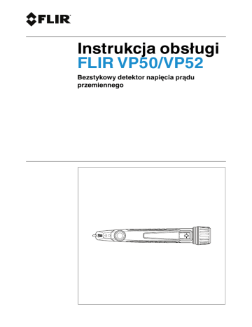 Instrukcja obsługi FLIR VP50/VP52 Bezstykowy detektor napięcia prądu przemiennego Instrukcja obsługi FLIR VP50/VP52 #T559851; r. AG/ 10076/10076; pl-PL Spis treści 1 Zastrzeżenia. . . . . . . . . . . . . . . . . . . . . . . . . . . . . . . . . . . . . . . . . . . . . . . . . . . . . . . . . . . . . 1 1.1 Prawa autorskie. . . . . . . . . . . . . . . . . . . . . . . . . . . . . . . . . . . . . . . . . . . . . . . . 1 1.2 Zarządzanie jakością . . . . . . . . . . . . . . . . . . . . . . . . . . . . . . . . . . . . . . . . . . 1 1.3 Aktualizacje dokumentacji. . . . . . . . . . . . . . . . . . . . . . . . . . . . . . . . . . . . . 1 1.4 Utylizacja odpadów elektronicznych . . . . . . . . . . . . . . . . . . . . . . . . . . 1 2 Informacje dotyczące bezpieczeństwa. . . . . . . . . . . . . . . . . . . . . . . . . . . . . . . 2 3 Wprowadzenie . . . . . . . . . . . . . . . . . . . . . . . . . . . . . . . . . . . . . . . . . . . . . . . . . . . . . . . . . . 6 4 Opis . . . . . . . . . . . . . . . . . . . . . . . . . . . . . . . . . . . . . . . . . . . . . . . . . . . . . . . . . . . . . . . . . . . . . . 7 4.1 Elementy miernika . . . . . . . . . . . . . . . . . . . . . . . . . . . . . . . . . . . . . . . . . . . . . 7 5 Obsługa. . . . . . . . . . . . . . . . . . . . . . . . . . . . . . . . . . . . . . . . . . . . . . . . . . . . . . . . . . . . . . . . . . 8 5.1 Tryby . . . . . . . . . . . . . . . . . . . . . . . . . . . . . . . . . . . . . . . . . . . . . . . . . . . . . . . . . . . 9 5.2 Podstawowe zasady obsługi . . . . . . . . . . . . . . . . . . . . . . . . . . . . . . . . . . 9 5.3 Lampka robocza . . . . . . . . . . . . . . . . . . . . . . . . . . . . . . . . . . . . . . . . . . . . . .10 5.4 Wskazanie niskiego poziomu naładowania akumulatora . . . . . . . . . . . . . . . . . . . . . . . . . . . . . . . . . . . . . . . . . . . . . . . . . . 10 5.5 Automatyczne wyłączanie zasilania . . . . . . . . . . . . . . . . . . . . . . . . .10 6 Konserwacja . . . . . . . . . . . . . . . . . . . . . . . . . . . . . . . . . . . . . . . . . . . . . . . . . . . . . . . . . . .11 6.1 Czyszczenie i przechowywanie . . . . . . . . . . . . . . . . . . . . . . . . . . . . . .11 6.2 Wymiana baterii . . . . . . . . . . . . . . . . . . . . . . . . . . . . . . . . . . . . . . . . . . . . . .11 7 Dane techniczne . . . . . . . . . . . . . . . . . . . . . . . . . . . . . . . . . . . . . . . . . . . . . . . . . . . . . . .12 7.1 Parametry urządzenia . . . . . . . . . . . . . . . . . . . . . . . . . . . . . . . . . . . . . . . .12 7.2 Środowisko pracy. . . . . . . . . . . . . . . . . . . . . . . . . . . . . . . . . . . . . . . . . . . . .12 8 Pomoc techniczna . . . . . . . . . . . . . . . . . . . . . . . . . . . . . . . . . . . . . . . . . . . . . . . . . . . . .13 9 Ograniczona gwarancja wieczysta firmy FLIR . . . . . . . . . . . . . . . . . . . . .14 #T559851; r. AG/ 10076/10076; pl-PL v 1 Zastrzeżenia 1.1 Prawa autorskie © 2013, FLIR Systems, Inc.. Wszelkie prawa zastrzeżone na całym świecie. Żadna część oprogramowania, w tym kod źródłowy, nie może być powielana, przesyłana, poddawana transkrypcji ani tłumaczona na jakikolwiek język lub język programowania w jakiejkolwiek postaci, przy zastosowaniu jakichkolwiek środków, elektronicznych, optycznych, ręcznie lub w inny sposób, bez uprzedniej pisemnej zgodny firmy FLIR Systems. Dokumentacji nie wolno kopiować, kserować, powielać, tłumaczyć ani przekształcać do postaci elektronicznej lub maszynowej bez uprzedniej pisemnej zgody firmy FLIR Systems. Aby uzyskać dostęp do najnowszych wersji instrukcji obsługi i najnowszych powiadomień, należy przejść do karty Downloadna stronie: http://support.flir.com Rejestracja online trwa kilka minut. Wśród plików do pobrania można znaleźć także najnowsze wersje instrukcji obsługi innych naszych produktów oraz instrukcje obsługi starszych produktów. 1.4 Utylizacja odpadów elektronicznych Nazwy i oznaczenia umieszczone na produktach są zastrzeżonymi znakami towarowymi lub znakami towarowymi firmy FLIR Systems i/lub jej spółek zależnych. Wszelkie inne znaki towarowe, nazwy handlowe i nazwy firm są używane w niniejszej publikacji wyłącznie w celu identyfikacji i stanowią własność odpowiednich właścicieli. 1.2 Zarządzanie jakością System zarządzania jakością, w ramach którego zostały zaprojektowane i wytworzone niniejsze produkty, uzyskał certyfikat zgodności z normą ISO 9001. Firma FLIR Systems kieruje się strategią nieustannego rozwoju, w związku z czym zastrzega sobie prawo do wprowadzania zmian i udoskonaleń w dowolnym z opisywanych produktów bez uprzedniego powiadomienia. Podobnie jak większość produktów elektronicznych także to urządzenie musi zostać zutylizowane w sposób przyjazny dla środowiska naturalnego i zgodnie z obowiązującymi przepisami dotyczącymi odpadów elektronicznych. Więcej szczegółów można uzyskać od przedstawicieli firmy FLIR Systems. 1.3 Aktualizacje dokumentacji Instrukcje obsługi są aktualizowane kilka razy do roku, a ponadto regularnie publikowane są ważne powiadomienia dotyczące produktów oraz informacje o zmianach. #T559851; r. AG/ 10076/10076; pl-PL 1 2 Informacje dotyczące bezpieczeństwa UWAGA Przed rozpoczęciem korzystania z urządzenia należy koniecznie zapoznać się ze wszystkimi instrukcjami, ostrzeżeniami, przestrogami i uwagami. Zawsze postępować zgodnie z zaleceniami tam zawartymi. UWAGA Firma FLIR Systems zastrzega sobie prawo do wycofywania modeli, części, akcesoriów i innych elementów z oferty oraz do zmiany specyfikacji w dowolnym momencie, bez uprzedniego powiadomienia. UWAGA Nie próbuj naprawiać urządzenia. Nie ma ono żadnych części podlegających serwisowaniu w warunkach domowych. UWAGA Jeśli urządzenie nie będzie używane przez dłuższy czas, należy wyjąć z niego baterie. UWAGA Elektryczność statyczna jak i inne przypadkowe źródła energii mogą loso