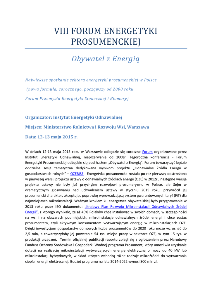 VIII FORUM ENERGETYKI PROSUMENCKIEJ