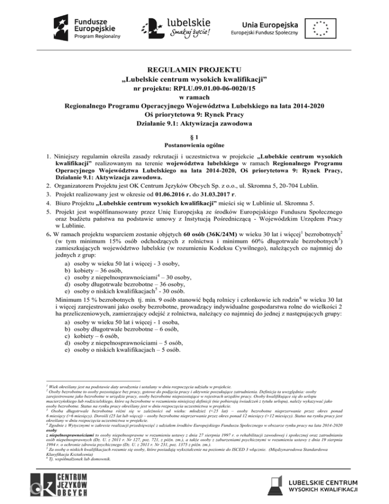 REGULAMIN PROJEKTU „Lubelskie centrum wysokich kwalifikacji” nr projektu: RPLU.09.01.00-06-0020/15 w ramach Regionalnego Programu Operacyjnego Województwa Lubelskiego na lata 2014-2020 Oś priorytetowa 9: Rynek Pracy Działanie 9.1: Aktywizacja zawodowa §1 Postanowienia ogólne 1. Niniejszy regulamin określa zasady rekrutacji i uczestnictwa w projekcie „Lubelskie centrum wysokich kwalifikacji” realizowanym na terenie województwa lubelskiego w ramach Regionalnego Programu Operacyjnego Województwa Lubelskiego na lata 2014-2020, Oś priorytetowa 9: Rynek Pracy, Działanie 9.1: Aktywizacja zawodowa. 2. Organizatorem Projektu jest OK Centrum Języków Obcych Sp. z o.o., ul. Skromna 5, 20-704 Lublin. 3. Projekt realizowany jest w okresie od 01.06.2016 r. do 31.03.2017 r. 4. Biuro Projektu „Lubelskie centrum wysokich kwalifikacji” mieści się w Lublinie ul. Skromna 5. 5. Projekt jest współfinansowany przez Unię Europejską ze środków Europejskiego Funduszu Społecznego oraz budżetu państwa na podstawie umowy z Instytucją Pośredniczącą - Wojewódzkim Urzędem Pracy w Lublinie. 6. W ramach projektu wsparciem zostanie objętych 60 osób (36K/24M) w wieku 30 lat i więcej1 bezrobotnych2 (w tym minimum 15% osób odchodzących z rolnictwa i minimum 60% długotrwale bezrobotnych 3) zamieszkujących województwo lubelskie (w rozumieniu Kodeksu Cywilnego), należących co najmniej do jednych z grup: a) osoby w wieku 50 lat i więcej - 3 osoby, b) kobiety – 36 osób, c) osoby z niepełnosprawnościami4 – 30 osoby, d) osoby długotrwale bezrobotne – 36 osoby, e) osoby o niskich kwalifikacjach5 - 30 osób. Minimum 15 % bezrobotnych tj. min. 9 osób stanowić będą rolnicy i członkowie ich rodzin 6 w wieku 30 lat i więcej zarejestrowani jako osoby bezrobotne, prowadzący indywidualne gospodarstwa rolne do wielkości 2 ha przeliczeniowych, zamierzający odejść z rolnictwa, należący co najmniej do jednej z następujących grupy: a) osoby w wieku 50 lat i więcej - 1 osoba, b) osoby długotrwale bezrobotne – 6 osób, c) kobiety – 6 osób, d) osoby z niepełnosprawnościami – 5 osób, e) osoby o niskich kwalifikacjach – 5 osób. Wiek określany jest na podstawie daty urodzenia i ustalany w dniu rozpoczęcia udziału w projekcie. Osoby bezrobotne to osoby pozostające bez pracy, gotowe do podjęcia pracy i aktywnie poszukujące zatrudnienia. Definicja ta uwzględnia: osoby zarejestrowane jako bezrobotne w urzędzie pracy, osoby bezrobotne niepozostające w rejestrach urzędów pracy. Osoby kwalifikujące się do urlopu macierzyńskiego lub rodzicielskiego, które są bezrobotne w rozumieniu niniejszej definicji (nie pobierają świadczeń z tytułu urlopu), należy wykazywać jako osoby bezrobotne. Status na rynku pracy określany jest w dniu rozpoczęcia uczestnictwa w projekcie. 3 Osoba długotrwale bezrobotna różni się w zależności od wieku: młodzież (<25 lat) – osoby bezrobotne nieprzerwanie przez okres ponad 6 miesięcy (>6 miesięcy). Dorośli (25 lat lub więcej) – osoby bezrobotne nieprzerwanie przez okres ponad 12 miesięcy (>12 miesięcy). Status na rynku pracy jest określany w dniu rozpoczęcia uczestnictwa w projekcie. 4 Zgodnie z Wytycznymi w zakresie realizacji przedsięwzięć z udziałem środków Europejskiego Funduszu Społecznego w obszarze rynku pracy na lata 2014-2020 osoby z niepełnosprawnościami to osoby niepełnosprawne w rozumieniu ustawy z dnia 27 sierpnia 1997 r. o rehabilitacji zawodowej i społecznej oraz zatrudnianiu osób niepełnosprawnych (Dz. U. z 2011 r. Nr 127, poz. 721, z późn. zm.), a także osoby z zaburzeniami psychicznymi w rozumieniu ustawy z dnia 19 sierpnia 1994 r. o ochronie zdrowia psychicznego (Dz. U. z 2011 r. Nr 231, poz. 1375 z późn. zm.). 5 Za osobę o niskich kwalifikacjach rozumie się osoby, które posiadają wykształcenie na poziomie do ISCED 3 włącznie. (Międzynarodowa Standardowa Klasyfikacja Kształcenia) 6 Tj. współmałżonek lub domownik. 1 2 W przypadku osób bezrobotnych zarejestrowanych w urzędzie pracy wsparcie skierowane jest do osób które należą do I lub II profilu pomocy7 (tzw. bezrobotni aktywni) lub (tzw. wymagający wsparcia) w rozumieniu art. 33 ustawy z dnia 20 kwietnia 2004 r. o promocji zatrudnienia i instytucjach rynku pracy. §2 Rekrutacja do projektu. I. Informacje ogólne. 1. Rekrutacja prowadzona będzie zgodnie z zasadą równości szans płci i niedyskryminacji. 2. Rekrutacja będzie otwarta, prowadzona na terenie województwa lubelskiego w trybie ciągłym od 01.06.2016 r. do 31.08.2016 r. 3. Dokumenty wymagane od kandydatów na Uczestnika Projektu w procesie rekrutacji: a) Formularz zgłoszeniowy, b) Oświadczenie o statusie na rynku pracy, c) Urzędowe zaświadczenie o pozostawaniu w rejestrze osób bezrobotnych wraz z okresem pozostawania w rejestrze -w odniesieniu do osób o statusie osoby bezrobotnej i długotrwale bezrobotnej (warunek konieczny) i/lub z informacją o zakwalifikowaniu do I lub II profilu pomocy (opcjonalnie). d) Orzeczenie o niepełnosprawności lub inny dokument poświadczający stan zdrowia Kandydata potwierdzający przynależność do grupy osób niepełnosprawnych (w przypadku osób niepełnosprawnych), e) Zobowiązanie Uczestnika Projektu do przekazania informacji na temat jej/jego sytuacji po opuszczeniu projektu f) Oświadczenie o posiadaniu gospodarstwa rolnego poniżej 2 ha przeliczeniowych i zamiarze odejścia z rolnictwa. II. Kryteria uczestnictwa w projekcie 1. Profil Uczestnika Projektu: Projekt skierowany jest do 60 osób (36K/24M) w wieku 30 lat i więcej, bezrobotnych (w tym minimum 15% osób odchodzących z rolnictwa i minimum 60% długotrwale bezrobotnych) zamieszkujących województwo lubelskie (w rozumieniu Kodeksu Cywilnego). Priorytetowo do projektu kwalifikowane będą osoby niepełnosprawne, osoby długotrwale bezrobotne, osoby zamieszkujące podregion bialski, chełmsko-zamojski i puławski osoby o niskim wy