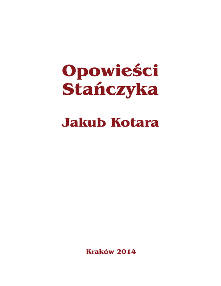 Opowiesci Stanczyka Jakub Kotara Kraków 2014 I miejsce w Konkursie Literackim Autorem tekstu jest Jakub Kotara, uczeń klasy IV ze Szkoły Podstawowej nr 162 w Krakowie. W XVI wieku na dworze króla Zygmunta I Starego i jego małżonki, królowej Bony, a potem ich syna króla Zygmunta II Augusta, mieszkało wiele wybitnych osobistości. Opowiem wam o niezwykłych wydarzeniach towarzyszących dworskiemu życiu. Mam nadzieję, że zechcecie posłuchać opowieści Stańczyka – nadwornego błazna, którego zadanie polegało na zabawianiu dworu i pary królewskiej. Nie byłem zwyczajnym żartownisiem. Powiadano, że wyróżniałem się nieprzeciętną inteligencją, dowcipem, znajomością spraw politycznych i odwagą w głoszeniu swoich opinii. Znano również mój cięty język. W dosadny, ale i żartobliwy sposób potrafiłem powiedzieć kilka słów gorzkiej prawdy, na uwadze jednak zawsze miałem dobro kraju. 1 B ył rok 1533, kiedy to król Zygmunt Stary otrzymał w prezencie ogromnego niedźwiedzia z Litwy. Przywieziono go w skrzyni. Cały dwór wraz z królem i królową udali się do Niepołomic, w których urządzono wielkie łowy. Towarzyszyłem im również ja i zastanawiałem się cóż jest zabawnego w polowaniu na wcześniej złapanego i uwięzionego zwierza. Śmiałem się z dworzan i wszystkich uzbrojonych po zęby uczestników, którzy już uważali się za bohaterów, choć biedne zwierzę nadal siedziało w skrzyni. Patrzę na tych, pożal się Boże, śmiałków i oczom nie wierzę. Jak to się puszą, jak przechwalają. – Ho, ho! A to się niedźwiedź wystraszy, kiedy takie groźne miny zobaczy – powiedziałem. – A może już i skórę niedźwiedzia sobie między siebie rozdzieliliście. – A ty nie szykujesz się do polowania ? – krzyknął jeden ze śmiałków. – Pewnie tchórz cię obleciał. – Nie wiem, kto jest większym tchórzem! Ten, który walki w bezsensownej sprawie unika, czy ten, który błaznuje i udaje bohatera, aby się królowi przypodobać. Nie w smak dworzanom były moje słowa. Większość z nich często nadskakiwała naszemu władcy. Wkrótce rozpoczęły się łowy. Wypuszczono niedźwiedzia i liczną gromadę szczujących go psów. Rozjuszone zwierze poraniło około stu zwierząt. Przyglądałem się całemu zamieszaniu i nagle stanąłem przerażony. Niedźwiedź ruszył w kierunku konia, na którym siedziała ciężarna królową. Już wcześniej przyszło mi na myśl, że królowa chyba postradała rozum, przyłączając się w takim stanie do wyprawy. Polska potrzebuje następcy tronu. Swoje kaprysy powinna odłożyć na później. – Jaśnie Pani powinna się otaczać maleńkimi, milutkimi zwierzątkami, a nie biegać za dzikim wściekłym zwierzęciem. Gdzież jest król, który potrafi zadbać o bezpieczeństwo swojego potomka, a tym samym przyszłość ojczyzny. Króla nam odważnego potrzeba, co się nie tylko swoim wrogom, ale i żonie postawić potrafi – zawołałem. 2 Machnął tylko Jaśnie Pan na mnie swą królewską dłonią, jakby opędzał się od natrętnej muchy. Choć raz mógłby posłuchać czyjegoś rozumu, jak o własnym zapomniał. Mówiłem tak, ponieważ wiedziałem, że królowa kochała łowy i potrafiła postawić na swoim. Nie podobało mi się, że król uległ prośbom żony, zamiast postępować rozsądnie. Niedźwiedź zaatakował i stało się to czego się obawiałem. Wystraszony koń zrzucił królową i wkrótce poroniła. Sam musiałem ratować się przed zwierzęciem, przez co stałem się obiektem śmiechu. Rozzłoszczony całą sytuacją śmiało powiedziałem: – Największym głupcem nie jest ten, który życie ucieczką ratuje, ale ten, który mając niebezpiecznego zwierza w klatce wypuszcza go, aby bestia jemu i jego bliskim krzywdę uczyniła. Jednak moją głowę zajmowały nie tylko ważne, państwowe sprawy. Kochałem psocić i miałem do tego prawdziwy talent. P ewnego zimowego poranka, a był to piękny śnieżny dzień, wstałem we wspaniałym humorze i wielką ochotą do żartów. Z ognikami w oczach, ubrałem się szybko w swój czerwony strój, założyłem na głowę czapkę z dzwoneczkami i wyszedłem na dwór. Już od kilku dni planowałem zakpić z kochliwości dwórek królowej Bony. Śmieszyło mnie ich zachowanie. Za każdym razem, kiedy spotykały na dworze jakiegoś muzykanta, przymilały się, chichotały i trzepotały zalotnie rzęsami. Czasem nawet udawały omdlenie, tylko po to, aby zwrócić na siebie jego uwagę. Nie raz droczyłem się z dziewczętami i wyśmiewałem ich zachowanie, one jednak twierdziły, że to wszystko z miłości do muzyki. Długo zastanawiałem się, jaki dowcip dotrze do młodych panienek, a przy okazji ubawi króla Zygmunta i wytworną królową Bonę. W końcu nadszedł ten dzień. – A to im psikusa sprawię. Przestaną dziewczątka wywracać oczkami na widok grajków – pomyślałem. Udałem się do wielkiej, bogato zdobionej komnaty, pełnej dworzan, paziów i dwórek. 3 Odważnie, gromkim głosem ogłosiłem: – Dziś rano odkryłem w sobie muzyczny talent. Wiem, jak drogie panny kochają muzykę i wspaniałomyślnie dziś dla was zagram. – Przecież ty nawet na fujarce nie zagrasz! – krzyknęła jedna z dwórek królowej. – Wieczorem dam wam pokaz mojego kunsztu muzycznego – odpowiedziałem, zadzierając wysoko brodę, aby dać do zrozumienia jak bardzo jestem pewny swego. – Życzymy ci powodzenia – odpowiedziała zarozumiale. – Wszyscy będziemy na twoim występie. Wykręciłem się na pięcie i wyszedłem, pozostawiając chichoczące się młódki. W południe, kiedy przechadzałem się po mieście, zobaczyłem przystojnego muzykanta, którego nie raz widywałem na dworze wśród dwórek. – Czy zechciałbyś wziąć udział w pewnym dziwnym przedstawieniu? – zapytałem. – Zapłacę ci za to dukata. Opowiedziałem mu na ucho mój plan, a ten uśmiechnął się i odparł tajemniczo: – Ależ oczywi