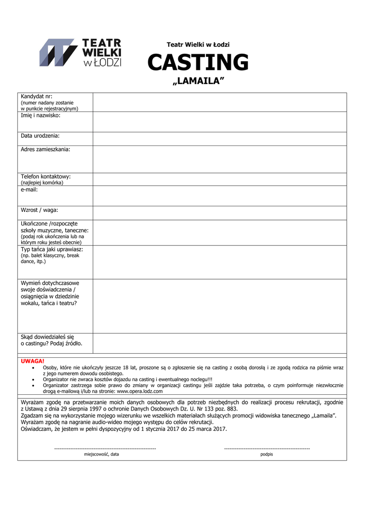 Teatr Wielki w Łodzi CASTING „LAMAILA” Kandydat nr: (numer nadany zostanie w punkcie rejestracyjnym) Imię i nazwisko: Data urodzenia: Adres zamieszkania: Telefon kontaktowy: (najlepiej komórka) e-mail: Wzrost / waga: Ukończone /rozpoczęte szkoły muzyczne, taneczne: (podaj rok ukończenia lub na którym roku jesteś obecnie) Typ tańca jaki uprawiasz: (np. balet klasyczny, break dance, itp.) Wymień dotychczasowe swoje doświadczenia / osiągnięcia w dziedzinie wokalu, tańca i teatru? Skąd dowiedziałeś się o castingu? Podaj źródło. UWAGA! Osoby, które nie ukończyły jeszcze 18 lat, proszone są o zgłoszenie się na casting z osobą dorosłą i ze zgodą rodzica na piśmie wraz z jego numerem dowodu osobistego. Organizator nie zwraca kosztów dojazdu na casting i ewentualnego noclegu!!! Organizator zastrzega sobie prawo do zmiany w organizacji castingu jeśli zajdzie taka potrzeba, o czym poinformuje niezwłocznie drogą e-mailową i/lub na stronie: www.opera.lodz.com Wyrażam zgodę na przetwarzanie moich danych osobowych dla potrzeb niezbędnych do realizacji procesu rekrutacji, zgodnie z Ustawą z dnia 29 sierpnia 1997 o ochronie Danych Osobowych Dz. U. Nr 133 poz. 883. Zgadzam się na wykorzystanie mojego wizerunku we wszelkich materiałach służących promocji widowiska tanecznego „Lamaila”. Wyrażam zgodę na nagranie audio-wideo mojego występu do celów rekrutacji. Oświadczam, że jestem w pełni dyspozycyjny od 1 stycznia 2017 do 25 marca 2017. --------------------------------------------------------miejscowość, data -----------------------------------------------podpis