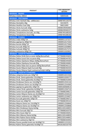 PRODUKT WHISKAS - MLEKO Whiskas mleko 200ml WHISKAS - PRZYSMAKI Whiskas Anti-Hairball 50g - odkłaczacz Whiskas Dentabits 40g Whiskas Healthy Coat 50g Whiskas Sticks kurczak 3x6g Whiskas Sticks wołowina 3x6g Whiskas Temptations kurczak, ser 60g Whiskas Temptations łosoś 60g WHISKAS - PUSZKA Whiskas indyk 400g*24 Whiskas jagnięcina 400g*24 Whiskas kaczka 400g*24 Whiskas kurczak 400g*24 Whiskas tuńczyk 400g*24 Whiskas wołowina 400g*24 WHISKAS - SASZETKI PREMIUM Whiskas Delice Drób Got.w sosie 4x85g BonusPack Whiskas Delice Łosoś Got.na parze 85g Whiskas Delice Opiekane Mięsa 4x85g BonusPack Whiskas Delice Opiekany Kurczak 85g Whiskas Delice Ryba Got.na parze 4x85g BonusPack Whiskas Gusto Mięsne Kąski kurczak 85g Whiskas Gusto Mięsne Kąski wołowina/indyk 4x85g WHISKAS - SASZETKI STANDARD Whiskas cielęcina krem.sos 100g*24 Whiskas Drob. Dania galaretka 12x100g*4 Whiskas Drob. Dania galaretka 4x100g*13 Whiskas Drobiowe Dania sos 12x100g*4 Whiskas Drobiowe Dania sos 4x100g*13 Whiskas jagnięcina galaretka 100g*24 Whiskas Junior Drob. galaretka 4x100g*13 Whiskas Junior kurczak galaretka 100g*24 Whiskas Junior Mięsne Dania sos 4x100g*13 Whiskas Junior wołowina sos 100g*24 Whiskas kurczak galaretka 100g*24 Whiskas łosoś sos 100g*24 Whiskas Mięsne Dania sos 12x100g*4 Whiskas Mięsne Dania sos 4x100g*13 Whiskas Mini Drobiowe Dania 6x50g Whiskas Mini kurczak 50g*22 Whiskas Mini łosoś 50g*22 Whiskas Mini Miesne Dania 6x50g Whiskas Mini Rybne Dania 6x50g Whiskas Mini wołowina 50g*22 Whiskas Pyszny posiłek krem.sos 4x100g*13 Whiskas Rybne Dania galaretka 4x100g*13 KOD KRESKOWY SZTUKA 50045426 5998749116579 50159475 96011003 4008429046483 4008429046537 5998749108550 5998749108536 5900951137327 5900951017544 5900951017506 5900951020889 5900951017575 5900951020902 4770608245603 4770608244705 4770608244569 4770608244682 4770608246112 4770608246334 4770608246365 5900951021558 5900951026577 4770608241049 5900951254116 5900951254369 5000166060813 5900951256714 4770608239817 5900951254413 5900951253607 4770608239671 4770608239152 5900951256844 5900951256868 8001220144835 4770608250379 4770608250645 8001220144859 8001220144842 4770608250393 5900951121531 8410136216770 Whiskas Senior Drob. galaretka 4x100g*13 Whiskas Senior jagnię. galaretka 100g*24 Whiskas wołowina sos 100g*24 WHISKAS - SUCHA KARMA Whiskas Adult kurczak 300g*14 Whiskas Adult Kurczak 6*1.4kg + Gratis Whiskas Adult Tuńczyk 6*1.4kg + Gratis Whiskas Adult wołowina 300g*14 Whiskas Adult Wołowina 5*800g+Gratis Whiskas Adult Wołowina 6*1.4kg + Gratis Whiskas Indoor Kurczak 5*800g + Gratis Whiskas Junior kurczak 300g*14 Whiskas Junior kurczak 5*800g+Gratis Whiskas Senior Kurczak 5*800g + Gratis Whiskas Steril Kurczak 6*1.4kg + Gratis Whiskas Steril Łosoś 5*800g + Gratis Whiskas Sterile kurczak 300g*14 5900951254222 3065890128439 4770608239138 5900951014055 5900951259142 5900951259166 5900951014031 5900951259098 5900951259111 5900951259289 5900951014079 5900951259449 5900951259470 5900951259180 5900951259364 5900951259302