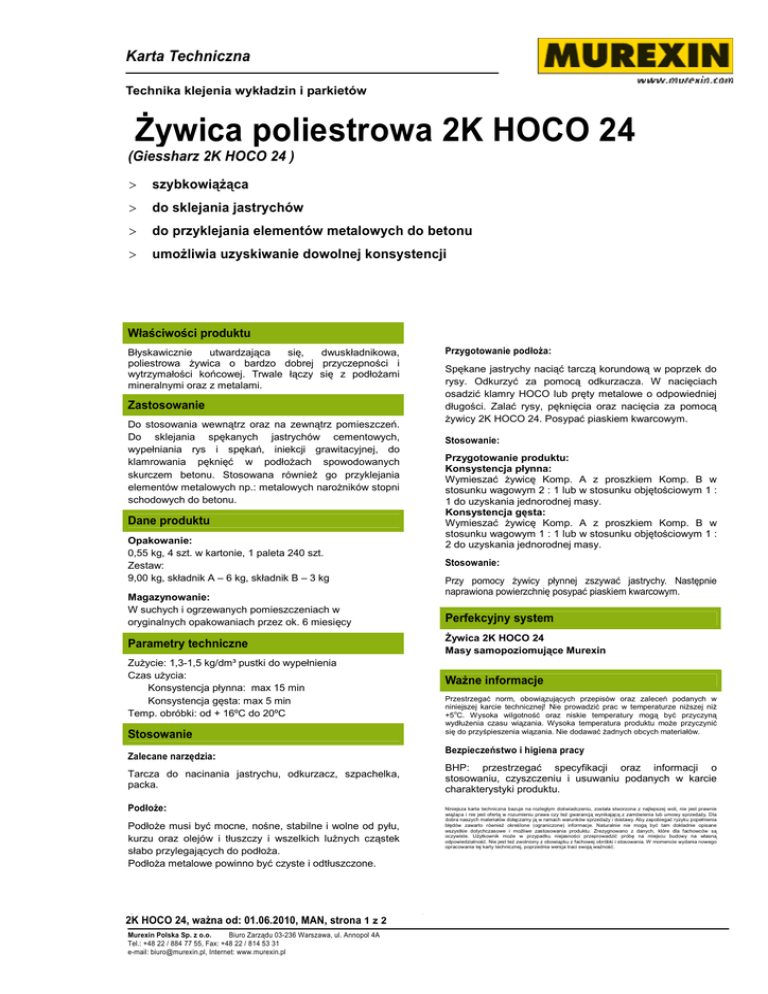 Karta Techniczna Technika wykładzin i parkietów 2K HOCOklejenia 24 Żywica poliestrowa 2K HOCO 24 (Giessharz 2K HOCO 24 ) > szybkowiążąca > do sklejania jastrychów > do przyklejania elementów metalowych do betonu > umożliwia uzyskiwanie dowolnej konsystencji Właściwości produktu Przygotowanie podłoża: Błyskawicznie utwardzająca się, dwuskładnikowa, poliestrowa żywica o bardzo dobrej przyczepności i wytrzymałości końcowej. Trwale łączy się z podłożami mineralnymi oraz z metalami. Spękane jastrychy naciąć tarczą korundową w poprzek do rysy. Odkurzyć za pomocą odkurzacza. W nacięciach osadzić klamry HOCO lub pręty metalowe o odpowiedniej długości. Zalać rysy, pęknięcia oraz nacięcia za pomocą żywicy 2K HOCO 24. Posypać piaskiem kwarcowym. Zastosowanie Do stosowania wewnątrz oraz na zewnątrz pomieszczeń. Do sklejania spękanych jastrychów cementowych, wypełniania rys i spękań, iniekcji grawitacyjnej, do klamrowania pęknięć w podłożach spowodowanych skurczem betonu. Stosowana również go przyklejania elementów metalowych np.: metalowych narożników stopni schodowych do betonu. Stosowanie: Przygotowanie produktu: Konsystencja płynna: Wymieszać żywicę Komp. A z proszkiem Komp. B w stosunku wagowym 2 : 1 lub w stosunku objętościowym 1 : 1 do uzyskania jednorodnej masy. Konsystencja gęsta: Wymieszać żywicę Komp. A z proszkiem Komp. B w stosunku wagowym 1 : 1 lub w stosunku objętościowym 1 : 2 do uzyskania jednorodnej masy. Dane produktu Opakowanie: 0,55 kg, 4 szt. w kartonie, 1 paleta 240 szt. Zestaw: 9,00 kg, składnik A – 6 kg, składnik B – 3 kg Stosowanie: Przy pomocy żywicy płynnej zszywać jastrychy. Następnie naprawiona powierzchnię posypać piaskiem kwarcowym. Magazynowanie: W suchych i ogrzewanych pomieszczeniach w oryginalnych opakowaniach przez ok. 6 miesięcy Perfekcyjny system Żywica 2K HOCO 24 Masy samopoziomujące Murexin Parametry techniczne Zużycie: 1,3-1,5 kg/dm³ pustki do wypełnienia Czas użycia: Konsystencja płynna: max 15 min Konsystencja gęsta: max 5 min Temp. obróbki: od + 16ºC do 20ºC Ważne informacje Przestrzegać norm, obowiązujących przepisów oraz zaleceń podanych w niniejszej karcie technicznej! Nie prowadzić prac w temperaturze niższej niż +5oC. Wysoka wilgotność oraz niskie temperatury mogą być przyczyną wydłużenia czasu wiązania. Wysoka temperatura produktu może przyczynić się do przyśpieszenia wiązania. Nie dodawać żadnych obcych materiałów. Stosowanie Bezpieczeństwo i higiena pracy Zalecane narzędzia: BHP: przestrzegać specyfikacji oraz informacji o stosowaniu, czyszczeniu i usuwaniu podanych w karcie charakterystyki produktu. Tarcza do nacinania jastrychu, odkurzacz, szpachelka, packa. Podłoże: Niniejsza karta techniczna bazuje na rozległym doświadczeniu, została stworzona z najlepszej woli, nie jest prawnie wiążąca i nie jest ofertą w rozumieniu prawa czy też gwarancją wynikającą z zamówienia lub umowy sprzedaży. Dla dobra naszych materiałów dołączamy ją w ramach warunków sprzedaży i dostawy. Aby zapobiegać ryzyku popełnienia błędów zawarto również określone (ograniczone) informacje. Naturalnie nie mogą być tam dokładnie opisane wszystkie dotychczasowe i możliwe zastosowania produktu. Zrezygnowano z danych, które dla fachowców są oczywiste. Użytkownik może w przypadku niejasności przeprowadzić próbę na miejscu budowy na własną odpowiedzialność. Nie jest też zwolniony z obowiązku z fachowej obróbki i stosowania. W momencie wydania nowego opracowania tej karty technicznej, poprzednia wersja traci swoją ważność. Podłoże musi być mocne, nośne, stabilne i wolne od pyłu, kurzu oraz olejów i tłuszczy i wszelkich luźnych cząstek słabo przylegających do podłoża. Podłoża metalowe powinno być czyste i odtłuszczone. 01HOCO 24, ważna od: 01.06.2010, MAN, strona 1 z 2 2K Murexin Polska Sp. z o.o. Biuro Zarządu 03-236 Warszawa, ul. Annopol 4A Tel.: +48 22 / 884 77 55, Fax: +48 22 / 814 53 31 e-mail: [email protected], Internet: www.murexin.pl 1 Karta Techniczna Technika wykładzin i parkietów 2K HOCOklejenia 24 01HOCO 24, ważna od: 01.06.2010, MAN, strona 2 z 2 2K Murexin Polska Sp. z o.o. Biuro Zarządu 03-236 Warszawa, ul. Annopol 4A Tel.: +48 22 / 884 77 55, Fax: +48 22 / 814 53 31 e-mail: [email protected], Internet: www.murexin.pl 2