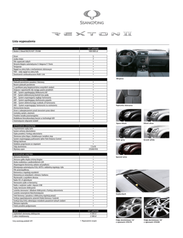 Lista wyposażenia Model Rexton 2 Diesel RX270 XVT 179 KM XVT Sapphire 169 000 zł Drzwi Liczba miejsc Filtr cząsteczek stałych Skrzynia biegów automatyczna 5–biegowa T–Tronic Tempomat Napęd na cztery koła z mechanizmem różnicowym TOD – stały napęd na cztery koła Zawieszenie wielowahaczowe Multi–Link 5 7 • • • • • • BEZPIECZEŃSTWO Poduszki powietrzne pasażera i kierowcy Boczne poduszki powietrzne 3–punktowe pasy bezpieczeństwa wszystkich siedzeń Zwijacze i ograniczniki siły naciągu pasów przednich ABS – System zapobiegający blokowaniu kół ESP – System elektronicznej kontroli toru jazdy BAS – System wspomagania nagłego hamowania ARP – System zapobiegający dachowaniu pojazdu EBD – System elektronicznego rozdziału sił hamowania HDC – System wspomagający hamowanie na wzniesieniu Wzmocnienie boczne Drzwi z zabezpieczeniem przed otwarciem przez dzieci Centralny zamek z alarmem Przednie światła przeciwmgielne Dodatkowe kierunkowskazy boczne w technologii LED Automatyczne włączanie świateł • • • • • • • • • • • • • • • • WYPOSAŻENIE ZEWNĘTRZNE Przyciemniane szyby tylne System ochrony akumulatora Szyba przednia z funkcją odszraniania Otwierana tylna klapa z dodatkowym światłem stop System wspomagający parkowanie tyłem Park Distance Control Relingi dachowe Ozdobne progi boczne ze stopniami Felgi aluminiowe Wymiary opon WYPOSAŻENIE WNĘTRZA Skórzana kierownica Skórzana gałka drążka zmiany biegów Deska rozdzielcza z podświetleniem LED Wspomaganie kierownicy zależne od prędkości Klimatyzacja automatyczna FULL AUTO z oddzielną regulacją z tyłu Filtr przeciwpyłkowy Kierownica z regulacją wysokości Kierownica ze wstawkami z drewna i karbonu Wycieraczki z czujnikiem deszczu Radio CD z 6 głośnikami Sterowanie audio w kierownicy Radio z wejściem audio i złączem USB Szyby sterowane elektrycznie Lusterka sterowane i składane elektrycznie z funkcją odszraniania Lusterko wewnętrzne fotochromatyczne Fotel kierowcy i pasażera z elektryczną regulacją pozycji Funkcja zapamiętywania ustawień fotela kierowcy i lusterek Funkcja Easy Entry ułatwiająca wsiadanie pasażerom tylnych siedzeń Skórzana tapicerka Fotele przednie podgrzewane OPCJE Szyberdach sterowany elektrycznie Lakier metalizowany Ceny zawierają podatek VAT Wnętrze • • • • • • • 7,5x18 255/60 R18 • • • • • • • • • • • • • • • • • • • • Tapicerka skórzana Space black Silent silver Tonic grey Grand white Special wine Szyberdach XVT Sapphire 4 500 zł 2 500 zł •Wyposażenie seryjne Felgi aluminiowe 16“ z oponami 255/70 Felgi aluminiowe 18“ z oponami 255/60 Spécifications techniques Dane techniczne WYMIARY 1830 (1760) 1550 1540 2820 1870 4720 Dane techniczne Silnik Diesel 2.7 turbo Napęd AWD Skrzynia biegów mm 4720 Wysokość całkowita mm 1760 (1830 z relingami dachowymi) Szerokość całkowita mm 1870 Przód mm 1550 Tył mm 1540 Przedni mm 860 Tylny mm 1040 Rozstaw osi mm 2820 Kąt natarcia ° 28 Kąt zejścia ° 25,5 ° 22,5 Rozstaw kół Zwis WYMIARY AT Długość całkowita Kąt rampowy Prześwit Przód mm 247 Tył mm 206 / 263 Minimalny promień skrętu WAGA m 5,7 głębokość brodzenia mm 680 Masa całkowita kg 2760 Masa własna kg 2000 - 2104 Z hamulcem kg 3200 Bez hamulca kg 750 – Diesel Dopuszczalna masa całkowita przyczepy Paliwo Pojemność skokowa SILNIK Średnica cylindra x skok tłoka ZUŻYCIE PALIWA 2.696 86,2 X 92,4 Stopień sprężenia – 17,5:1 Liczba cylindrów – 5 w rzędzie kW/obr. 132 / 4000 Moc maksymalna OSIĄGI cc mm KM/obr. 179 / 4000 Nm/obr. 402 / 1600~3000 Prędkość maksymalna km/h 188 Emisja CO2 (cykl mieszany) g/km 235 Cykl miejski l/100km 12,2 Cykl pozamiejski l/100km 7,5 Cykl mieszany l/100km 9,2 Maksymalny moment obrotowy pieczątka dealera Wszelkie informacje prezentowane w niniejszym dokumencie, są przeznaczone tylko dla celów informacyjnych i nie stanowią oferty w rozumieniu Kodeksu cywilnego. Nie stanowią także zapewnienia w rozumieniu art. 4 ust. 3 Ustawy z dnia 27 lipca 2002 r. o szczególnych warunkach sprzedaży konsumenckiej oraz o zmianie Kodeksu cywilnego, ani opisu towaru w rozumieniu art. 4 ust. 2 tej ustawy. Podane informacje na temat gwarancji pojazdu nie stanowią udzielenia kupującemu gwarancji. Podane ceny są zalecanymi cenami detalicznymi mogą różnić się u poszczególnych Dealerów Ssangyong. Zalecane ceny detaliczne dotyczące pakietów jak i wyposażenia dodatkowego odnoszą się jedynie do sytuacji, jeśli wyposażenie to zostanie zamówione jednocześnie z danym modelem pojazdu. Podane zalecane ceny samochodów odnoszą się do modeli w kolorze podstawowym, a lakiery metalizowane są dostępne za dopłatą. Powyższe ceny mogą ulec zmianom bez uprzedzenia w zależności od zmiany cen wprowadzonych przez producenta, jak również zmian w podatkach, opłatach i przepisach celnych. Oferowany asortyment pojazdów, akcesoriów i wyposażenia, jak też jego dostępność może różnić się od prezentowanego w niniejszym dokumencie. Przedstawione informacje są aktualne w chwili ukazania się niniejszej publikacji. Ssangyong Motors Polska zastrzega sobie prawo do zmian w niniejszej informacji w każdej chwili i to zarówno w zakresie oferowanych modeli, ich budowy, specyfikacji, wyposażenia i akcesoriów, jak również sugerowanych cen detalicznych. Informacji dotyczących warunków nabywania pojazdów, akcesoriów i wyposażenia prezentowanych w niniejszym dokumencie, ich parametrów, innych cech oraz dostępności prezentowanych modeli i wyposażenia, jak również aktualnych cen detalicznych prosimy zasięgnąć u Dealera Ssangyong.