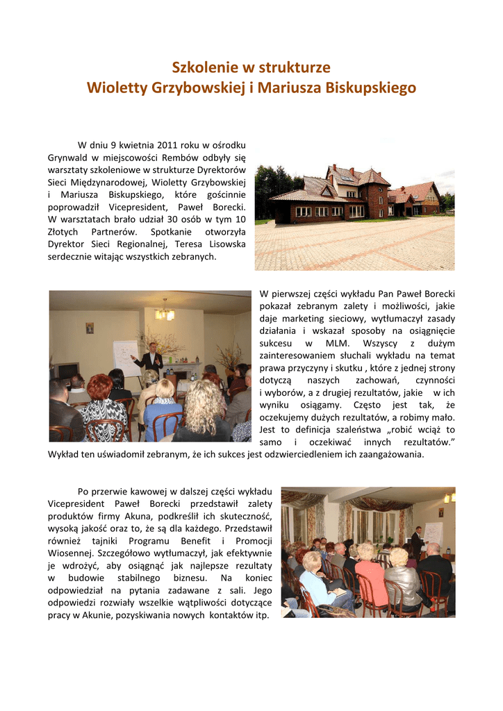 Szkolenie w strukturze Wioletty Grzybowskiej i Mariusza Biskupskiego W dniu 9 kwietnia 2011 roku w ośrodku Grynwald w miejscowości Rembów odbyły się warsztaty szkoleniowe w strukturze Dyrektorów Sieci Międzynarodowej, Wioletty Grzybowskiej i Mariusza Biskupskiego, które gościnnie poprowadził Vicepresident, Paweł Borecki. W warsztatach brało udział 30 osób w tym 10 Złotych Partnerów. Spotkanie otworzyła Dyrektor Sieci Regionalnej, Teresa Lisowska serdecznie witając wszystkich zebranych. W pierwszej części wykładu Pan Paweł Borecki pokazał zebranym zalety i możliwości, jakie daje marketing sieciowy, wytłumaczył zasady działania i wskazał sposoby na osiągnięcie sukcesu w MLM. Wszyscy z dużym zainteresowaniem słuchali wykładu na temat prawa przyczyny i skutku , które z jednej strony dotyczą naszych zachowań, czynności i wyborów, a z drugiej rezultatów, jakie w ich wyniku osiągamy. Często jest tak, że oczekujemy dużych rezultatów, a robimy mało. Jest to definicja szaleństwa „robić wciąż to samo i oczekiwać innych rezultatów.” Wykład ten uświadomił zebranym, że ich sukces jest odzwierciedleniem ich zaangażowania. Po przerwie kawowej w dalszej części wykładu Vicepresident Paweł Borecki przedstawił zalety produktów firmy Akuna, podkreślił ich skuteczność, wysoką jakość oraz to, że są dla każdego. Przedstawił również tajniki Programu Benefit i Promocji Wiosennej. Szczegółowo wytłumaczył, jak efektywnie je wdrożyć, aby osiągnąć jak najlepsze rezultaty w budowie stabilnego biznesu. Na koniec odpowiedział na pytania zadawane z sali. Jego odpowiedzi rozwiały wszelkie wątpliwości dotyczące pracy w Akunie, pozyskiwania nowych kontaktów itp. Po wykładach rozpoczęła się kolacja integracyjna, podczas której do późnych godzin wieczornych wymieniano doświadczenia biznesowe. Organizatorką spotkania była Anna Bochenek, Złoty Partner. Wykłady Vicepresidenta Pawła Boreckiego były jak zawsze perfekcyjnie przygotowane i przyniosły ogromne korzyści słuchaczom. Wiedza zdobyta na szkoleniu na pewno przyczyni się do rozwoju struktur biznesowych. Wiele osób uświadomiło sobie, że ich sukces zależy od ich zaangażowania w działanie i od tego, jak mocne są ich pragnienia i marzenia.