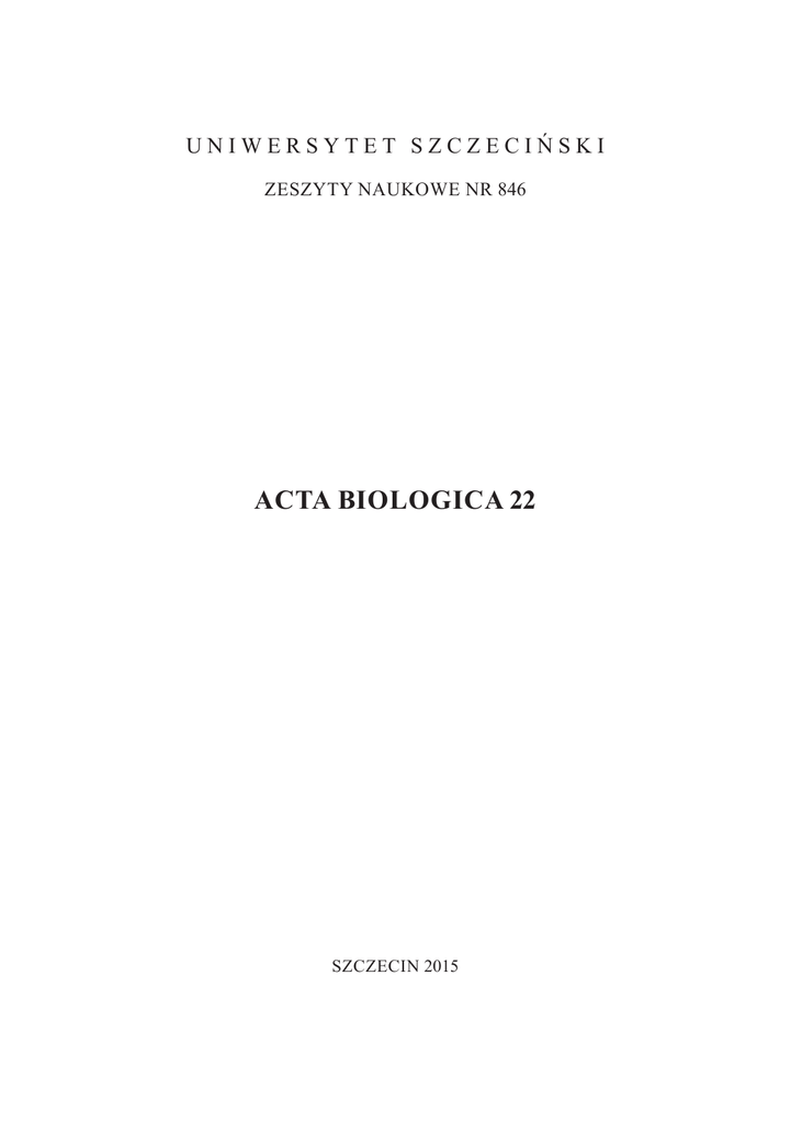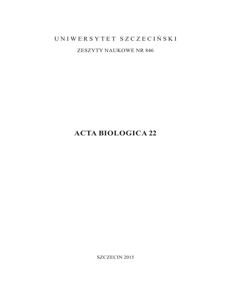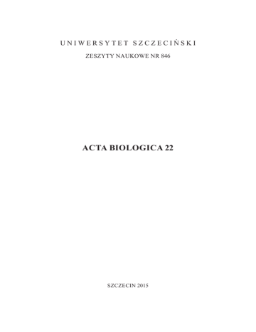 Uniwersytet Szczeciński Zeszyty Naukowe nr 846 Acta Biologica 22 szczecin 2015 Publishing Board | Rada Wydawnicza Adam Bechler, Tomasz Bernat, Anna Cedro, Paweł Cięszczyk, Piotr Michałowski, Małgorzata Ofiarska, Aleksander Panasiuk, Grzegorz Wejman, Dariusz Wysocki, Renata Ziemińska, Marek Górski – Head Radosław Gaziński – Executive Editor of Szczecin University Press Editorial Board | Rada Redakcyjna Richard A. Baker (University of Leeds), Andreas Martens (Karlsruhe University of Education) Stojmir Stojanovski (Hydrobiological Institute in Ohrid), Clémentine Fritsch (University of Antwerp) Leszek Jerzak (University of Zielonagóra), Barbara Płytycz (Jagiellonian University in Krakow) Maria Zając (Jagiellonian University in Krakow), Francesco Spada (University of Rome “La Sapienza”) Józef Kur (Gdańsk University of Technology) Reviewers | Recenzenci Jörg Böhner – Freie Universität Berlin (Germany), Brendan Kavanagh - Royal College of Surgeons in Ireland (Ireland), Vladimir Pésič – University of Montenegro (Montenegro), Witold Kowalik – University Maria Curie-Skłodowska (Poland), Anas Cherqui – Maître de Conférences Universitaire (France) Maurice Hullé – Université Rennes (France), Maciej Skorupski – University of Life Sciences in Poznań (Poland), Grzegorz Gabryś – University of Zielona Góra (Poland), Joanna Śliwowska – University of Life Sciences in Poznań (Poland), Jana Moravcikova – Institute of Plant Genetics and Biotechnology (Slovakia) André Laroche – Agriculture and Agri-Food Canada (Canada), Krystyna Piotrowska-Weryszko – University of Life Sciences in Lublin (Poland), Piotr Rapiejko – Allergen Research Center (Poland) Oleg Aleksandrowicz – University in Słupsk (Poland), Andrej Matalin – Moscow State Pedagogical University (Russia), Horst von Bannwarth – Universität zu Köln (Germany), Mirosław Parafiniuk – Pomeranian Medical University in Szczecin (Poland), Danijela Stešević – University of Montenegro (Montenegro), Hiroshi Abé – Nihon University (Japan), Alireza Saboori – University of Tehran (Iran) Sonia Bouhachem – Entomologiste Laboratoire de Protection des Végétaux INRAT (France) Editor | Redaktor naukowy dr hab. Andrzej Zawal prof. US Statistical Editor | Redaktor statystyczny dr Przemysław Śmietana Langague Editor | Redaktor językowy Warren Whitmore Technical editorial and text design | Redakcja techniczna i skład Joanna Dubois-Mosora Proofreader – Korektor Joanna Grzybowska Cover design | Projekt okładka Bartosz Łukaszewski Paper version of the journal is an original version | Wersja papierowa jest wersją pierwotną The Journal is indexed | Czasopismo jest indeksowane Baza AGRO, Index Copernicus Full version of publication available | Pełna wersja publikacji dostępna na stronie www.wb.univ.szczecin.pl/acta-biologica © Copyright by Uniwersytet Szczeciński, Szczecin 2015 ISSN 1640-6818 | ISSN 1230-3976 wydawnictwo naukowe uniwersytetu szczecińskiego Edition I. Publishing sheet size 12,5. Printing sheet size 15,2. Format B5 Contents Maciej Arciszewski – Migration of amphibians and their mortality on the road of Knyszyn Forest Landscape Park.................................................. 5 Aleksandra Bańkowska, Magdalena Kłosowska, Robert Stryjecki, Andrzej Zawal – New and rare water mite (Hydrachnidia) species in Polish fauna found in the Krąpiel River and valley water bodies in Ińskie Lake District.................................................................................. 15 Tran Thi Hong Phuong, Anna Wróblewska-Kurdyk, Katarzyna Dancewicz, Beata Gabryś – Selective acceptance of brassicaceous plants by the peach potato aphid Myzus persicae: a case study of Aurinia saxatilis..................................................................................................... 39 Anna Wróblewska-Kurdyk, Lidia Nowak, Katarzyna Dancewicz, Antoni Szumny, Beata Gabryś – In search of biopesticides: the effect of caraway Carum carvi essential oil and its major constituents on peach potato aphid Myzus persicae probing behavior . ..................................... 51 Grzegorz Bukowski, Bogusław Chachaj – Soil oribatid mites (Acari, Oribatida) in the plots of grass collection in IHAR Bydgoszcz............... 63 Grzegorz Bukowski, Bogusław Chachaj – The Effect of Mowing on Moss Mites (Acari, Oribatida) of Xerothermic Reserve Gruczno..................... 71 Natalia Chmielewska, Marta Wańkowska – The impact of the mother on the hypothalamic-pituitary-adrenal, hypothalamic-pituitary-gonadal and somatotropic axes activity of offspring during postnatal ontogeny.. 79 Gabriela Gołębiowska-Pikania, Elżbieta Golemiec – Cold-enhanced gene expression of the foliar thiol-specific antioxidant protein in triticale (x Triticosecale Wittmack) seedlings resistant to the pink snow mould resulted from Microdochium nivale (Samuels and Hallett) infection...... 97 Aleksandra Kruczek, Alina Stacewicz – Botanical origin of west Pomeranian honeys................................................................................... 119 Łukasz Baran, Mieczysław Stachowiak – New of Philorhizus melanocephalus (Dejean, 1825) (Coleoptera: carabidae) NW Poland ... 133 Tymoteusz Miller, Gorzysław Poleszczuk, Małgorzata Tokarz – Changes of water quality of the Osówka Stream flowing through ponds Syrenie Stawy in Szczecin (NW-Poland) in selected periods in the years 1994–2014................................................................................................. 137 Ewa Rębacz-Maron, Natalia Nitecka – External ear anthroposcopy in female students of the University of Szczecin.......................................... 153 Edyta Stępień, Andrzej Zawal, Paweł Buczyński, Edyta Buczyńska – Changes in the vegetation of a small lowland river valley (Krąpeil, NW Poland) after dredging.............................................................................. 