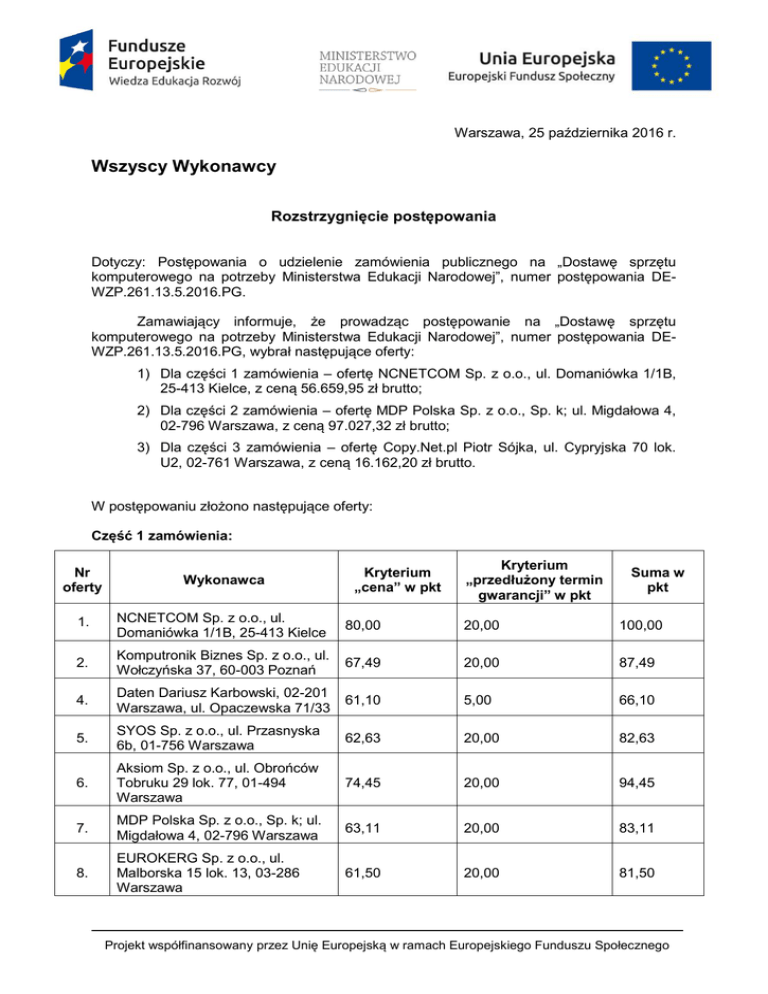 Warszawa, 25 października 2016 r. Wszyscy Wykonawcy Rozstrzygnięcie postępowania Dotyczy: Postępowania o udzielenie zamówienia publicznego na „Dostawę sprzętu komputerowego na potrzeby Ministerstwa Edukacji Narodowej”, numer postępowania DEWZP.261.13.5.2016.PG. Zamawiający informuje, że prowadząc postępowanie na „Dostawę sprzętu komputerowego na potrzeby Ministerstwa Edukacji Narodowej”, numer postępowania DEWZP.261.13.5.2016.PG, wybrał następujące oferty: 1) Dla części 1 zamówienia – ofertę NCNETCOM Sp. z o.o., ul. Domaniówka 1/1B, 25-413 Kielce, z ceną 56.659,95 zł brutto; 2) Dla części 2 zamówienia – ofertę MDP Polska Sp. z o.o., Sp. k; ul. Migdałowa 4, 02-796 Warszawa, z ceną 97.027,32 zł brutto; 3) Dla części 3 zamówienia – ofertę Copy.Net.pl Piotr Sójka, ul. Cypryjska 70 lok. U2, 02-761 Warszawa, z ceną 16.162,20 zł brutto. W postępowaniu złożono następujące oferty: Część 1 zamówienia: Kryterium „cena” w pkt Kryterium „przedłużony termin gwarancji” w pkt Nr oferty Wykonawca Suma w pkt 1. NCNETCOM Sp. z o.o., ul. Domaniówka 1/1B, 25-413 Kielce 80,00 20,00 100,00 2. Komputronik Biznes Sp. z o.o., ul. Wołczyńska 37, 60-003 Poznań 67,49 20,00 87,49 4. Daten Dariusz Karbowski, 02-201 Warszawa, ul. Opaczewska 71/33 61,10 5,00 66,10 5. SYOS Sp. z o.o., ul. Przasnyska 6b, 01-756 Warszawa 62,63 20,00 82,63 6. Aksiom Sp. z o.o., ul. Obrońców Tobruku 29 lok. 77, 01-494 Warszawa 74,45 20,00 94,45 7. MDP Polska Sp. z o.o., Sp. k; ul. Migdałowa 4, 02-796 Warszawa 63,11 20,00 83,11 8. EUROKERG Sp. z o.o., ul. Malborska 15 lok. 13, 03-286 Warszawa 61,50 20,00 81,50 Projekt współfinansowany przez Unię Europejską w ramach Europejskiego Funduszu Społecznego Część 2 zamówienia: Kryterium „cena” w pkt Kryterium „przedłużony termin gwarancji” w pkt Nr oferty Wykonawca Suma w pkt 1. NCNETCOM Sp. z o.o., ul. Domaniówka 1/1B, 25-413 Kielce 77,70 20,00 97,70 2. Komputronik Biznes Sp. z o.o., ul. Wołczyńska 37, 60-003 Poznań 68,76 20,00 88,76 4. Daten Dariusz Karbowski, 02-201 Warszawa, ul. Opaczewska 71/33 59,84 20,00 79,84 5. SYOS Sp. z o.o., ul. Przasnyska 6b, 01-756 Warszawa 69,51 20,00 89,51 6. Aksiom Sp. z o.o., ul. Obrońców Tobruku 29 lok. 77, 01-494 Warszawa 74,66 20,00 94,66 7. MDP Polska Sp. z o.o., Sp. k; ul. Migdałowa 4, 02-796 Warszawa 80,00 20,00 100,00 8. EUROKERG Sp. z o.o., ul. Malborska 15 lok. 13, 03-286 Warszawa 68,31 20,00 88,31 Część 3 zamówienia: Kryterium „koszt cyklu życia produktu” w pkt Kryterium „przedłużony termin gwarancji” w pkt Nr oferty Wykonawca Suma w pkt 3. Copy.Net.pl Piotr Sójka, ul. Cypryjska 70 lok. U2, 02-761 Warszawa 80,00 20,00 100,00 4. Daten Dariusz Karbowski, 02-201 Warszawa, ul. Opaczewska 71/33 69,29 0,00 69,29 8. EUROKERG Sp. z o.o., ul. Malborska 15 lok. 13, 03-286 Warszawa 61,26 20,00 81,26 Zamawiający informuje, że w przedmiotowym postępowaniu nie wykluczył żadnego wykonawcy, ani też nie odrzucił żadnej oferty. Umowy w postepowaniu mogą zostać zawarte w terminie nie krótszym niż 5 dni od przekazania niniejszego zawiadomienia. Projekt współfinansowany przez Unię Europejską w ramach Europejskiego Funduszu Społecznego