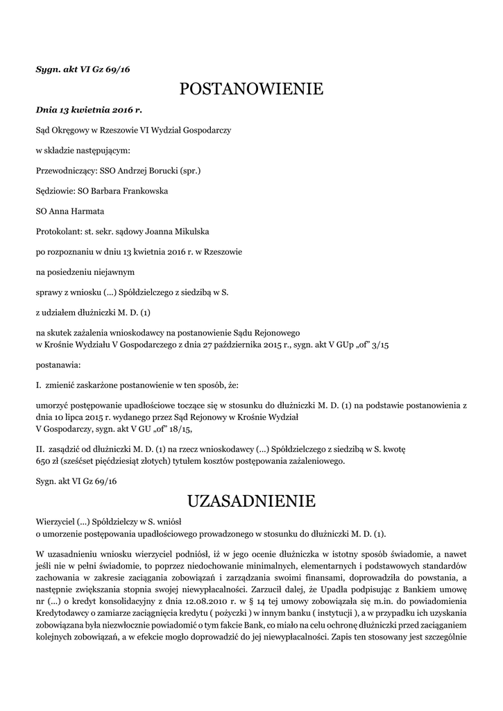 Sygn. akt VI Gz 69/16 POSTANOWIENIE Dnia 13 kwietnia 2016 r. Sąd Okręgowy w Rzeszowie VI Wydział Gospodarczy w składzie następującym: Przewodniczący: SSO Andrzej Borucki (spr.) Sędziowie: SO Barbara Frankowska SO Anna Harmata Protokolant: st. sekr. sądowy Joanna Mikulska po rozpoznaniu w dniu 13 kwietnia 2016 r. w Rzeszowie na posiedzeniu niejawnym sprawy z wniosku (...) Spółdzielczego z siedzibą w S. z udziałem dłużniczki M. D. (1) na skutek zażalenia wnioskodawcy na postanowienie Sądu Rejonowego w Krośnie Wydziału V Gospodarczego z dnia 27 października 2015 r., sygn. akt V GUp „of” 3/15 postanawia: I. zmienić zaskarżone postanowienie w ten sposób, że: umorzyć postępowanie upadłościowe toczące się w stosunku do dłużniczki M. D. (1) na podstawie postanowienia z dnia 10 lipca 2015 r. wydanego przez Sąd Rejonowy w Krośnie Wydział V Gospodarczy, sygn. akt V GU „of” 18/15, II. zasądzić od dłużniczki M. D. (1) na rzecz wnioskodawcy (...) Spółdzielczego z siedzibą w S. kwotę 650 zł (sześćset pięćdziesiąt złotych) tytułem kosztów postępowania zażaleniowego. Sygn. akt VI Gz 69/16 UZASADNIENIE Wierzyciel (...) Spółdzielczy w S. wniósł o umorzenie postępowania upadłościowego prowadzonego w stosunku do dłużniczki M. D. (1). W uzasadnieniu wniosku wierzyciel podniósł, iż w jego ocenie dłużniczka w istotny sposób świadomie, a nawet jeśli nie w pełni świadomie, to poprzez niedochowanie minimalnych, elementarnych i podstawowych standardów zachowania w zakresie zaciągania zobowiązań i zarządzania swoimi finansami, doprowadziła do powstania, a następnie zwiększania stopnia swojej niewypłacalności. Zarzucił dalej, że Upadła podpisując z Bankiem umowę nr (...) o kredyt konsolidacyjny z dnia 12.08.2010 r. w § 14 tej umowy zobowiązała się m.in. do powiadomienia Kredytodawcy o zamiarze zaciągnięcia kredytu ( pożyczki ) w innym banku ( instytucji ), a w przypadku ich uzyskania zobowiązana była niezwłocznie powiadomić o tym fakcie Bank, co miało na celu ochronę dłużniczki przed zaciąganiem kolejnych zobowiązań, a w efekcie mogło doprowadzić do jej niewypłacalności. Zapis ten stosowany jest szczególnie w kredytach konsolidacyjnych dla zwrócenia uwagi kredytobiorcy na ewentualne pokusy dalszego zadłużania się po tym jak już raz udzielono im pomocy w formie przedmiotowego kredytu. Bank podkreślił przy tym, że udzielił kredytu konsolidacyjnego przeznaczonego na spłatę zobowiązań jakie dłużniczka już wówczas posiadała w wielu instytucjach finansowych. Według wierzyciela gdyby dłużniczka, która na dzień zawierania tej umowy posiadała zdolność kredytową, nie zaciągała kolejnych zobowiązań, to z pewnością nie doszłoby do powstania stanu jej niewypłacalności. Co istotne, gdyby dłużniczka nie zaciągała kolejnych zobowiązań, Bank miałby możliwość kolejny raz ją wesprzeć w formie restrukturyzacji zadłużenia. Skoro jednak dłużniczka zaciągała kolejne zobowiązania, Bank nie był w stanie restrukturyzować zadłużenia z uwagi na brak zdolności kredytowej. Zdaniem Banku upadła nie wywiązała się z tej części umowy i zaciągała w sposób niekontrolowany dalsze zobowiązania o charakterze pożyczkowym, przy czym być może spłacała tylko niektóre z nich, czym działała na szkodę pozostałych wierzycieli. Tym samym działała nie tylko na szkodę Banku, ale również spowodowała, że sama znalazła się w sytuacji, w której nie jest w stanie obsługiwać zaciągniętych przez siebie zobowiązań. Dłużniczka jako osoba wykształcona powinna mieć świadomość, że zaciąganie kolejnych zobowiązań przeznaczanych na potrzeby konsumpcyjne, w końcu doprowadzi do jej niewypłacalności. Wierzyciel podniósł dalej, że nie można akceptować w obrocie prawnym sytuacji, w której osoba fizyczna zaciąga zobowiązania z przeznaczeniem na niekontrolowaną konsumpcję, a gdy osiąga kres swoich możliwości w spłacie tych zobowiązań - składa wniosek o upadłość. Dłużniczka M. D. (1) w piśmie z dnia 13.10.2015 r. wniosła o oddalenie wniosku wierzyciela (...)Spółdzielczego podnosząc, że brak jest jakichkolwiek podstaw prawnych do umorzenia postępowania upadłościowego w trybie art. 491(( 10)) ust. 3 Prawa upadłościowego i naprawczego. Podniosła, iż godnie z treścią art. 49110 ust. 3, sąd umarza postępowanie upadłościowe w przypadku gdy podstawa do oddalenia wniosku o ogłoszenie upadłości ujawni się po ogłoszeniu upadłości. Na taką podstawę oddalenia wniosku powołuje się nietrafnie wierzyciel - bank. W ocenie dłużniczki brak absolutnie jakichkolwiek podstaw do przyjęcia, iż zaistniały statuowane powyższym przepisem przesłanki umorzenia postępowania. M. D. (1) zaznaczył, iż we wniosku o ogłoszenie upadłości w sposób obszerny i wyczerpujący opisała swoją sytuację finansową oraz przyczyny istniejącego stanu rzeczy. Nie zataiła żadnych informacji, których brak ujawnienia mógłby spowodować oddalenie wniosku przed sąd. Przeciwnie, wyczerpująco opisała bieżące zadłużenie, wskazała wszystkich wierzycieli oraz szczegółowo opisała z jakiego powodu doszło do jej niewypłacalności. Sąd bez wyznaczenia rozprawy, uznając przedstawiony materiał za wystarczający do rozstrzygnięcia, orzekł o ogłoszeniu upadłości konsumenckiej. Jej zdaniem w stosunku do danych przedstawionych we wniosku nie nastąpiły żadne zmiany, ani też nie doszło do ujawnienia innych okoliczności, o których sąd nie miałby wiedzy na czas orzekania. Także Bank w piśmie z dnia 25.08.2015 r. nie ujawnił żadnych nowych okoliczności, które nie były by znane sądowi w czasie orzekania. We wniosku zawarte były informacje jakie kredyty w jakim banku oraz kiedy zaciągnęła M. D. (1). Dłużniczka podniosła, że nie polega na prawdzie zarzut jakoby zaciągała kredyty i pożyczki w sposób nieodpowiedzialny