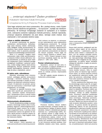 temat wydania ... zmierzyć stężenie? Żaden problem! POMIARY REFRAKTOMETRYCZNE Urządzenia firmy K-Patents Process Instruments. Tytuł tego artykułu jest nieco przewrotny. Bo z jednej strony, wielu Czytelnikom pomiar stężenia lub gęstości, „ na wyczucie”, wydaje się nieskomplikowany. W konkluzji niniejszego zostanie to wykazane (a w każdym razie, wskazana zostanie najlepsza metoda pomiaru). Jednak naprawdę, zmierzyć stężenie dokładnie nie jest łatwo. Istnieje wiele metod, lecz większość z nich posiada istotne wady. „Atom w służbie człowieka” W pomiarze wykorzystuje się zjawisko pochłaniania promieniowania radioaktywnego przez mierzony roztwór. Zachowując stałą odległość źródła promieniowania od detektora, łatwo określić stężenie bądź gęstość medium, które to parametry pozostają w proporcji do pochłoniętego promieniowania. Mimo, iż w metodzie z biegiem czasu zastosowano słabe źródła promieniowania, o relatywnie krótkim okresie półtrwania i słabej przenikliwości, to jednak jej użycie wiąże się z problemami. Praca z izotopami wymaga szczególnych kwalifikacji i uprawnień personelu, a także stałego nadzoru służb ochrony radiologicznej. Pewnym problemem bywają kwestie psychologiczne otoczenia, zmuszonego do pracy w sąsiedztwie „atomu”. W takim razie, mikrofalowo Mikrofale, przenikając przez mierzony roztwór, podlegają zjawisku przesunięcia fazowego i tłumienia amplitudy. Zmiana tych wartości pozostaje w związku ze zmieniającym się stężeniem substancji rozpuszczonych. W zależności od potrzeb, pomiar może być wykonywany w zbiornikach bądź przepływowo, na rurociągu. Ponieważ na zjawisko tłumienia mają wpływ takie czynniki jak: przewodność roztworu, zawartość cząstek nierozpuszczonych i temperatura (choć tę akurat można skompensować), wynik pomiaru nie poraża dokładnością. ności roztworu na stężenie, co wykonywane jest automatycznie przez odpowiednio skonfigurowany przetwornik. Tą metodą można mierzyć stężenie roztworów soli, kwasów i zasad. Poważnym ograniczeniem metody jest bardzo różny przebieg krzywych zależności przewodności od stężenia dla różnych związków. Prawie nigdy nie można mierzyć stężenia w pełnym zakresie 0 % - 100%. Czasem bywają to wręcz wycinkowe przedziały stężeń (np. dla HCl jedynie 0 – 18% i 22% - 36%) . Pomiar refraktometryczny Sposobem, wolnym od wad wielu innych rozwiązań, a mającym dodatkowe zalety, jest pomiar refraktometryczny. Fińska firma K-Patents Process Instruments tę metodę pomiaru doprowadziła do perfekcji. Oto jak wygląda zasada działania refraktometru procesowego: Wykorzystanie ultradźwięków Pomiar ultradźwiękowy polega na przepuszczaniu mierzonego medium przez U-rurkę, poddaną drganiom elektromagnetycznym. Częstotliwość drgań zmienia się w zależności od gęstości cieczy. Z pomiaru zmian częstotliwości wylicza się gęstość lub stężenie. Wynik pomiaru w pewnym stopniu zależy od składu cieczy, z tego względu może być obarczony błędem. Przewodność a stężenie Dość prostym i tanim sposobem pomiaru jest przeliczanie zmierzonej przewod- 6 Promienie świetlne, których źródłem jest dioda świecąca, emitująca światło monochromatyczne, padają na granicę dwóch ośrodków. Jednym z ośrodków jest pryzmat, wykonany np. z syntetycznego szafiru, drugim mierzony roztwór (z czego wynika, że aby dokonać pomiaru, należy zanurzyć czujnik refraktometru częścią „mokrą” w mierzonej cieczy). Promienie świetlne padają na granicę tych ośrodków pod różnymi kątami i w tym momencie zachodzi osobliwe, choć dokładnie zbadane przez fizykę, zjawisko. Artykuł został opublikowany w miesięczniku RYNEK CHEMICZNY nr 5/2005 Pewna ilość promieni, padających pod stosunkowo ostrym kątem do osi pionowej, ulega załamaniu i częściowemu zaabsorbowaniu przez roztwór a częściowemu odbiciu. Los ten spotyka wszystkie promienie, które padają pod kątem mniejszym od tzw. kąta granicznego całkowitego odbicia. Promienie, które osiągnęły ten kąt, bądź go przekroczyły, na granicy dwóch ośrodków odbijają się całkowicie, w ogóle nie przechodząc do roztworu. Kąt graniczny całkowitego odbicia jest ściśle związany ze współczynnikiem załamania światła roztworu, który to współczynnik zależy od stężenia tego roztworu. Innymi słowy, ze zmianą stężenia zmienia się współczynnik załamania światła, czyli także kąt graniczny całkowitego odbicia. Teraz tylko wystarczy zmierzyć ów kąt graniczny i problem rozwiązany. Pomiar współczynnika załamania światła (określanego czasem jako RI, od angielskiego Refraction Index) przez określenie kąta granicznego, rozwiązano tyleż pomysłowo co dokładnie. Promienie odbite częściowo bądź całkowicie od granicy dwóch ośrodków, trafiają na płytkę fotodetektorów. Promienie częściowo pochłonięte a częściowo odbite (czyli osłabione) dają obraz ciemniejszy. Natomiast promienie, które uległy całkowitemu odbiciu, dają obraz jasny. Między tymi dwoma obrazami istnieje na panelu detektorów wyraźna i ostra granica. Ta granica określa kąt graniczny całkowitego odbicia. W celu wyznaczenia współczynnika załamania światła, przyrząd oblicza stosunek powierzchni ciemnej do jasnej. Przeliczenie współczynnika załamania światła na inne jednostki (o ile użytkownik nie posługuje się bezpośrednio wartością RI do sterowania procesem) jest już sprawą banalną. Refraktometr firmy K-Patents Process Instruments może wyświetlać wynik w dowolnych jednostkach stężenia, od podstawowych, takich jak procenty temat wydania wagowe, g/cm3 do stopni Brixa, Ballinga, Plato i innych. Należy koniecznie wspomnieć o podstawowej przewadze pomiaru refraktometrycznego nad innym metodami. Otóż metoda ta jest absolutnie niewrażliwa na zanieczyszczenie roztworu częściami stałymi (np