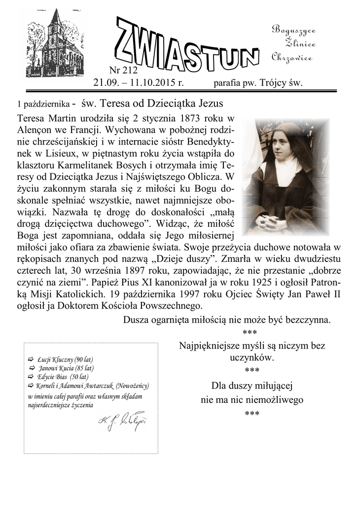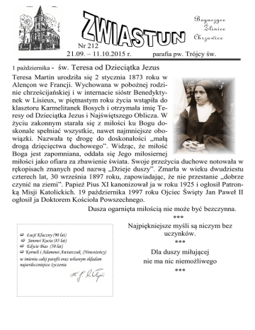 Boguszyce Źlinice Chrzowice Nr 212 21.09. – 11.10.2015 r. 1 października - parafia pw. Trójcy św. św. Teresa od Dzieciątka Jezus Teresa Martin urodziła się 2 stycznia 1873 roku w Alençon we Francji. Wychowana w pobożnej rodzinie chrześcijańskiej i w internacie sióstr Benedyktynek w Lisieux, w piętnastym roku życia wstąpiła do klasztoru Karmelitanek Bosych i otrzymała imię Teresy od Dzieciątka Jezus i Najświętszego Oblicza. W życiu zakonnym starała się z miłości ku Bogu doskonale spełniać wszystkie, nawet najmniejsze obowiązki. Nazwała tę drogę do doskonałości „małą drogą dzięcięctwa duchowego”. Widząc, że miłość Boga jest zapomniana, oddała się Jego miłosiernej miłości jako ofiara za zbawienie świata. Swoje przeżycia duchowe notowała w rękopisach znanych pod nazwą „Dzieje duszy”. Zmarła w wieku dwudziestu czterech lat, 30 września 1897 roku, zapowiadając, że nie przestanie „dobrze czynić na ziemi”. Papież Pius XI kanonizował ja w roku 1925 i ogłosił Patronką Misji Katolickich. 19 października 1997 roku Ojciec Święty Jan Paweł II ogłosił ja Doktorem Kościoła Powszechnego. Dusza ogarnięta miłością nie może być bezczynna. *** Najpiękniejsze myśli są niczym bez uczynków. Łucji Kluczny (90 lat) Janowi Kucia (85 lat) *** Edycie Bias (50 lat) Korneli i Adamowi Awtarczuk (Nowożeńcy) Dla duszy miłującej w imieniu całej parafii oraz własnym składam nie ma nic niemożliwego najserdeczniejsze życzenia *** PORZĄDEK NABOŻEŃSTW 21.09. – 27.09.2015 r. Poniedziałek – 21.09.2015 r. - św. Mateusza Apostoła 18.00 - 1. Do B. Op.w int. rodz. Chudala i za †† rodziców Rzytka i Chudala. 2. Do B. Op. w int. Łucji Kluczny z okazji 90-tych urodzin i za † męża Piotra. 3. Za †† rodz. Martę i Karola Pick, Anastazję i Ludwika Torka, syna Joachima, siostry, braci, szwagierki i szwagrów oraz dusze opuszczone. Wtorek – 22.09.2015 r. 18.00 - 1. Do Bożej Opatrzności w int. rodziny Piotra Prochota. 2. Za †† rodz. Zofię i Wiktora Broj, szwagra Stefana i całe pokrew. Broj i Lissy. 3. Za † Gintra Olsok. Środa – 23.09.2015 r. - św. o. Pio 7.30 - Do Anioła Stróża o opiekę Bożą i zdrowie w int. Pauliny i Michała Wotzka oraz ich rodziców i dziadków. Czwartek – 24.09.2015 r. 18.00 - Za †† męża i ojca Leona Dobis, ojca Bernarda, dwie szwagierki, rodz. Marię i Wilhelma Prusko. Piątek – 25.09.2015 r. 7.00 - Za †† Józefa Jaglo, cztery siostry, rodz. Jaglo, Wieszala, Norberta † pokrew. Sobota – 26.09.2015 r. 7.00 - Za †† Waltra Segiet w VII rocznicę śmierci, rodziców z obu stron, braci, siostry i dusze opuszczone. 18.00 - Do B. Op. w int. Bożeny i Mateusza Fronia oraz rodziców z obu stron. Niedziela – 27.09.2015 r. - (kolekta na budowę kościołów i jałmużna postna z całego roku) 8.00 - Do B. Op.i o opiekę Matki Bożej w int. Edyty Bias z okazji 50-tych urodzin oraz w int. Otylii Wocka i Teresy Kansy, za †† rodziców Wieszala. 10.00 - Do Bożej Opatrzności w int. żyjącej rodziny Bernarda Piechaczek. -----------------------------------------------------------Proszę o posprzątanie kościoła rodziny: Brzoza Adrian, Piechaczek Janusz, Lazik Jerzy, Żymła Sebastian. Zapow. Gwóźdź Kornelia (Źlinice) – Adam Awtarczuk (Głubczyce) – III. PORZĄDEK NABOŻEŃSTW 28.09 – 04.10.2015 r. Poniedziałek – 28.09.2015 r. 18.00 - 1. Za †† rodz. Bronisławę i Nikodema Krok, Gertrudę i Franciszkę Żurek i całe pokrew. Chudala. 2. Do Bożej Opatrzności w int. Sebastiana Gamrot. Wtorek – 29.09.2015 r. - św. Archaniołów Michała, Gabriela i Rafała 18.00 - 1. Do Bożej Opatrzności w int. Stefanii i Waltera Krzewica oraz za †† matkę Erikę Krzewica i ojca Konrada Pawleta. 2. Za † za granicą Hedwig Piechatzek, siostrę Annę Chudala (Od Augusta Piechatzek). Środa – 30.09.2015 r. 7.30 - Za †† Różę i Jerzego, Justynę i Ryszarda Wieszala, męża Norberta, córkę Alicję † pokrew. Czwartek – 01.10.2015 r. - I czwartek miesiąca, św. Teresy od Dzieciątka Jezus 17.30 - Adoracja Najśw. Sakramentu 18.00 - Do Bożej Opatrzności w int. rodziny Kasperek. Piątek – 02.10.2015 r. - I piątek miesiąca, Świętych Aniołów Stróżów 7.00 - W int. Czcicieli Najświętszego Serca Pana Jezusa. 18.00 - Do Bożej Opatrzności w int. rodz. Magdaleny i Piotra Urbacka. Sobota – 03.10.2015 r. – I sobota miesiąca 7.00 - Za †† ojca i teścia Mariana Drążewskiego, rodziców Gertrudę i Pawła Chudala, ciotkę Jadwigę Chudala i całe pokrew. 12.00 - Ślub rzymski Kornelii Gwóźdź i Adama Awtarczuk. 18.00 - Do B. Op. w int. rodz. Gladys oraz za † matkę Annę Cwynar oraz w int. Jana Kucia z okazji 85 urodzin a także za † męża i ojca Pawła Odelga w 30-ty dzień po śmierci. Niedziela – 04.10.2015 r. - (kolekta na Seminarium Duchowne w Opolu) 8.00 - Dwujęzyczna. W int. członków Róż Różańcowych. 10.00 - Za †† rodz. Marię i Wincentego Lempka oraz Jadwigę Śniadach, z rodzin Lempka, Krysiak -----------------------------------------------------------Proszę o posprzątanie kościoła rodziny: Wotzka Arnold, Długosz Rudolf, Smandzik Norbert, Roskosz Michał. Zapow. Lazar Teresa (Żlinice) – Maciek Grzegorz (Zimnice Wlk). – I. PORZĄDEK NABOŻEŃSTW 05.10. – 11.10.2015 r. Poniedziałek – 05.10.2015 r. - św. Faustyny Kowalskiej 18.00 - Do Bożej Opatrzności w int. rodz. Pielka oraz za †† dziadków Józefa i Krystynę Klemens, za †† z pokrew. Pielka, Kluczny, Klemenz i Wilhelm. Wtorek – 06.10.2015 r. 18.00 - Za †† syna Andrzeja Broy, ciotkę Klarę, rodziców Marię i Franciszka Broy, Stanisława i Agnieszkę Roskosz, brata Henryka i szwagra. Środa – 07.10.2015 r. - NMP Różańcowej 7.30 - Do Bożej Opatrzności w int. rodzin Langosz i Kabela. Czwartek – 08.10.2015 r. 18.00 - 1. Za †† Marię, Marcina, Andrzeja i Wojciecha Majcher, Wierę i Wincentego Cieślikiewicz, I