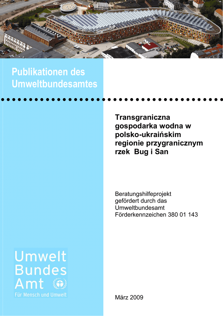 Publikationen des Umweltbundesamtes ........................................ Transgraniczna gospodarka wodna w polsko-ukraińskim regionie przygranicznym rzek Bug i San Beratungshilfeprojekt gefördert durch das Umweltbundesamt Förderkennzeichen 380 01 143 März 2009 - Sprawozdanie końcowe „Transgraniczna gospodarka wodna w polsko-ukraińskim regionie przygranicznym rzek Bug i San“ Projekt doradczy FKZ 308 01 143 DREBERIS GmbH Gostritzer Str. 61-63 01217 Drezno Stadtentwässerung Dresden GbmH Scharfenberger Str. 152 01139 Drezno Drezno, dnia 31 stycznia 2008r. Transgraniczna gospodarka wodna w polsko-ukraińskim regionie przygranicznym Sprawozdanie końcowe Spis treści Spis rysunków ........................................................................................................................5 Spis tabel ...............................................................................................................................5 1 Wprowadzenie .................................................................................................................6 2 Stan wód ........................................................................................................................13 3 2.1. Dane dorzecza rzeki...............................................................................................13 2.2. Klimat i warunki hydrologiczne ...............................................................................16 2.3. Jakość wody wód powierzchniowych .....................................................................16 Stan oczyszczania ścieków............................................................................................22 3.1. Ogólna sytuacja związana z odprowadzaniem ścieków na Ukrainie .......................22 3.2. Ogólne warunki prawne i administracyjne ..............................................................26 3.2.1. Podstawy normatywne ukraińskiej gospodarki wodnej ...................................... 26 3.2.2. Regulacja gospodarki komunalnej .................................................................... 28 3.2.3. Pobór opłat ....................................................................................................... 29 3.2.4. Ogólna sytuacja gospodarcza ........................................................................... 30 3.3. 3.3.1. Wykorzystanie i zuŜycie wody ........................................................................... 31 3.3.2. Zanieczyszczanie wód ściekami ....................................................................... 31 3.3.3. Odprowadzenie ścieków oraz ich oczyszczanie ................................................ 33 3.3.4. Analiza danych ankietowych ............................................................................. 37 3.4. 4 Stan oczyszczania ścieków w dorzeczu rzeki Bug .................................................31 Sytuacja w ukraińskiej części dorzecza rzeki San ..................................................40 Przedstawienie sytuacji w poszczególnych miastach .....................................................42 4.1. Miasto Lwów ..........................................................................................................42 4.1.1 Dane dotyczące kanalizacji miasta Lwowa........................................................ 42 4.1.2 Charakterystyka oczyszczalni ścieków miasta Lwowa ...................................... 42 4.1.3 Biologiczne stadium oczyszczania .................................................................... 43 4.1.4 Obróbka osadu ................................................................................................. 44 4.2. Miasto Nowowołyńsk ..............................................................................................44 4.2.1. Odprowadzanie ścieków ................................................................................... 44 4.2.2. Oczyszczanie ścieków ...................................................................................... 46 4.2.3. Obróbka osadu ................................................................................................. 49 4.3. Miasto Czerwonograd ............................................................................................50 4.3.1. Odprowadzanie ścieków ................................................................................... 50 4.3.2. Oczyszczanie ścieków ...................................................................................... 52 Strona 2 z 84 Transgraniczna gospodarka wodna w polsko-ukraińskim regionie przygranicznym 4.3.3. 5 Wskazówki ogólne .................................................................................................58 5.1.1. Odprowadzenie ścieków ................................................................................... 58 5.1.2. Oczyszczanie ścieków ...................................................................................... 58 5.1.3. Obróbka osadu ................................................................................................. 60 5.1.4. Polepszenie ochrony wód powierzchniowych .................................................... 60 5.2. Miasto Lwów ..........................................................................................................62 5.2.1. Kanalizacja ....................................................................................................... 62 5.2.2. Oczyszczanie ścieków ...................................................................................... 63 5.2.3. Obróbka osadu ................................................................................................. 63 5.3. Miasto Nowowołyńsk ..............................................................................................64 5.3.1. Odprowadzanie ścieków ................................................................................... 64 5.3.2. Oczyszczanie ścieków