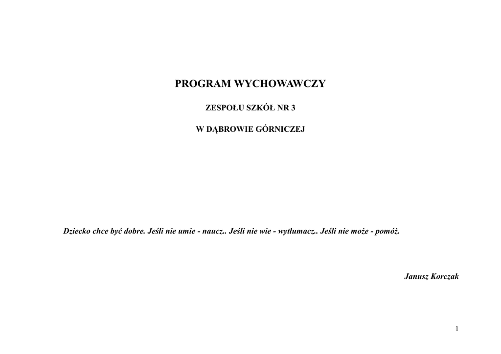 PROGRAM WYCHOWAWCZY ZESPOŁU SZKÓŁ NR 3 W DĄBROWIE GÓRNICZEJ Dziecko chce być dobre. Jeśli nie umie - naucz.. Jeśli nie wie - wytłumacz.. Jeśli nie może - pomóż. Janusz Korczak 1 Regulacje prawne Program Wychowawczy Zespołu Szkół nr 3 został opracowany w oparciu o następujące akty prawne: Ustawa z 20 lutego 2015r. o zmianie ustawy o systemie oświaty oraz niektórych innych ustaw (Dz. U. poz. 357) Rozporządzenie Ministra Edukacji Narodowej z dnia 30 maja 2014 r. zmieniające rozporządzenie w sprawie podstawy programowej wychowania przedszkolnego oraz kształcenia ogólnego w poszczególnych typach szkół (Dz. U. 2014 poz. 803) Rozporządzenie MEN z dnia 18 sierpnia 2015 r. w sprawie zakresu i form prowadzenia w szkołach i placówkach systemu oświaty działalności wychowawczej, edukacyjnej, informatycznej i profilaktycznej w celu przeciwdziałania narkomanii ( Dz. U. poz.1249) Rozporządzenie MEN z dnia 30 kwietnia 2013 r. w sprawie zasad udzielania i organizacji pomocy psychologiczno-pedagogicznej w publicznych przedszkolach, szkołach i placówkach (Dz. U. poz. 532) Krajowy Program Przeciwdziałania Narkomanii na lata 2011-2016 Krajowy Program Przeciwdziałania Przemocy w Rodzinie na lata 2011-2020 Rządowy Program ” Bezpieczna i Przyjazna Szkoła”, „Bezpieczna +” Statut Szkoły. Wstęp Program Wychowawczy będzie realizowany w Zespole Szkół nr 3 w Dąbrowie Górniczej. Obejmie on całą społeczność szkolną (uczniów, nauczycieli, rodziców, pracowników szkoły). Program Wychowawczy będzie odpowiadał na problemy młodego człowieka, kształtował u uczniów postawy sprzyjające ich dalszemu rozwojowi indywidualnemu i społecznemu. Zaangażuje uczniów do pracy na rzecz drugiego człowieka. Rozwijał będzie odpowiedzialność 2 uczniów, ich poczucie własnej wartości oraz szacunek dla innych ludzi. Dążymy, żeby uczeń naszej szkoły wykazywał ciekawość poznawczą, podejmował różne inicjatywy, był kreatywny. Wykazywał się także kulturą osobistą, tolerancją i empatią. Program Wychowawczy opisuje w sposób całościowy treści i zadania zmierzające do wszechstronnego rozwoju ucznia. W Programie Wychowawczym uwzględniono specyfikę wiekową uczniów naszej szkoły oraz ich potrzeby rozwojowe. Dostosowano treść i formę do możliwości dzieci i młodzieży. Program Wychowawczy jest elastyczny i otwarty, można go modyfikować w zależności od potrzeb uczniów. Przy opracowywaniu Programu zespół nauczycieli wykorzystał diagnozę środowiska szkolnego, uwagi i wskazówki rodziców oraz uczniów, które uzyskano podczas ewaluacji Programu Wychowawczego na lata 2012-2015. Treści Programu Wychowawczego realizują wszyscy nauczyciele, wychowawcy i specjaliści szkoły. Misja szkoły Jesteśmy szkołą, która: Zapewnia wszechstronny rozwój osobowości uczniów. Wspiera rodziców w wychowaniu dzieci w świetle ustalonych norm i wartości. Uczy szacunku dla drugiego człowieka. Jest przyjazna dla ucznia, rodziców i nauczycieli. Model absolwenta Chcemy by nasz absolwent: Był wyposażony w rzetelną wiedzę, pozwalającą mu na kontynuowanie nauki na kolejnym etapie. 3 Wierzył w swoje możliwości i zdolności. Był uczciwy, tolerancyjny, odpowiedzialny i twórczy. Miał uporządkowany system wartości. Doceniał wartość rodziny i swoje w niej miejsce. Dbał o zdrowie własne i innych. Przejawiał postawę aprobowaną społecznie. Cele i zadania Programu Wychowawczego W szkole działalność wychowawcza polega na prowadzeniu działań z zakresu promocji zdrowia oraz wspomaganiu ucznia w jego rozwoju ukierunkowanym na osiągnięcie pełnej dojrzałości w sferze: fizycznej: zdobycie przez ucznia wiedzy i umiejętności pozwalających na prowadzenie zdrowego stylu życia i podejmowania zachowań prozdrowotnych; psychicznej: zbudowanie równowagi i harmonii psychicznej, ukształtowanie postaw sprzyjających wzmacnianiu zdrowia własnego i innych, kształtowanie środowiska sprzyjającego rozwojowi zdrowia, osiągnięcie właściwego stosunku do świata, poczucia siły, chęci do życia i witalności; społecznej: kształtowanie postawy otwartości w życiu społecznym, opartej na umiejętności samodzielnej analizy wzorów i norm społecznych oraz ćwiczeniu umiejętności wypełniania ról społecznych; aksjologicznej: zdobycie konstruktywnego i stabilnego systemu wartości, w tym docenianie znaczenia zdrowia i poczucia sensu istnienia. 4 Działalność edukacyjna polega natomiast na stałym poszerzaniu i ugruntowaniu wiedzy i umiejętności u uczniów, rodziców, nauczycieli z zakresu promocji zdrowia i zdrowego stylu życia. Szkoła dostarcza rzetelnych i aktualnych informacji na temat zagrożeń i rozwiązywania problemów związanych z używaniem środków odurzających. Cele ogólne Programu Wychowawczego Zespołu Szkól nr 3: 1.Wspieranie wszechstronnego rozwoju uczniów poprzez: - przyjazny klimat w szkole, - właściwą bazę, - bezpieczeństwo w szkole, 2. Kształtowanie postaw związanych z życiem w społeczeństwie: - uczenie kultury zachowania, prawidłowych relacji rówieśniczych, - budzenie wrażliwości moralnej, - kontakty ze światem zewnętrznym - kino, teatr, wycieczki, - wspieranie rozwoju ucznia-poznanie samego siebie, podniesienie samooceny, poczucia własnej wartości, - podejmowanie odpowiedzialnych decyzji związanych z prowadzeniem zdrowego stylu życia, - samorządność, - rozwijanie wrażliwości na dobro, wolontariat, 3. Przygotowanie ucznia do życia w warunkach współczesnego świata: - osiągnięcie właściwego stosunku do świata, - edukacja europejska, - wspieranie w podejmowaniu decyzji związanych z wyborem drogi zawodowej, 5 4. Poznawanie postaw i wartości związanych z patronem szkoły Założenia Programu Wychowawczego: Szkoła wspiera rodziców w procesie wychowania dzieci, w kształtowaniu rozwoju osobowego ucznia. Kształtuje szacunek dla dobra wspólnego, rodziny, szkoły, społecz