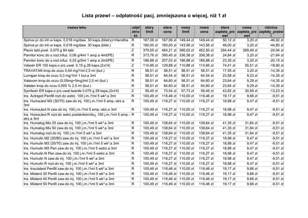 Lista przewl – odp atno nazwa leku Spiriva pr.do inh.w kaps. 0,018 mg/daw. 30 kaps.(blistry)+Handiha Spiriva pr.do inh.w kaps. 0,018 mg/daw. 30 kaps.(blist.) Plavix tabl.powl. 0,075 g 84 tabl. Pamitor konc.do s.rozt.infuz. 0,06 g/4ml 1 amp.a 4ml(PE) Pamitor konc.do s.rozt.infuz. 0,03 g/2ml 1 amp.a 2ml(PE) Velaxin ER 150 kaps.o prz.uwal. 0,15 g 28 kaps.(2x14) TRAVATAN krop.do oczu 0,04 mg/1ml 2,5 ml (but.) Lumigan krop.do oczu 0,3 mg/1ml 1 but.a 3ml Xalacom krop.do oczu (0,05mg+5mg)/ml 2,5 ml (but.) Xalatan krop.do oczu 0,005 % 2,5 ml (but.) Symfaxin ER kaps.o prz.uwal.twarde 0,075 g 28 kaps.(2x14) Ins. Actrapid Penfill rozt.do wstrz. 100 j.m./1ml 5 wk³.a 3ml Ins. HumaJect M3 (30/70) zaw.do inj. 100 j.m./1ml 5 amp.-strz.a 3ml Ins. HumaJect N zaw.do inj. 100 j.m./1ml 5 amp.-strz.a 3ml Ins. HumaJect R rozt.do wstrz.podsk/dom/do¿ 100 j.m./1ml 5 amp.strz.a 3ml Ins. Humalog Mix 25 zaw.do inj. 100 j.m./1ml 5 wk³.a 3ml Ins. Humalog Mix 50 zaw.do inj. 100 j.m./1ml 5 wk³.a 3ml Ins. Humalog rozt.do inj. 100 j.m./1ml 5 wk³.a 3ml Ins. Humulin M2 (20/80) zaw.do inj. 100 j.m./1ml 5 wk³.a 3ml Ins. Humulin M3 (30/70) zaw.do inj. 100 j.m./1ml 5 wk³.a 3ml Ins. Humulin M3 Pen zaw.do inj. 100 j.m./1ml 5 wstrz.a 3ml Ins. Humulin N Pen zaw.do inj. 100 j.m./1ml 5 wstrz.a 3ml Ins. Humulin N zaw.do inj. 100 j.m./1ml 5 wk³.a 3ml Ins. Humulin R rozt.do inj. 100 j.m./1ml 5 wk³.a 3ml Ins. Insulatard Penfill zaw.do inj. 100 j.m./1ml 5 wk³.a 3ml Ins. Mixtard 30 Penfil zaw.do inj. 100 j.m./1ml 5 wk³.a 3ml Ins. Mixtard 40 Penfil zaw.do inj. 100 j.m./1ml 5 wk³.a 3ml Ins. Mixtard 50 Penfil zaw.do inj. 100 j.m./1ml 5 wk³.a 3ml odp atno pacj. zmniejszona o wi cej, ni 1 z stary limit stara cena nowy limit nowa cena stara nowa ró nica zap ata_prz zap ata_prz zap aty_przew ewl ewl l 50,12 z 3,20 z -46,92 z 48,00 z 3,20 z -44,80 z 294,44 z 269,49 z -24,94 z 24,84 z 3,20 z -21,64 z 23,35 z 3,20 z -20,15 z 74,41 z 55,51 z -18,90 z 17,55 z 3,20 z -14,35 z 23,58 z 9,23 z -14,35 z 23,64 z 9,29 z -14,35 z 23,64 z 9,29 z -14,35 z 43,82 z 30,59 z -13,23 z 19,17 z 9,66 z -9,51 z 18,98 z 9,47 z -9,51 z R R Z R R Z R R R R Z R R 167,06 z 160,00 z 379,55 z 373,76 z 186,88 z 110,95 z 58,51 z 58,51 z 58,51 z 58,51 z 59,45 z 100,49 z 100,49 z 167,06 z 160,00 z 484,21 z 395,40 z 207,03 z 129,88 z 58,51 z 64,54 z 64,60 z 64,60 z 73,54 z 116,46 z 116,27 z 149,44 z 143,56 z 366,02 z 336,38 z 186,88 z 110,88 z 58,51 z 58,51 z 58,51 z 58,51 z 57,73 z 110,00 z 110,00 z 149,44 z 143,56 z 452,50 z 336,38 z 186,88 z 110,95 z 58,51 z 64,54 z 64,60 z 64,60 z 59,45 z 116,46 z 116,27 z R R 100,49 z 100,49 z 116,27 z 116,27 z 110,00 z 110,00 z 116,27 z 116,27 z 18,98 z 18,98 z 9,47 z 9,47 z -9,51 z -9,51 z R R R R R R R R R R R R R 100,49 z 100,49 z 100,49 z 100,49 z 100,49 z 100,49 z 100,49 z 100,49 z 100,49 z 100,49 z 100,49 z 100,49 z 100,49 z 138,64 z 138,64 z 138,64 z 116,27 z 116,27 z 116,27 z 116,27 z 116,27 z 116,27 z 116,46 z 116,46 z 116,46 z 116,46 z 110,00 z 110,00 z 110,00 z 110,00 z 110,00 z 110,00 z 110,00 z 110,00 z 110,00 z 110,00 z 110,00 z 110,00 z 110,00 z 138,64 z 138,64 z 138,64 z 116,27 z 116,27 z 116,27 z 116,27 z 116,27 z 116,27 z 116,46 z 116,46 z 116,46 z 116,46 z 41,35 z 41,35 z 41,35 z 18,98 z 18,98 z 18,98 z 18,98 z 18,98 z 18,98 z 19,17 z 19,17 z 19,17 z 19,17 z 31,84 z 31,84 z 31,84 z 9,47 z 9,47 z 9,47 z 9,47 z 9,47 z 9,47 z 9,66 z 9,66 z 9,66 z 9,66 z -9,51 z -9,51 z -9,51 z -9,51 z -9,51 z -9,51 z -9,51 z -9,51 z -9,51 z -9,51 z -9,51 z -9,51 z -9,51 z Lista przewl – odp atno Ins. NovoMix 30 Penfill rozt.do wstrz. 100 j.m./1ml 5 wk³.a 3ml Ins. NovoMix 50 Penfill rozt.do wstrz. 100 j.m./1ml 5 wk³.a 3ml Ins. NovoRapid PenFill rozt.do wstrz. 100 j.m./1ml 5 wk³.a 3ml Alphagan krop.do oczu 2 mg/1ml 5 ml Azopt krop.do oczu 0,01 g/1ml 1 but.a 5ml Trusopt krop.do oczu 0,02 g/1ml 5 ml (but.) Lameptil S 100 mg tabl.do sp.zaw.doust. 0,1 g 30 tabl.(3 blist.po 10 sz Plavix tabl.powl. 0,075 g 28 tabl. Lamilept tabl. 0,1 g 30 tabl. Lameptil S 50 mg tabl.do sp.zaw.doust. 0,05 g 30 tabl.(3 blist.po 10 sz Tramal Retard 200 tabl.o przed³.uwaln. 0,2 g 30 tabl. Ins. Insuman Basal zaw.do inj. 100 j.m./1ml 5 wk³.a 3ml Ins. Insuman Comb 25 zaw.do inj. 100 j.m./1ml 5 wk³.a 3ml Ins. Insuman Rapid rozt.do inj. 100 j.m./1ml 5 wk³.a 3ml Atrovent N aer.wziewny,roztwór 0,02 mg/daw. 10 ml (200 daw.) Tramal Retard 150 tabl.o przed³.uwaln. 0,15 g 30 tabl. Tramal Retard 100 tabl.o przed³.uwaln. 0,1 g 30 tabl. Steri-Neb Ipratropinum rozt.do nebulizacji 0,25 mg/ml 20 amp.a 2ml Lamilept tabl. 0,05 g 30 tabl. Tramal Retard 200 tabl.o przed³.uwaln. 0,2 g 10 tabl. Tramal Retard 200 tabl.o przed³.uwaln. 0,2 g 50 tabl. Tramal Retard 100 tabl.o przed³.uwaln. 0,1 g 10 tabl. Tramal Retard 150 tabl.o przed³.uwaln. 0,15 g 10 tabl. Lameptil S 25 mg tabl.do sp.zaw.doust. 0,025 g 30 tabl.(3 blist.po 10 sz pacj. zmniejszona o wi cej, ni 1 z R R R R R R R 100,49 z 100,49 z 100,49 z 41,45 z 41,45 z 41,45 z 44,52 z 149,05 z 149,05 z 149,05 z 41,45 z 47,28 z 47,31 z 52,98 z 110,00 z 110,00 z 110,00 z 41,45 z 41,45 z 41,45 z 44,52 z 149,05 z 149,05 z 149,05 z 41,45 z 47,28 z 47,31 z 44,52 z 51,76 z 51,76 z 51,76 z 12,44 z 18,27 z 18,30 z 11,66 z 42,25 z 42,25 z 42,25 z 3,20 z 9,03 z 9,06 z 3,20 z -9,51 z -9,51 z -9,51 z -9,24 z -9,24 z -9,24 z -8,46 z Z R R 126,52 z 44,52 z 28,76 z 169,40 z 52,98 z 34,22 z 122,01 z 44,52 z 28,76 z 158,83 z 46,30 z 28,76 z 106,14 z 11,66 z 8,66 z 97,83 z 4,98 z 3,20 z -8,32 z -6,68 z -5,46 z D R R R R D D R 52,19 z 100,49 z 100,49 z 100,49 z 25,92 z 42,12 z 26,85 z 23,70 z 57,56 z 105,35 z 105,35 z 105,35 z 25,92 z 46,27 z 30,99 z 32,14 z 49,56 z 110,00 z 110,00 z 110,00 z 25,92 z 40,00 z 25,50 z 23,70 z 49,57 z 105,35 z 105,35 z 105,35 z 25,92 z 39,99 z 25,50 z 32,14 z 5,37 z 8,06 z 8,06 z 8,06 z 7,78 z 4,15 z 4,14 z 15,55 z 0,01 z 3,20 z 3,20 z 3,20 z 3,20 z 0,00 z 0,00 z 11,64 z -5,36 z -4,86 z -4,86 z -4,86 z -4,58 z -4,15 z -4,14 z -3,91 z R D D D D R 28,76 z 17,40 z 86,98 z 8,95 z 14,04 z 14,34 z 34,22 z 20,61