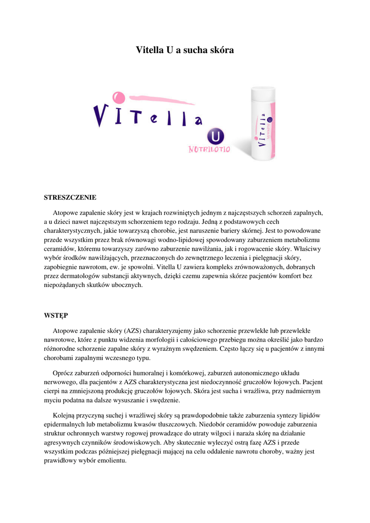 Vitella U a sucha skóra STRESZCZENIE Atopowe zapalenie skóry jest w krajach rozwiniętych jednym z najczęstszych schorzeń zapalnych, a u dzieci nawet najczęstszym schorzeniem tego rodzaju. Jedną z podstawowych cech charakterystycznych, jakie towarzyszą chorobie, jest naruszenie bariery skórnej. Jest to powodowane przede wszystkim przez brak równowagi wodno-lipidowej spowodowany zaburzeniem metabolizmu ceramidów, któremu towarzyszy zarówno zaburzenie nawilżania, jak i rogowacenie skóry. Właściwy wybór środków nawilżających, przeznaczonych do zewnętrznego leczenia i pielęgnacji skóry, zapobiegnie nawrotom, ew. je spowolni. Vitella U zawiera kompleks zrównoważonych, dobranych przez dermatologów substancji aktywnych, dzięki czemu zapewnia skórze pacjentów komfort bez niepożądanych skutków ubocznych. WSTĘP Atopowe zapalenie skóry (AZS) charakteryzujemy jako schorzenie przewlekłe lub przewlekłe nawrotowe, które z punktu widzenia morfologii i całościowego przebiegu można określić jako bardzo różnorodne schorzenie zapalne skóry z wyraźnym swędzeniem. Często łączy się u pacjentów z innymi chorobami zapalnymi wczesnego typu. Oprócz zaburzeń odporności humoralnej i komórkowej, zaburzeń autonomicznego układu nerwowego, dla pacjentów z AZS charakterystyczna jest niedoczynność gruczołów łojowych. Pacjent cierpi na zmniejszoną produkcję gruczołów łojowych. Skóra jest sucha i wrażliwa, przy nadmiernym myciu podatna na dalsze wysuszanie i swędzenie. Kolejną przyczyną suchej i wrażliwej skóry są prawdopodobnie także zaburzenia syntezy lipidów epidermalnych lub metabolizmu kwasów tłuszczowych. Niedobór ceramidów powoduje zaburzenia struktur ochronnych warstwy rogowej prowadzące do utraty wilgoci i naraża skórę na działanie agresywnych czynników środowiskowych. Aby skutecznie wyleczyć ostrą fazę AZS i przede wszystkim podczas późniejszej pielęgnacji mającej na celu oddalenie nawrotu choroby, ważny jest prawidłowy wybór emolientu. WYNIKI W badaniu, przeprowadzonym w Republice Czeskiej i Republice Słowackiej, obserwowanych było 153 pacjentów z suchą skórą. Do badania zostali włączeni zarówno pacjenci, u których choroba wystąpiła po raz pierwszy, jak i pacjenci, którzy byli już w przeszłości leczeni. Kobiety stanowiły 70% obserwowanych osób. Średnia wieku wyniosła 27,3 lat. Przeważającą część stanowili pacjenci z AZS, następnie pacjenci z hiperkeratozą , łuszczycą, kserozą lub łojotokowym zapaleniem skóry (Tab. nr 1). Większa część pacjentów była już leczona w przeszłości – przede wszystkim antybiotykami, kortykoidami, emolientami, immunomodulatorami czy ich kombinacją (Tab. nr 2). W badaniu do regeneracji skóry u pacjentów została zastosowana Vitella U (4% mocznik, witaminy A, E, panthenol, olej z oliwek). Przez okres jednego miesiąca Vitella U była aplikowana na dotknięte chorobą miejsca 1-3 razy dziennie, zgodnie z zaleceniem lekarza. Wyraźniejsze polepszenie stanu zmian skórnych nastąpiło u ponad 89% pacjentów (Tab. nr 3). Równocześnie z leczeniem obserwowano także wystąpienie działań niepożądanych. U ponad 96% obserwowanych pacjentów nie zostały odnotowane żadne skutki uboczne (Tab. nr 4). PODSUMOWANIE U pacjentów, u których choroba jest połączona z suchą skórą, niezmiernie ważny jest wybór emolientu. 153 pacjentów, dotkniętych przeważnie atopowym zapaleniem skóry, było wcześniej leczonych głównie antybiotykami, kortykoidami, immunomodulatorami, ich połączeniem, albo w ogóle nie było leczonych. Przez okres badania w celu regeneracji skóry wszystkie obserwowane osoby aplikowały na dotknięte chorobą miejsca Vitellę U 1-3 razy dziennie. Wyraźniejszą poprawę stanu zmian chorobowych odnotowało prawie 90% pacjentów, u ponad 96% z nich nie zaobserwowano żadnych skutków ubocznych. Vitella U, która oprócz 4% mocznika zawiera także witaminy A, E, panthenol i olej z oliwek, jest znakomitym preparatem dla pacjentów z suchą skórą, którego działanie zostało potwierdzone przez czeskich i słowackich dermatologów.