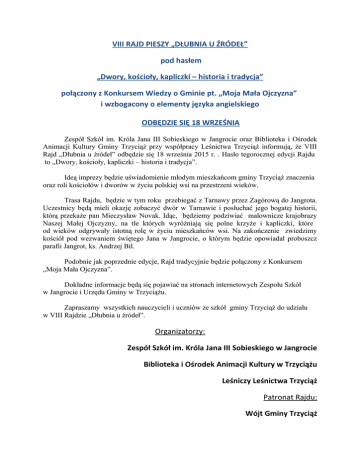 VIII RAJD PIESZY „DŁUBNIA U ŹRÓDEŁ” pod hasłem „Dwory, kościoły, kapliczki – historia i tradycja” połączony z Konkursem Wiedzy o Gminie pt. „Moja Mała Ojczyzna” i wzbogacony o elementy języka angielskiego ODBĘDZIE SIĘ 18 WRZEŚNIA Zespół Szkół im. Króla Jana III Sobieskiego w Jangrocie oraz Biblioteka i Ośrodek Animacji Kultury Gminy Trzyciąż przy współpracy Leśnictwa Trzyciąż informują, że VIII Rajd „Dłubnia u źródeł” odbędzie się 18 września 2015 r. . Hasło tegorocznej edycji Rajdu to „Dwory, kościoły, kapliczki – historia i tradycja”. Ideą imprezy będzie uświadomienie młodym mieszkańcom gminy Trzyciąż znaczenia oraz roli kościołów i dworów w życiu polskiej wsi na przestrzeni wieków. Trasa Rajdu, będzie w tym roku przebiegać z Tarnawy przez Zagórową do Jangrota. Uczestnicy będą mieli okazję zobaczyć dwór w Tarnawie i posłuchać jego bogatej historii, którą przekaże pan Mieczysław Novak. Idąc, będziemy podziwiać malownicze krajobrazy Naszej Małej Ojczyzny, na tle których wyróżniają się polne krzyże i kapliczki, które od wieków odgrywały istotną rolę w życiu mieszkańców wsi. Na zakończenie zwiedzimy kościół pod wezwaniem świętego Jana w Jangrocie, o którym będzie opowiadał proboszcz parafii Jangrot, ks. Andrzej Bil. Podobnie jak poprzednie edycje, Rajd tradycyjnie będzie połączony z Konkursem „Moja Mała Ojczyzna”. Dokładne informacje będą się pojawiać na stronach internetowych Zespołu Szkół w Jangrocie i Urzędu Gminy w Trzyciążu. Zapraszamy wszystkich nauczycieli i uczniów ze szkół gminy Trzyciąż do udziału w VIII Rajdzie „Dłubnia u źródeł”. Organizatorzy: Zespół Szkół im. Króla Jana III Sobieskiego w Jangrocie Biblioteka i Ośrodek Animacji Kultury w Trzyciążu Leśniczy Leśnictwa Trzyciąż Patronat Rajdu: Wójt Gminy Trzyciąż Rys. Weronika Gamrat Regulamin I. Cele Rajdu: • Popularyzacja turystyki pieszej; • Poszerzanie i doskonalenie wiedzy o regionie, w którym mieszkamy; • Rozwijanie postaw patriotycznych; •Kształtowanie potrzeby najbliższym otoczeniu; poszukiwania informacji o swoim • Rozbudzanie poczucia identyfikacji z określoną tradycją historyczną i kulturową; • Uwrażliwienie na piękno i wartości Naszej Małej Ojczyzny; • Promowanie, wykorzystywanie i doskonalenie języka angielskiego; • Kształtowanie świadomości ekologicznej. II. Termin Rajdu: 18 września 2015r. III. Zakończenie Rajdu: Zespół Szkół w Jangrocie IV. Warunki uczestnictwa: • W Rajdzie mogą brać udział po dwie drużyny (6-10 osób) złożone z uczniów szkół podstawowych i gimnazjów wraz z opiekunami. • Drużyna powinna być zaopatrzona w apteczkę. • Ponadto każdy uczestnik winien stawić się na Rajd w stroju turystycznym. • Należy również uiścić opłatę za znaczek rajdowy i ubezpieczenie (3 zł od uczestnika) do dn. 14 września 2015r. w sekretariacie ZS w Jangrocie. V. Uprawnienia uczestników: • Dowóz na miejsce startu i odwóz do macierzystej szkoły po zakończeniu Rajdu, • Znaczek rajdowy i mapa trasy, • Ubezpieczenie, • Dyplom uczestnictwa dla drużyny, • Posiłek na mecie. VI. Obowiązki uczestników: • Uczestnicy biorą udział w Rajdzie na odpowiedzialność zgłaszającej szkoły. •Uczestnicy odpowiadają osobiście za wypadki i szkody wynikłe z ich winy w czasie trwania Rajdu. • Każdy uczestnik jest zobowiązany do przestrzegania bezpieczeństwa i poszanowania przyrody. • Zgłoszone drużyny równocześnie zobowiązują się do wzięcia udziału w konkursach towarzyszących imprezie. VII. Zgłoszenie uczestnictwa: • Należy przesłać faxem lub listownie za pośrednictwem szkoły do sekretariatu Zespołu Szkół w Jangrocie, Jangrot 83, 32-353 Trzyciąż, tel./fax 12 3894012, e-mail: [email protected], do dnia 14 września 2015r. do godz. 14:00. • Wzór zgłoszenia dołączony jest do regulaminu. VIII. Trasy Rajdu: Szkoły podstawowe: Zagórowa – Trzyciąż -Jangrot Gimnazja: Tarnawa – Zagórowa - Jangrot IX. Start od godziny 9:00 (dokładna informacja o godzinie startu będzie ustalona i podana telefonicznie każdej szkole osobno ze względu na kolejność dowozów). X. Konkursy towarzyszące Rajdowi: Konkurs Wiedzy o Gminie „Moja Mała Ojczyzna” z uwzględnieniem wiedzy o dworach w Tarnawie i Glanowie oraz o kościołach z terenu gminy Trzyciąż; Konkurs Przyrodniczy: flora i fauna Krajobrazowego; zagadnienia ekologiczne; Konkurs Rajdu. XI. Dłubniańskiego Parku Języka Angielskiego – szczegółowe informacje w przeddzień Organizatorzy zastrzegają prawo do zmiany terminu VIII Rajdu Dłubnia u atmosferycznych. źródeł” w razie niesprzyjających warunków ZAPRASZAMY DO UDZIAŁU! Zgłoszenie drużyny w Rajdzie ……………………………………. …………………………………………….. (pieczątka szkoły) (miejscowość, data) ZGŁOSZENIE NA VIII RAJD PIESZY „DŁUBNIA U ŹRÓDEŁ” ……………………………………………………………………………………………………………………………………………………………. (nazwa i adres szkoły) Zgłasza udział w VIII Rajdzie pieszym „Dłubnia u źródeł” ………………. uczniów klas ………………………. wraz z opiekunem …………………………………………………………………………….. . Podpis dyrektora szkoły