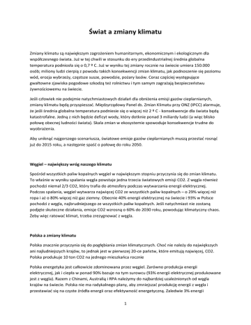 Świat a zmiany klimatu Zmiany klimatu są największym zagrożeniem humanitarnym, ekonomicznym i ekologicznym dla współczesnego świata. Już w tej chwili w stosunku do ery przedindustrialnej średnia globalna temperatura podniosła się o 0,7 º C. Już w wyniku tej zmiany rocznie na świecie umiera 150.000 osób; miliony ludzi cierpią z powodu takich konsekwencji zmian klimatu, jak podnoszenie się poziomu wód, erozja wybrzeży, częstsze susze, powodzie, pożary lasów. Coraz częściej występujące gwałtowne zjawiska pogodowe szkodzą też rolnictwu i tym samym zagrażają bezpieczeństwu żywnościowemu na świecie. Jeśli człowiek nie podejmie natychmiastowych działań dla obniżenia emisji gazów cieplarnianych, zmiany klimatu będą przyspieszać. Międzyrządowy Panel ds. Zmian Klimatu przy ONZ (IPCC) alarmuje, że jeśli średnia globalna temperatura podniesie się o więcej niż 2 º C - konsekwencje dla świata będą katastrofalne. Jedną z nich będzie deficyt wody, który dotknie ponad 3 miliardy ludzi (a więc blisko połowę obecnej ludności świata). Skala zmian w ekosystemie spowoduje konsekwencje trudne do wyobrażenia. Aby uniknąć najgorszego scenariusza, światowe emisje gazów cieplarnianych muszą przestać rosnąć już do 2015 roku, a następnie spaść o połowę do roku 2050. Węgiel – największy wróg naszego klimatu Spośród wszystkich paliw kopalnych węgiel w największym stopniu przyczynia się do zmian klimatu. To właśnie w wyniku spalania węgla powstaje jedna trzecia światowych emisji CO2. Z węgla również pochodzi niemal 2/3 CO2, który trafia do atmosfery podczas wytwarzania energii elektrycznej. Podczas spalania, węgiel wytwarza najwięcej CO2 ze wszystkich paliw kopalnych – o 29% więcej niż ropa i aż o 80% więcej niż gaz ziemny. Obecnie 40% energii elektrycznej na świecie i 93% w Polsce pochodzi z węgla, najbrudniejszego ze wszystkich paliw kopalnych. Jeśli natychmiast nie zostaną podjęte skuteczne działania, emisje CO2 wzrosną o 60% do 2030 roku, powodując klimatyczny chaos. Żeby więc ratować klimat, trzeba zrezygnować z węgla. Polska a zmiany klimatu Polska znacznie przyczynia się do pogłębiania zmian klimatycznych. Choć nie należy do największych ani najludniejszych krajów, to jednak jest w pierwszej 20-ce państw, które emitują najwięcej, CO2. Polska produkuje 10 ton CO2 na jednego mieszkańca rocznie Polska energetyka jest całkowicie zdominowana przez węgiel. Zarówno produkcja energii elektrycznej, jak i ciepła w ponad 90% bazuje na tym surowcu (93% energii elektrycznej produkowane jest z węgla). Razem z Chinami, Australią i RPA należymy do najbardziej uzależnionych od węgla krajów na świecie. Polska nie ma radykalnego plany, aby zmniejszać produkcję energii z węgla i przestawiać się na czyste źródła energii oraz efektywność energetyczną. Zaledwie 3% energii 1 elektrycznej w Polsce pochodzi z przyjaznych dla klimatu i środowiska odnawialnych źródeł, takich jak biomasa, woda, wiatr, słońce, czy geotermia, choć ich potencjał możliwy do wykorzystania do 2020 jest ponad 10-krotnie wyższy. Dużym problemem polskiej energetyki jest scentralizowanie produkcji. Energię wytwarza się przede wszystkim w wielkich elektrowniach, zamiast w rozproszonych, lokalnych instalacjach. Oznacza to ogromne straty przy przesyle prądu, a także brak bezpieczeństwa energetycznego w wypadku np. awarii i konieczności wyłączenia całego bloku o mocy kilkuset megawatów. Większość polskiej energii elektrycznej powstaje w nieefektywnych elektrowniach, (które marnują ciepło), zamiast w mniejszych i zlokalizowanych blisko odbiorców ciepła elektrociepłowniach, co prowadzi do bezpowrotnej straty 2/3 energii zawartej w paliwie. Polska jest też niechlubnym 'liderem' w Europie pod względem energochłonności gospodarki. Aby wyprodukować 1000 euro PKB, zużywamy ponad 2 razy więcej energii niż średnia w 25 krajach Unii Europejskiej. Przygotowana przez rząd „Polityka energetyczna Polski do 2030 r.” to ogólnikowy dokument bez wizji unowocześnienia polskiej energetyki. Polski rząd przedstawił projekt „Polityki Energetycznej do 2030”. Jest to jedyny dokument o strategicznym znaczeniu, który przedstawia koncepcję rozwoju energetyki w naszym kraju. Jego podstawową wadą jest kompletny brak progresywnej i dalekowzrocznej wizji unowocześnienia polskiej energetyki i jakiejkolwiek próby uniezależnienia jej od najbrudniejszego paliwa, jakim jest węgiel. Projekt „Polityki” przewiduje wprawdzie wzrost wykorzystania OZE (odnawialne źródła energii) do 15% w roku 2020 r. (zgodnie z propozycją Komisji Europejskiej) i do 20% w 2030 r. Zmiany klimatu w Polsce Już dziś tak niegdyś typowe wiosenne powodzie roztopowe czy zamarzanie Bałtyku praktycznie stały się wspomnieniem. Nasilają się za to zjawiska wcześniej nietypowe, takie jak fale upałów, susze, gwałtowne burze, trąby powietrzne czy powodzie opadowe. Statystycznie polskie zimy są coraz cieplejsze, zima nadchodzi późno i szybko się kończy, wydłuża się okres wegetacji. Nie występują tak kiedyś powszechne wiosenne powodzie opadowe. Bałtyk od lat ’40 XX wieku już nie zamarza. Na południu Polski zaczęliśmy uprawę afrykańskiego sorgo. Klimat Dolnego Śląska już dziś odpowiada klimatowi słynnego z uprawy winorośli węgierskiego rejonu Tokaju sprzed 20 lat. Przesunięcie się strefy zwrotnikowej na północ powoduje z kolei częstszy dopływ do Polski rozgrzanego powietrza zwrotnikowego, gdzie zderza się z chłodnym powietrzem z rejonów polarnych, co w okresie letnim powoduje intensyfikację burz i nawałnic i powstawanie trąb powietrznych. Szczególnie niebezpieczne są ciepłe i niosące dużo wody niże genueńskie, powodujące największe powodzie. To wszystko stało się już dopiero na początku rozkręcających się zmian klimatu. Jak więc zmieni się klimat Polski w XXI wiek