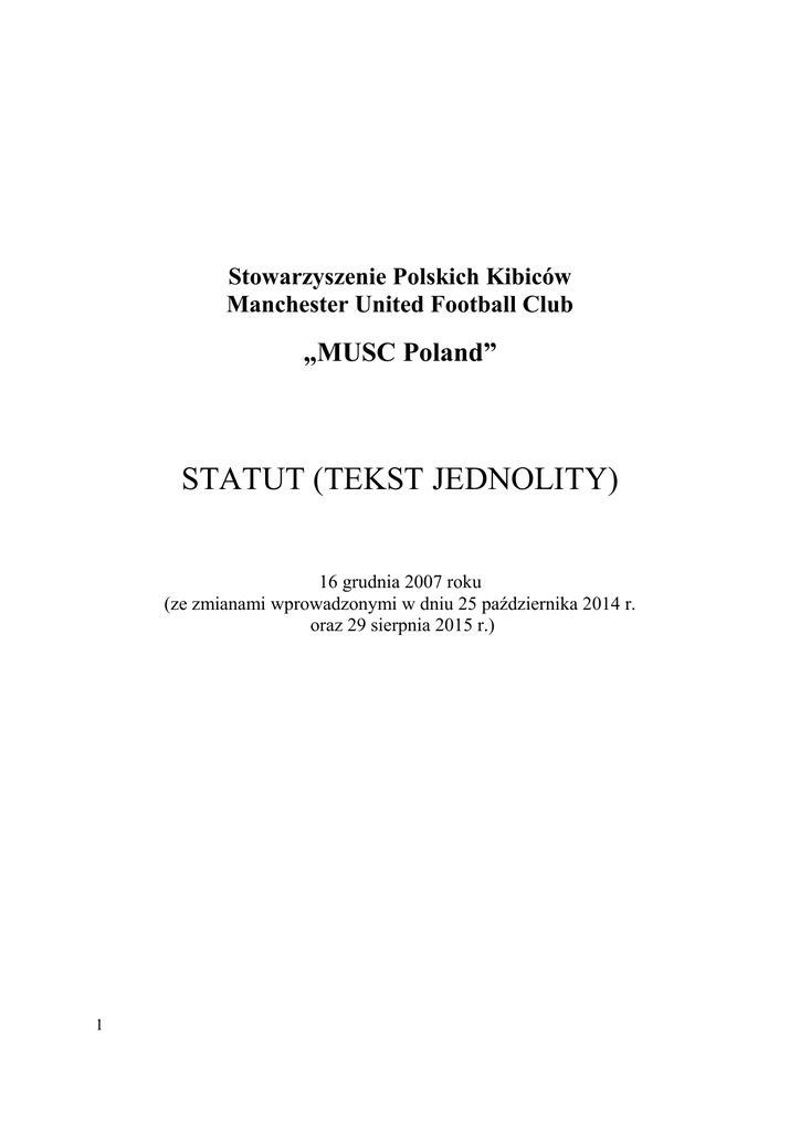 Stowarzyszenie Polskich Kibiców Manchester United Football Club „MUSC Poland” STATUT (TEKST JEDNOLITY) 16 grudnia 2007 roku (ze zmianami wprowadzonymi w dniu 25 października 2014 r. oraz 29 sierpnia 2015 r.) 1 ROZDZIAŁ 1. POSTANOWIENIA OGÓLNE ROZDZIAŁ 2. CELE I ŚRODKI DZIAŁANIA _ ROZDZIAŁ 3. CZŁONKOWIE- PRAWA I OBOWIĄZKI ROZDZIAŁ 4. WŁADZE MUSC POLAND ROZDZIAŁ 5. MAJĄTEK I FUNDUSZE MUSC POLAND ROZDZIAŁ 6. POSTANOWIENIA KOŃCOWE 2 3 Rozdział 1 Postanowienia ogólne § 1. Stowarzyszenie nosi nazwę: Stowarzyszenie Polskich kibiców Manchester United Football Club "MUSC Poland", w dalszych postanowieniach statutu, nazywane MUSC Poland. § 2. MUSC Poland jest zrzeszeniem osób fizycznych, powstałym dla jednoczenia polskich kibiców klubu piłkarskiego Manchester United . § 3. Siedzibą MUSC Poland jest Czeladź. § 4. Nazwa i symbole zawarte są w załączniku nr 1 i są objęte ochroną prawną. § 5. Terenem działania Stowarzyszenia jest Rzeczpospolita Polska. MUSC Poland w ramach prawnych działań może również działać poza granicami Rzeczpospolitej Polskiej. § 6. MUSC Poland jest zawiązane na czas nieokreślony. §7. MUSC Poland posiada osobowość prawną. Działa na podstawie przepisów ustawy z dnia 7 kwietnia 1989 r. „Prawo o stowarzyszeniach” (Dz. U. z 2001 r. Nr 79, poz. 855 z późn. zm.) oraz ustawy z dnia 25 czerwca 2010 o sporcie (Dz. U. z 2010r. Nr 127, poz. 857). § 8. MUSC Poland może należeć do innych krajowych i zagranicznych organizacji o podobnych celach, o ile nie narusza to przepisów prawa polskiego. § 9. Oficjalną stroną internetową MUSC Poland jest strona www.musc.pl. Stanowi ona główne źródło informacji na temat Stowarzyszenia. § 10. Oficjalne forum internetowe MUSC Poland znajduje się pod adresem www.forum.musc.pl. Stanowi ono wirtualne miejsce spotkań członków Stowarzyszenia. 4 Rozdział 2 Cele i środki działania § 11. Cele MUSC Poland: a) b) c) d) zrzeszanie polskich kibiców klubu piłkarskiego Manchester United, nawiązywanie kontaktów z kibicami na terenie Rzeczpospolitej Polskiej, pomoc przy nawiązywaniu kontaktów z kibicami w innych krajach, propagowanie dobrego imienia i sukcesów oraz dbałość o tradycję klubu Manchester United na terenie Rzeczpospolitej Polskiej, e) organizacja wyjazdów na mecze Manchester United, f) rozwijanie i propagowanie idei czynnego kibicowania, inicjatyw, postaw i działań sprzyjających integracji kibiców klubu piłkarskiego Manchester United, g) wspieranie organizacyjne i rzeczowe osób fizycznych oraz jednostek organizacyjnych, którę podejmują wyżej wymienione działania. § 12. MUSC Poland realizuje swoje cele w szczególności poprzez: a) b) c) d) różnego typu spotkaniach kibiców Manchester United, kontakty nawiązane w sieci Internet, współpracę z mediami, prowadzenie strony internetowej, która spełnia rolę głównego źródła informacji MUSC Poland, e) uczestnictwo jego członków (indywidualnie lub drużynowo) w imprezach o charakterze sportowym. § 13. MUSC Poland nie prowadzi działalności gospodarczej. 5 Rozdział 3. Członkowie- prawa i obowiązki § 14. Członkowie MUSC Poland dzielą się na zwyczajnych, honorowych i wspierających. § 15. Członkiem zwyczajnym, MUSC Poland może być każda osoba fizyczna, która: a) jest obywatelem Rzeczpospolitej Polskiej, b) jest kibicem drużyny piłkarskiej Manchester United F.C., c) nie jest członkiem innego Stowarzyszenia, zrzeszającego kibiców innych drużyn (wyjątek stanowią Stowarzyszenia kibiców, klubów zrzeszonych w Polskim Związku Piłki Nożnej), d) złoży wypełnioną deklarację członkowską, e) w dniu składania deklaracji ma ukończone 16 lat lub poniżej 16 lat, ale jedynie za zgodą przedstawiciela ustawowego, bez prawa udziału w głosowaniu na walnych zebraniach członków oraz bez korzystania z czynnego i biernego prawa wyborczego do władz Stowarzyszenia, z uwzględnieniem zastrzeżeń zawartych w art. 3 ust. 2 ustawy z dnia 7 kwietnia 1989 „Prawo o stowarzyszeniach”. § 16. Członek przyjmowany jest decyzją Zarządu po złożeniu pisemnej deklaracji, której wzór zawarty jest w załączniku nr 2 oraz po wpłaceniu pierwszej składki. § 17. Członkowie zwyczajni przyjmowani są w ciągu naboru powszechnego, który odbywa się raz do roku w miesiącu kwietniu. § 18. Informacje organizacyjne o naborze powszechnym zostaną podane do wiadomości na 30 dni przed rozpoczęciem naboru poprzez stronę informacyjną. § 19. Członek zwyczajny ma prawo: a) czynnego i biernego prawa wyborczego do władz MUSC Poland na zasadach określonych w niniejszym statucie, b) zgłaszania wniosków i propozycji oraz wypowiadania opinii w sprawie działalności MUSC Poland, c) uczestnictwa w zebraniach, spotkaniach, wyjazdach i imprezach organizowanych przez MUSC Poland, z uwzględnieniem ustawy z dnia 20 marca 2009 r. o bezpieczeństwie imprez masowych, d) korzystania z majątku i dorobku MUSC Poland, e) posiadania legitymacji MUSC Poland oraz noszenia odznaki MUSC Poland, 6 f) współtworzenia strony www.forum.musc.pl. internetowej www.musc.pl oraz forum internetowego § 20. Członek zwyczajny ma obowiązek: a) przestrzegania statutu MUSC Poland oraz uchwał Zarządu Stowarzyszenia, b) brania czynnego udziału w działaniach MUSC Poland i realizacji jego zadań i celów, c) opłacania w terminie składek członkowskich, d) dbałości o dobre imię MUSC Poland. § 21. Składki należy opłacać raz do roku w terminie do ostatniego dnia miesiąca w którym zostało uzyskane członkostwo. § 21a. Wysokość składki ustala Zarząd w miesiącu marcu na podstawie następującego wzoru: Składka = koszt One united x kurs funta (powiększony o 5%) z dnia podjęcia uchwały + roczny średni koszt utrzymania stowarzyszenia przypadający na osobę (opłaty, domeny, legitymacje itp.) liczony na podstawie 3 ostatnich lat. § 22 Członkostwo zwyczajne ustępuje na skutek: a) decyzji dobrowolnej, zg