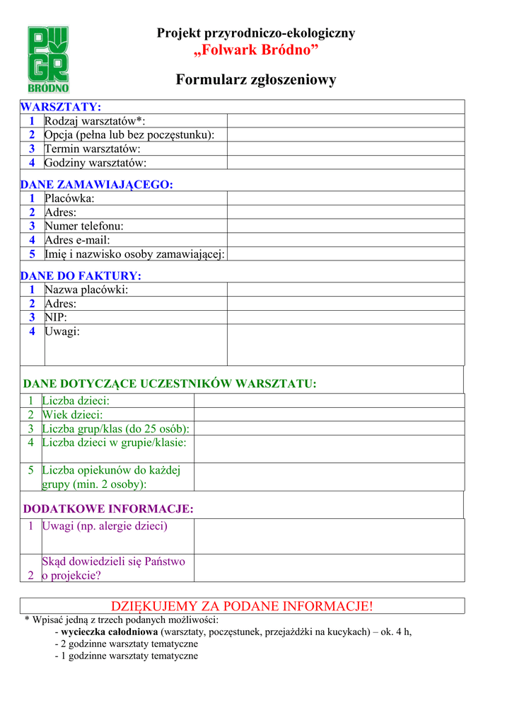 Projekt przyrodniczo-ekologiczny „Folwark Bródno” Formularz zgłoszeniowy WARSZTATY: 1 Rodzaj warsztatów*: 2 Opcja (pełna lub bez poczęstunku): 3 Termin warsztatów: 4 Godziny warsztatów: DANE ZAMAWIAJĄCEGO: 1 Placówka: 2 Adres: 3 Numer telefonu: 4 Adres e-mail: 5 Imię i nazwisko osoby zamawiającej: DANE DO FAKTURY: 1 Nazwa placówki: 2 Adres: 3 NIP: 4 Uwagi: DANE DOTYCZĄCE UCZESTNIKÓW WARSZTATU: 1 Liczba dzieci: 2 Wiek dzieci: 3 Liczba grup/klas (do 25 osób): 4 Liczba dzieci w grupie/klasie: 5 Liczba opiekunów do każdej grupy (min. 2 osoby): DODATKOWE INFORMACJE: 1 Uwagi (np. alergie dzieci) Skąd dowiedzieli się Państwo 2 o projekcie? DZIĘKUJEMY ZA PODANE INFORMACJE! * Wpisać jedną z trzech podanych możliwości: - wycieczka całodniowa (warsztaty, poczęstunek, przejażdżki na kucykach) – ok. 4 h, - 2 godzinne warsztaty tematyczne - 1 godzinne warsztaty tematyczne REGULAMIN Prosimy o uważne przeczytanie. 1. Organizacją warsztatów zajmuje się firma „PGR Bródno” Sp. z o.o. 2. Cena za realizację pełnego programu od jednego uczestnika to 30,00 zł. Cena zawiera: • zwiedzanie zagród ze zwierzętami i chaty ( wycieczka zoologiczna) // poletek botanicznych, spichlerza, szklarni i wystawy maszyn rolniczych ( wycieczka botaniczna ) • opiekę i warsztaty prowadzone przez 1 animatora, • poczęstunek (kiełbaski z grilla, pieczywo, ketchup, sok) // na życzenie zdrowsza wersja poczęstunku ( naleśniki, placki z jabłkami lub ryż ) • przejażdżki na kucykach, • karty zadań, które na koniec stworzą „Podręcznik Małego Zoologa” ( wycieczka zoologiczna) lub „Poradnik Małego Botanika” ( wycieczka botaniczna). Istnieje możliwość obniżenia ceny do 25,00 zł, wtedy program nie zawiera poczęstunku. 3. Jako alternatywę proponujemy również warsztaty tematyczne: - 2 godzinne warsztaty w cenie 20 zł od uczestnika, - 1 godzinne warsztaty w cenie15 zł od uczestnika. 4. Grupa powinna mieć minimum 2 opiekunów. 5. Opiekunowie biorą czynny udział w warsztatach. 6. Warunkiem rezerwacji terminu warsztatów jest wypełnienie i odesłanie formularza zamówieniowego. 7. Podczas rezerwacji należy podać planowaną liczbę dzieci. Ostateczną liczbę dzieci należy zgłosić najpóźniej w dniu roboczym poprzedzającym zaplanowane warsztaty. 8. Opłata za przeprowadzone warsztaty przyjmowana jest po ich realizacji w kasie „Folwarku Bródno” Istnieje możliwość wystawienia faktury VAT. 9. Za uczestników warsztatów uważane są wszystkie obecne dzieci, biorące udział w którejkolwiek z aktywności podczas warsztatów. 10. Nauczyciele oraz opiekunowie grupy (max. do 5 osób na 25 dzieci) nie płacą za warsztaty. 11. Dzieci nauczycieli płacą połowę stawki. 12. Dzieci podczas warsztatów znajdują się pod opieką animatora oraz nauczycieli. 13. Przy wypełnianiu formularza należy zwrócić szczególną uwagę na wpisanie alergii dzieci (z zaznaczeniem imion i nazwisk dzieci). 14. Organizator zastrzega sobie możliwość zmian w ustalonym scenariuszu wynikające z kondycji i energii dzieci, jak również pogody. 15. Wysłanie niniejszego formularza jest równoznaczne ze zgodą na otrzymywanie treści informacyjnych dotyczących oferty „Folwarku Bródno” 16. Odesłanie wypełnionego niniejszego formularza zamówieniowego jest równoznaczne z wyrażeniem zgody na robienie zdjęć podczas animacji oraz wyrażeniem zgody na wykorzystywanie ich w celach reklamowych przez firmę „PGR Bródno” Sp. z o.o. 17. W razie uwag dotyczących któregoś z punktów, prosimy zamieścić je w tabelce poniżej. UWAGI