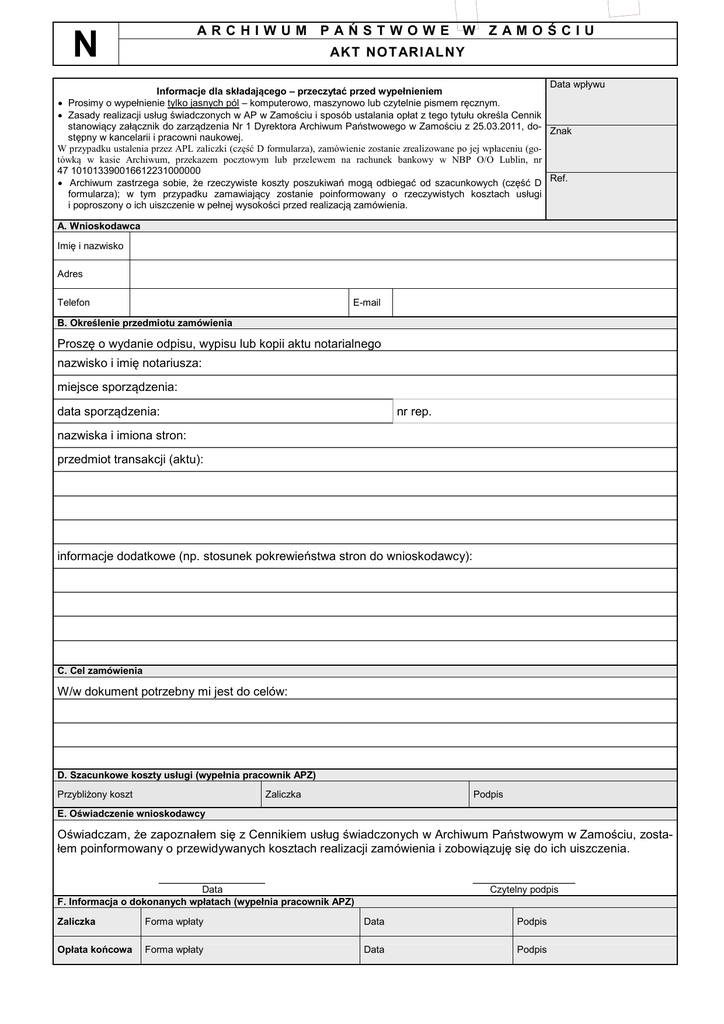ARCHIWUM N PAŃSTWOWE W ZAMOŚCIU AKT NO TARI ALNY Data wpływu Informacje dla składającego – przeczytać przed wypełnieniem • Prosimy o wypełnienie tylko jasnych pól – komputerowo, maszynowo lub czytelnie pismem ręcznym. • Zasady realizacji usług świadczonych w AP w Zamościu i sposób ustalania opłat z tego tytułu określa Cennik stanowiący załącznik do zarządzenia Nr 1 Dyrektora Archiwum Państwowego w Zamościu z 25.03.2011, doZnak stępny w kancelarii i pracowni naukowej. W przypadku ustalenia przez APL zaliczki (część D formularza), zamówienie zostanie zrealizowane po jej wpłaceniu (gotówką w kasie Archiwum, przekazem pocztowym lub przelewem na rachunek bankowy w NBP O/O Lublin, nr 47 101013390016612231000000 • Archiwum zastrzega sobie, że rzeczywiste koszty poszukiwań mogą odbiegać od szacunkowych (część D Ref. formularza); w tym przypadku zamawiający zostanie poinformowany o rzeczywistych kosztach usługi i poproszony o ich uiszczenie w pełnej wysokości przed realizacją zamówienia. A. Wnioskodawca Imię i nazwisko Adres Telefon E-mail B. Określenie przedmiotu zamówienia Proszę o wydanie odpisu, wypisu lub kopii aktu notarialnego nazwisko i imię notariusza: miejsce sporządzenia: data sporządzenia: nr rep. nazwiska i imiona stron: przedmiot transakcji (aktu): informacje dodatkowe (np. stosunek pokrewieństwa stron do wnioskodawcy): C. Cel zamówienia W/w dokument potrzebny mi jest do celów: D. Szacunkowe koszty usługi (wypełnia pracownik APZ) Przybliżony koszt Zaliczka Podpis E. Oświadczenie wnioskodawcy Oświadczam, że zapoznałem się z Cennikiem usług świadczonych w Archiwum Państwowym w Zamościu, zostałem poinformowany o przewidywanych kosztach realizacji zamówienia i zobowiązuję się do ich uiszczenia. Data F. Informacja o dokonanych wpłatach (wypełnia pracownik APZ) Czytelny podpis Zaliczka Forma wpłaty Data Podpis Opłata końcowa Forma wpłaty Data Podpis