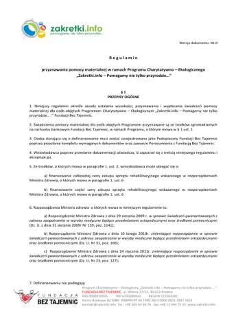 Wersja dokumentu: N1.0 Regulamin przyznawania pomocy materialnej w ramach Programu Charytatywno – Ekologicznego „Zakretki.info – Pomagamy nie tylko przyrodzie…” §1 PRZEPISY OGÓLNE 1. Niniejszy regulamin określa zasady ustalania wysokości, przyznawania i wypłacania świadczeń pomocy materialnej dla osób objętych Programem Charytatywno – Ekologicznym „Zakretki.info – Pomagamy nie tylko przyrodzie… .” Fundacji Bez Tajemnic. 2. Świadczenia pomocy materialnej dla osób objętych Programem przyznawane są ze środków zgromadzonych na rachunku bankowym Fundacji Bez Tajemnic, w ramach Programu, o którym mowa w § 1 ust. 1 3. Osoba starająca się o dofinansowanie musi zostać zarejestrowana jako Podopieczny Fundacji Bez Tajemnic poprzez przesłanie kompletu wymaganych dokumentów oraz zawarcie Porozumienia z Fundacją Bez Tajemnic. 4. Wnioskodawca poprzez przesłanie dokumentacji oświadcza, iż zapoznał się z treścią niniejszego regulaminu i akceptuje go. 5. Ze środków, o których mowa w paragrafie 1. ust. 2, wnioskodawca może ubiegać się o: a) finansowanie całkowitej ceny zakupu sprzętu rehabilitacyjnego wskazanego w rozporządzeniach Ministra Zdrowia, o których mowa w paragrafie 1. ust. 6 b) finansowanie części ceny zakupu sprzętu rehabilitacyjnego wskazanego w rozporządzeniach Ministra Zdrowia, o których mowa w paragrafie 1. ust. 6 6. Rozporządzenia Ministra zdrowia o których mowa w niniejszym regulaminie to: a) Rozporządzenie Ministra Zdrowia z dnia 29 sierpnia 2009 r. w sprawie świadczeń gwarantowanych z zakresu zaopatrzenia w wyroby medyczne będące przedmiotami ortopedycznymi oraz środkami pomocniczymi (Dz. U. z dnia 31 sierpnia 2009r Nr 139, poz. 1141); b) Rozporządzenie Ministra Zdrowia z dnia 10 lutego 2010r. zmieniające rozporządzenie w sprawie świadczeń gwarantowanych z zakresu zaopatrzenia w wyroby medyczne będące przedmiotami ortopedycznymi oraz środkami pomocniczymi (Dz. U. Nr 31, poz. 166); c) Rozporządzenie Ministra Zdrowia z dnia 24 stycznia 2011r. zmieniające rozporządzenie w sprawie świadczeń gwarantowanych z zakresu zaopatrzenia w wyroby medyczne będące przedmiotami ortopedycznymi oraz środkami pomocniczymi (Dz. U. Nr 23, poz. 127); 7. Dofinansowaniu nie podlegają: Program Charytatywno – Ekologiczny „Zakretki.info – Pomagamy nie tylko przyrodzie… .” FUNDACJA BEZ TAJEMNIC, ul. Witosa 27/12, 30-612 Kraków KRS 0000410935 NIP 6793080042 REGON 122504281 Konto Bankowe BZ WBK: WBKPPLPP 04 1090 2053 0000 0001 1847 3323 [email protected] Tel.: +48 505 63 84 76 fax: +48 12 444 75 53 www.zakretki.info a) rehabilitacja; b) turnusy rehabilitacyjne; c) zabiegi medyczne (w tym operacje); d) sprzęt rehabilitacyjny nie posiadający uzasadnienia medycznego w rozwoju Podopiecznego wnioskodawcy; e) sprzęt rehabilitacyjny nie posiadający wymaganych dokumentów poświadczających jego realne działanie rehabilitacyjne; f) sprzęt rehabilitacyjny w fazie badań lub w okresie testów; g) sprzęt rehabilitacyjny już zakupiony. §2 KOMISJA DO SPRAW PRZYZNAWANIA ŚWIADCZEŃ 1. Organem uprawnionym do przyznawania świadczeń, o których mowa w §1 ust. 2 jest Komisja ds. przyznawania świadczeń materialnych działająca w porozumieniu z Zarządem Fundacji Bez Tajemnic. . 2. Komisja ds. przyznawania świadczeń materialnych może zasięgać porad biegłych lekarzy, prawników, przedstawicieli instytucji państwowych, rzeczoznawców lub osób posiadających odpowiednie uprawnienia oraz Rady Fundacji w celu uzyskania niezależnej opinii. 3. Komisja ds. przyznawania świadczeń materialnych, w terminie 30 dni od dnia otrzymania wniosku, dokonuje sprawdzenia kompletności złożonego wniosku i informuje Wnioskodawców o ewentualnych brakach. 4. Od decyzji Komisji ds. przyznawania świadczeń materialnych przysługuje prawo odwołania się do Zarządu Fundacji Bez Tajemnic w terminie 14 dni od daty otrzymania decyzji. 5. Wszystkie sprawy dotyczące świadczeń pomocy materialnej wpływające do Zarządu Fundacji Bez Tajemnic w trybie odwoławczym powinny posiadać decyzję Komisji ds. przyznawania świadczeń materialnych. 6. Z prac Komisji ds. przyznawania świadczeń materialnych oraz Zarządu każdorazowo sporządza się protokół, który podpisują odpowiednio członkowie Komisji ds. przyznawania świadczeń materialnych. 7. Obowiązki przewodniczącego Komisji ds. przyznawania świadczeń materialnych pełni osoba wyznaczona przez Zarząd Fundacji przy pozytywnej opinii Rady Fundacji. 8. Nadzór nad działalnością Komisji ds. przyznawania świadczeń materialnych sprawują: Zarząd oraz Rada Fundacji. §3 WARUNKI I ZASADY PRZYZNAWANIA ŚWIADCZEŃ 1. Warunkiem otrzymania świadczenia jest w szczególności przesłanie kompletu dokumentów oraz spełnienie kryteriów opisanych w niniejszym Regulaminie. 2. Beneficjentami Programu „Zakretki.info – Pomagamy nie tylko przyrodzie…” mogą być wyłącznie osoby, które nie ukończyły 18 roku życia w chwili złożenia wniosku o Pomoc do Fundacji Bez Tajemnic. 3. Świadczenia przyznawane są Podopiecznemu znajdującemu się w trudnej sytuacji materialnej, co powinno zostać poświadczone dokumentami o wysokości uzyskiwanego dochodu wszystkich osób pozostających we wspólnym gospodarstwie domowym. W przypadku braku uzyskiwania dochodów należy dodatkowo przesłać: Program Charytatywno – Ekologiczny „Zakretki.info – Pomagamy nie tylko przyrodzie… .” FUNDACJA BEZ TAJEMNIC, ul. Witosa 27/12, 30-612 Kraków KRS 0000410935 NIP 6793080042 REGON 122504281 Konto Bankowe BZ WBK: WBKPPLPP 04 1090 2053 0000 0001 1847 3323 [email protected] Tel.: +48 505 63 84 76 fax: +48 12 444 75 53 www.zakretki.info a) W przypadku osób zarejestrowanych jako osoby bezrobotne - zaświadczenie z urzędu pracy poświadczające zarejestrowanie jako osoba bezrobotna; - z informacją o prawie do zasiłku; b) W przypadku osób niezarejestrowanych jako osoby bezrobotne - pisemne oś