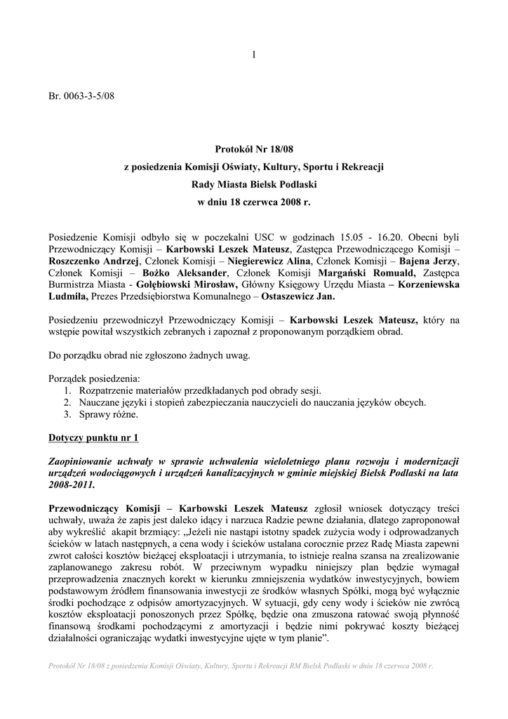 1 Br. 0063-3-5/08 Protokół Nr 18/08 z posiedzenia Komisji Oświaty, Kultury, Sportu i Rekreacji Rady Miasta Bielsk Podlaski w dniu 18 czerwca 2008 r. Posiedzenie Komisji odbyło się w poczekalni USC w godzinach 15.05 - 16.20. Obecni byli Przewodniczący Komisji – Karbowski Leszek Mateusz, Zastępca Przewodniczącego Komisji – Roszczenko Andrzej, Członek Komisji – Niegierewicz Alina, Członek Komisji – Bajena Jerzy, Członek Komisji – BoŜko Aleksander, Członek Komisji Margański Romuald, Zastępca Burmistrza Miasta - Gołębiowski Mirosław, Główny Księgowy Urzędu Miasta – Korzeniewska Ludmiła, Prezes Przedsiębiorstwa Komunalnego – Ostaszewicz Jan. Posiedzeniu przewodniczył Przewodniczący Komisji – Karbowski Leszek Mateusz, który na wstępie powitał wszystkich zebranych i zapoznał z proponowanym porządkiem obrad. Do porządku obrad nie zgłoszono Ŝadnych uwag. Porządek posiedzenia: 1. Rozpatrzenie materiałów przedkładanych pod obrady sesji. 2. Nauczane języki i stopień zabezpieczania nauczycieli do nauczania języków obcych. 3. Sprawy róŜne. Dotyczy punktu nr 1 Zaopiniowanie uchwały w sprawie uchwalenia wieloletniego planu rozwoju i modernizacji urządzeń wodociągowych i urządzeń kanalizacyjnych w gminie miejskiej Bielsk Podlaski na lata 2008-2011. Przewodniczący Komisji – Karbowski Leszek Mateusz zgłosił wniosek dotyczący treści uchwały, uwaŜa Ŝe zapis jest daleko idący i narzuca Radzie pewne działania, dlatego zaproponował aby wykreślić akapit brzmiący: „JeŜeli nie nastąpi istotny spadek zuŜycia wody i odprowadzanych ścieków w latach następnych, a cena wody i ścieków ustalana corocznie przez Radę Miasta zapewni zwrot całości kosztów bieŜącej eksploatacji i utrzymania, to istnieje realna szansa na zrealizowanie zaplanowanego zakresu robót. W przeciwnym wypadku niniejszy plan będzie wymagał przeprowadzenia znacznych korekt w kierunku zmniejszenia wydatków inwestycyjnych, bowiem podstawowym źródłem finansowania inwestycji ze środków własnych Spółki, mogą być wyłącznie środki pochodzące z odpisów amortyzacyjnych. W sytuacji, gdy ceny wody i ścieków nie zwrócą kosztów eksploatacji ponoszonych przez Spółkę, będzie ona zmuszona ratować swoją płynność finansową środkami pochodzącymi z amortyzacji i będzie nimi pokrywać koszty bieŜącej działalności ograniczając wydatki inwestycyjne ujęte w tym planie”. Protokół Nr 18/08 z posiedzenia Komisji Oświaty, Kultury, Sportu i Rekreacji RM Bielsk Podlaski w dniu 18 czerwca 2008 r. 2 Członek Komisji – BoŜko Aleksander skierował pytanie do Prezesa PK dotyczące tego, czy ze środków amortyzacji moŜna pokrywać koszty wydatków. Prezes Przedsiębiorstwa Komunalnego – Ostaszewicz Jan powiedział, Ŝe jest taka moŜliwość, jeśli firma nie posiada pieniędzy na finansowanie wydatków to korzysta ze środków amortyzacji. Członek Komisji – BoŜko Aleksander zapytał, czy w przypadku kiedy Rada ustaliłaby zbyt niską cenę wody, to czy PK moŜe wystąpić do województwa o taka cenę jaka je satysfakcjonuje. Stwierdził, iŜ taki przypadek miał miejsce w ubiegłym roku. Prezes Przedsiębiorstwa Komunalnego – Ostaszewicz Jan poinformował, iŜ takie przypadki nie zdarzają się tylko w naszym mieście, ale w całym kraju. Rada nie podejmuje uchwał zatwierdzających taryfy, a jest to związane ze wzrostem kosztów. PK otrzymało środki unijne, ruszyły budowy i rozbudowy infrastruktury, a to wiąŜe się z kosztami – np podatek od nieruchomości, który w tym przypadku wynosi 2% od wartości PK. Przedsiębiorstwo musi na podatki nazbierać pieniądze. W przypadku, kiedy Rada nie podejmie uchwały, taryfy wchodzą w wersji zaproponowanej przez spółkę. Komisja przystąpiła do głosowania, za przyjęciem wniosku radnego Karbowskiego opowiedziało sie 3 członków, 3 wstrzymało sie od głosu, nikt nie głosował przeciw. Podczas głosowania za przyjęciem uchwały z poprawką w wieloletnim planie rozwoju głosowało 6 członków. Podjęcie uchwały w sprawie zatwierdzenia taryfy za zbiorowe zaopatrzenie w wodę i zbiorowe odprowadzenie ścieków określonej przez Przedsiębiorstwo Komunalne sp. z o.o. W Bielsku Podlaskim. Przewodniczący Komisji – Karbowski Leszek Mateusz stwierdził, Ŝe nastąpi znaczna podwyŜka wody i ścieków, ale jest to zrozumiałe. UwaŜa, iŜ podnoszenie stawki jest nieodzowne, poniewaŜ koszty utrzymania firmy rosną. Poinformował, iŜ niezaleŜnie od tego jakie stanowisko w tej sprawie Rada przyjmie to podwyŜka nastąpi, poniewaŜ ustawa dopuszcza by PK podwyŜszyło stawki niezaleŜnie od tego czy Rada wyraŜa zgodę czy nie. Przewodniczący uwaŜa, Ŝe skoro Rada nie ma na to wpływu, to nie powinna wypowiadać się w tym temacie. UwaŜa, Ŝe niby niepozornie wzrastające koszty mocno dają o sobie znać, podwyŜki dotyczą energii elektrycznej, ciepła, wody. Prezes Przedsiębiorstwa Komunalnego – Ostaszewicz Jan poinformował, iŜ nowa taryfa róŜni się od ubiegłorocznej, poniewaŜ zostały do niej włączone opłaty dodatkowe, które wcześniej były regulowane na podstawie umów cywilno - prawnych. W tej chwili rozporządzenie wykonawcze do ustawy dopuszcza wprowadzenie dodatkowych opłat do taryf. Poinformował, Ŝe opłaty te obowiązują ścieki przemysłowe. Przewodniczący Komisji – Karbowski Leszek Mateusz stwierdził, iŜ pomimo tego, Ŝe taryfa dotyczy ścieków przemysłowych, to i tak będzie odczuwalna dla kaŜdego z nas, poniewaŜ firmy będą podnosiły ceny swoich produktów. Komisja przystąpiła do głosowania, za przyjęciem uchwały opowiedziała się 1 osoba, 2 głosowały Protokół Nr 18/08 z posiedzenia Komisji Oświaty, Kultury, Sportu i Rekreacji RM Bielsk Podlaski w dniu 18 czerwca 2008 r. 3 przeciw, a 3 się wstrzymały. Uchwała została odrzucona. Przewodniczący Komisji – Karbowski Leszek Mateusz podziękował Prezesowi PK za uczestnictw