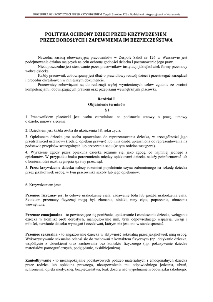 PROCEDURA OCHRONY DZIECI PRZED KRZYWDZENIEM Zespół Szkół nr 126 z Oddziałami Integracyjnymi w Warszawie POLITYKA OCHRONY DZIECI PRZED KRZYWDZENIEM PRZEZ DOROSŁYCH I ZAPEWNIENIA IM BEZPIECZEŃSTWA Naczelną zasadą obowiązującą pracowników w Zespole Szkół nr 126 w Warszawie jest podejmowanie działań mających na celu ochronę godności dziecka i poszanowanie jego praw. Niedopuszczalne jest stosowanie przez pracowników instytucji jakiejkolwiek formy przemocy wobec dziecka. Każdy pracownik zobowiązany jest dbać o prawidłowy rozwój dzieci i przestrzegać zarządzeń i procedur określonych w niniejszym dokumencie. Pracownicy zobowiązani są do realizacji wyżej wymienionych celów zgodnie ze swoimi kompetencjami, obowiązującym prawem oraz przepisami wewnętrznymi placówki. Rozdział I Objaśnienie terminów §1 1. Pracownikiem placówki jest osoba zatrudniona na podstawie umowy o pracę, umowy o dzieło, umowy zlecenia. 2. Dzieckiem jest każda osoba do ukończenia 18. roku życia. 3. Opiekunem dziecka jest osoba uprawniona do reprezentowania dziecka, w szczególności jego przedstawiciel ustawowy (rodzic, opiekun prawny) lub inna osoba uprawniona do reprezentowania na podstawie przepisów szczególnych lub orzeczenia sądu (w tym rodzina zastępcza). 4. Wyrażenie zgody przez opiekuna dziecka rozumie się, jako zgodę, co najmniej jednego z opiekunów. W przypadku braku porozumienia między opiekunami dziecka należy poinformować ich o konieczności rozstrzygnięcia sprawy przez sąd. 5. Przez krzywdzenie dziecka należy rozumieć popełnienie czynu zabronionego na szkodę dziecka przez jakąkolwiek osobę, w tym pracownika szkoły lub jego opiekunów. 6. Krzywdzeniem jest: Przemoc fizyczna- jest to celowe uszkodzenie ciała, zadawanie bólu lub groźba uszkodzenia ciała. Skutkiem przemocy fizycznej mogą być złamania, siniaki, rany cięte, poparzenia, obrażenia wewnętrzne. Przemoc emocjonalna - to powtarzające się poniżanie, upokarzanie i ośmieszanie dziecka, wciąganie dziecka w konflikt osób dorosłych, manipulowanie nim, brak odpowiedniego wsparcia, uwagi i miłości, stawianie dziecku wymagań i oczekiwań, którym nie jest ono w stanie sprostać. Przemoc seksualna - to angażowanie dziecka w aktywność seksualną przez jakąkolwiek inną osobę. Wykorzystywanie seksualne odnosi się do zachowań z kontaktem fizycznym (np. dotykanie dziecka, współżycie z dzieckiem) oraz zachowania bez kontaktu fizycznego (np. pokazywanie dziecku materiałów pornograficznych, podglądanie, ekshibicjonizm). Zaniedbywanie - to niezaspokajanie podstawowych potrzeb materialnych i emocjonalnych dziecka przez rodzica lub opiekuna prawnego, niezapewnienie mu odpowiedniego jedzenia, ubrań, schronienia, opieki medycznej, bezpieczeństwa, brak dozoru nad wypełnianiem obowiązku szkolnego. 7. Danymi osobowymi dziecka jest każda informacja umożliwiająca pełną identyfikację dziecka. 8. Osobą odpowiedzialną za Internet jest pracownik wyznaczony przez dyrektora placówki, który sprawuje nadzór nad korzystaniem z sieci przewodowej i bezprzewodowej na terenie placówki przez dzieci, oraz odpowiada za bezpieczeństwo dzieci w Internecie. 9. Osobami odpowiedzialnymi za Politykę Ochrony Dzieci są wyznaczeni przez dyrektora placówki pracownicy, sprawujący nadzór nad jej realizacją. 10. Zespół Interwencyjny zespół powoływany przez dyrektora placówki w skomplikowanych przypadkach. W skład zespołu wchodzą: osoby odpowiedzialne za Politykę Ochrony Dzieci, pedagog, psycholog, nauczyciele uczący dziecko, dyrektor, pracownicy mający wiedzę o krzywdzeniu dziecka. 11. Zespół interdyscyplinarny - to zespół powoływany przez władze samorządowe w ramach realizowania przedsięwzięć na rzecz przeciwdziałania przemocy w rodzinie. W skład zespołu wchodzą przedstawiciele jednostek organizacyjnych Pomocy Społecznej, Komisji Rozwiązywania Problemów Alkoholowych, Policji, Oświaty, Ochrony Zdrowia oraz organizacji pozarządowych. W skład zespołu interdyscyplinarnego wchodzą również kuratorzy sądowi. Mogą w nim ponadto uczestniczyć prokuratorzy oraz przedstawiciele podmiotów innych niż wymienione. Rozdział II Rozpoznawanie i reagowanie na czynniki ryzyka krzywdzenia dzieci §2 1. Pracownicy placówki posiadają wiedzę i w ramach wykonywanych obowiązków zwracają uwagę na czynniki ryzyka krzywdzenia dzieci. 2. W przypadku zidentyfikowania czynników ryzyka, pracownicy placówki podejmują rozmowę z rodzicami, przekazują informacje na temat dostępnej oferty wsparcia i motywują ich do szukania pomocy. 3. Pracownicy monitorują sytuację i dobrostan dziecka. Rozdział III Procedury interwencji w przypadku krzywdzenia dziecka §3 W przypadku zauważenia lub uzyskania przez pracownika szkoły, opiekuna lub inną osobę informacji, że dziecko jest krzywdzone, lub gdy istnieje takie podejrzenie, osoba ta ma obowiązek sporządzenia notatki służbowej i przekazania uzyskanej informacji dyrektorowi lub osobom odpowiedzialnym za Politykę Ochrony Dzieci. 2 PROCEDURA OCHRONY DZIECI PRZED KRZYWDZENIEM Zespół Szkół nr 126 z Oddziałami Integracyjnymi w Warszawie §4 A. W przypadku krzywdzenia dziecka na terenie szkoły przez pracownika szkoły lub inną osobę: 1. Dyrektor (osoby odpowiedzialne za Politykę Ochrony Dzieci) wzywa osobę, którą podejrzewa się o krzywdzenie i informuje ją o podejrzeniu. 2. Dyrektor (osoby odpowiedzialne za Politykę Ochrony Dzieci) w celu wyjaśnienia prawdziwości faktów, sporządza opis zaistniałej sytuacji oraz plan pomocy dziecku — na podstawie rozmów: a) z dzieckiem (w obecności pedagoga lub wychowawcy klasy, który sporządza notatkę z rozmowy), b) ze zgłaszającym fakt krzywdzenia dziecka, c) z podejrzanym o krzywdzenie. 3. Pracownicy wyjaśniający sprawę podejmują następujące działania: a) wzywają do szkoły rodziców/opiekunów prawnych pokrzywdzonego dziecka, b) sporządzają notatkę wedł