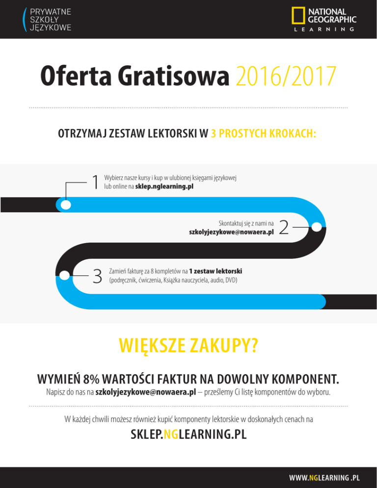Oferta Gratisowa 2016/2017 OTRZYMAJ ZESTAW LEKTORSKI W 3 PROSTYCH KROKACH: 1 Wybierz nasze kursy i kup w ulubionej księgarni językowej lub online na sklep.nglearning.pl Skontaktuj się z nami na [email protected] 3 2 Zamień fakturę za 8 kompletów na 1 zestaw lektorski (podręcznik, ćwiczenia, Książka nauczyciela, audio, DVD) WIĘKSZE ZAKUPY? WYMIEŃ 8% WARTOŚCI FAKTUR NA DOWOLNY KOMPONENT. Napisz do nas na [email protected] – prześlemy Ci listę komponentów do wyboru. W każdej chwili możesz również kupić komponenty lektorskie w doskonałych cenach na SKLEP.NGLEARNING.PL WWW.NGLEARNING .PL