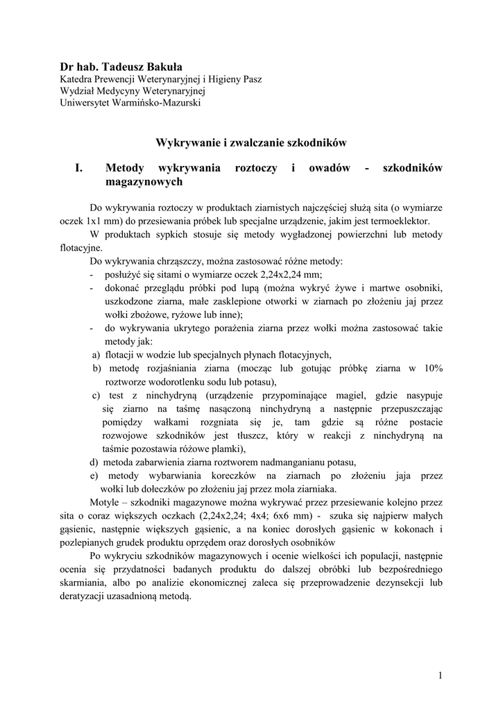 Dr hab. Tadeusz Bakuła Wykrywanie i zwalczanie szkodników I