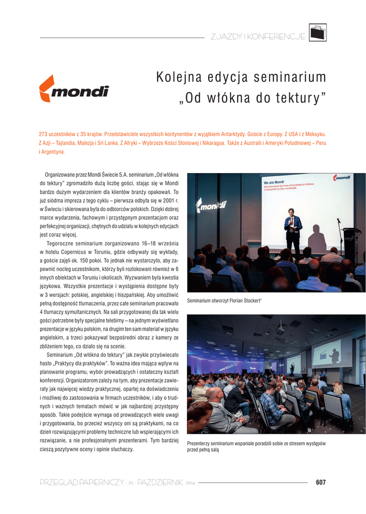 ZJAZDY I KONFERENCJE Kol ejn a edyc ja semi n a r i um „Od w ł ók n a do t ek t u r y ” 273 uczestników z 35 krajów. Przedstawiciele wszystkich kontynentów z wyjątkiem Antarktydy. Goście z Europy. Z USA i z Meksyku. Z Azji – Tajlandia, Malezja i Sri Lanka. Z Afryki – Wybrzeże Kości Słoniowej i Nikaragua. Także z Australii i Ameryki Południowej – Peru i Argentyna. Organizowane przez Mondi Świecie S.A. seminarium „Od włókna do tektury” zgromadziło dużą liczbę gości, stając się w Mondi bardzo dużym wydarzeniem dla klientów branży opakowań. To już siódma impreza z tego cyklu – pierwsza odbyła się w 2001 r. w Świeciu i skierowana była do odbiorców polskich. Dzięki dobrej marce wydarzenia, fachowym i przystępnym prezentacjom oraz perfekcyjnej organizacji, chętnych do udziału w kolejnych edycjach jest coraz więcej. Tegoroczne seminarium zorganizowano 16–18 września w hotelu Copernicus w Toruniu, gdzie odbywały się wykłady, a goście zajęli ok. 150 pokoi. To jednak nie wystarczyło, aby zapewnić nocleg uczestnikom, którzy byli rozlokowani również w 6 innych obiektach w Toruniu i okolicach. Wyzwaniem była kwestia językowa. Wszystkie prezentacje i wystąpienia dostępne były w 3 wersjach: polskiej, angielskiej i hiszpańskiej. Aby umożliwić pełną dostępność tłumaczenia, przez całe seminarium pracowało Seminarium otworzył Florian Stockert1 4 tłumaczy symultanicznych. Na sali przygotowanej dla tak wielu gości potrzebne były specjalne telebimy – na jednym wyświetlano prezentacje w języku polskim, na drugim ten sam materiał w języku angielskim, a trzeci pokazywał bezpośredni obraz z kamery ze zbliżeniem tego, co działo się na scenie. Seminarium „Od włókna do tektury” jak zwykle przyświecało hasło „Praktycy dla praktyków”. To ważna idea mająca wpływ na planowanie programu, wybór prowadzących i ostateczny kształt konferencji. Organizatorom zależy na tym, aby prezentacje zawierały jak najwięcej wiedzy praktycznej, opartej na doświadczeniu i możliwej do zastosowania w firmach uczestników, i aby o trudnych i ważnych tematach mówić w jak najbardziej przystępny sposób. Takie podejście wymaga od prowadzących wiele uwagi i przygotowania, bo przecież wszyscy oni są praktykami, na co dzień rozwiązującymi problemy techniczne lub wspierającymi ich rozwiązanie, a nie profesjonalnymi prezenterami. Tym bardziej cieszą pozytywne oceny i opinie słuchaczy. Prezenterzy seminarium wspaniale poradzili sobie ze stresem występów przed pełną salą PRZEGLĄD PAPIERNICZY · 70 · PAŹDZIERNIK 2014 607