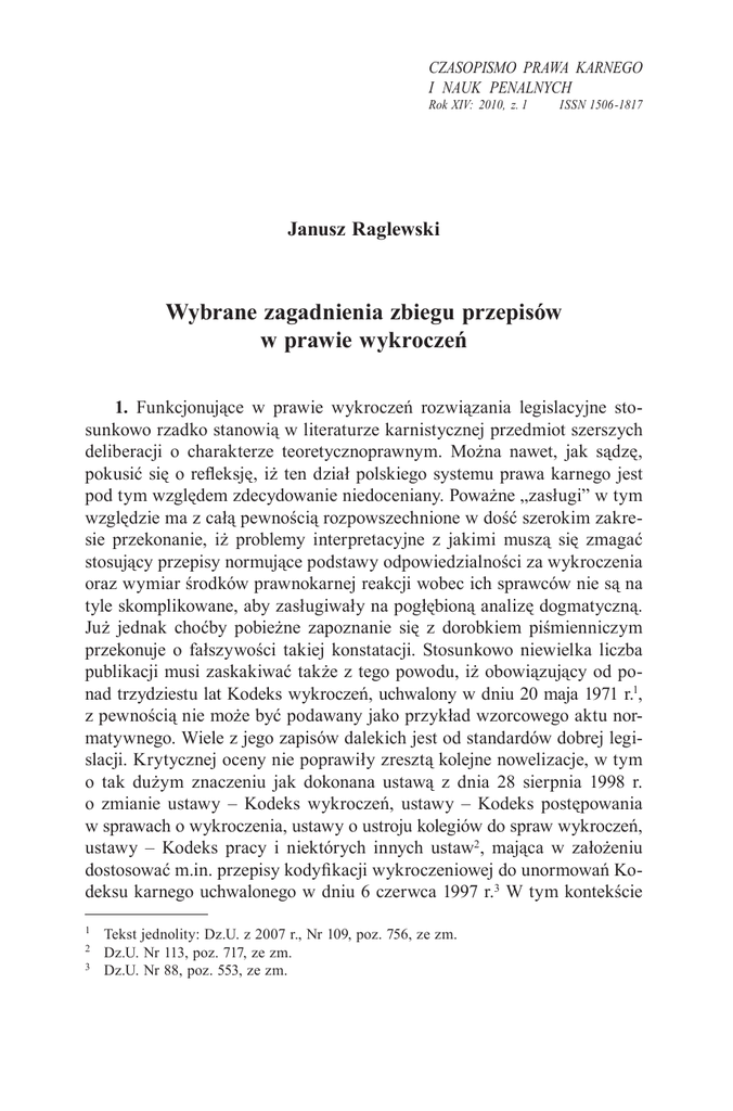 czasopismo Prawa karnego i nauk penalnych Rok XIV: 2010, z. 1 ISSN 1506-1817 Janusz Raglewski Wybrane zagadnienia zbiegu przepisów w prawie wykroczeń 1. Funkcjonujące w prawie wykroczeń rozwiązania legislacyjne stosunkowo rzadko stanowią w literaturze karnistycznej przedmiot szerszych deliberacji o charakterze teoretycznoprawnym. Można nawet, jak sądzę, pokusić się o refleksję, iż ten dział polskiego systemu prawa karnego jest pod tym względem zdecydowanie niedoceniany. Poważne „zasługi” w tym względzie ma z całą pewnością rozpowszechnione w dość szerokim zakresie przekonanie, iż problemy interpretacyjne z jakimi muszą się zmagać stosujący przepisy normujące podstawy odpowiedzialności za wykroczenia oraz wymiar środków prawnokarnej reakcji wobec ich sprawców nie są na tyle skomplikowane, aby zasługiwały na pogłębioną analizę dogmatyczną. Już jednak choćby pobieżne zapoznanie się z dorobkiem piśmienniczym przekonuje o fałszywości takiej konstatacji. Stosunkowo niewielka liczba publikacji musi zaskakiwać także z tego powodu, iż obowiązujący od ponad trzydziestu lat Kodeks wykroczeń, uchwalony w dniu 20 maja 1971 r.1, z pewnością nie może być podawany jako przykład wzorcowego aktu normatywnego. Wiele z jego zapisów dalekich jest od standardów dobrej legislacji. Krytycznej oceny nie poprawiły zresztą kolejne nowelizacje, w tym o tak dużym znaczeniu jak dokonana ustawą z dnia 28 sierpnia 1998 r. o zmianie ustawy – Kodeks wykroczeń, ustawy – Kodeks postępowania w sprawach o wykroczenia, ustawy o ustroju kolegiów do spraw wykroczeń, ustawy – Kodeks pracy i niektórych innych ustaw2, mająca w założeniu dostosować m.in. przepisy kodyfikacji wykroczeniowej do unormowań Kodeksu karnego uchwalonego w dniu 6 czerwca 1997 r.3 W tym kontekście 1 Tekst jednolity: Dz.U. z 2007 r., Nr 109, poz. 756, ze zm. Dz.U. Nr 113, poz. 717, ze zm. 3 Dz.U. Nr 88, poz. 553, ze zm. 2 146 Janusz Raglewski warto chociażby odwołać się do przykładu kontrowersji, jakie zaznaczyły się w kwestii ustalenia relacji terminów języka prawnego „gwałt na osobie” z art. 130 § 3 k.w. i „przemoc wobec osoby” z art. 280 § 1 k.k.4 Trzeba mieć również świadomość praktycznej istotności tych rozwiązań, albowiem chodzi o najczęściej popełniane czyny karalne. Jeśli nadto uwzględnić fakt, iż zdecydowana większość spraw kończy się nałożeniem grzywny w trybie mandatowym, to taki stan legislacji z oczywistych względów musi budzić zaniepokojenie. 2. Jedną z odmienności obowiązującej kodyfikacji wykroczeniowej, w porównaniu do kodeksu karnego, jest ustawowe rozwiązanie tzw. właściwego zbiegu przepisów poprzez przyjęcie dualistycznego modelu legislacyjnego. Aplikacja w realiach konkretnego stanu faktycznego którejś z dwóch regulacji uzależniona jest od tego, czy mamy do czynienia ze zbiegiem przepisów, który możemy określić mianem tzw. wykroczeniowego (tj. wszystkie opisują typy czynów zabronionych spenalizowanych jako wykroczenia), czy też zbieg taki ma charakter tzw. zewnętrznego zbiegu przepisów (określają znamiona zarówno przestępstw, jak i wykroczeń). Pierwszy z wymienionych rozwiązywalny jest poprzez zastosowanie tzw. eliminacyjnego zbiegu przepisów (art. 9 § 1 k.w.). Z kolei, jeżeli typy czynów zabronionych określone w zbiegających się przepisach kwalifikowane są zarówno do kategorii wykroczeń, jak i przestępstw, to zastosowanie znajduje regulacja bazująca na konstrukcji tzw. idealnego zbiegu czynów karalnych z art. 10 k.w. 3. Analizę unormowania zbiegu przepisów w prawie wykroczeń rozpocząć wypada od krótkiej prezentacji, w ujęciu teoretycznoprawnym, przyjmowanych w literaturze ich typologii oraz wykorzystywanej dla ich oznaczenia terminologii. Już wstępnie uczyńmy zastrzeżenie, że nie jest to zadanie łatwe, gdyż w doktrynie prawa karnego funkcjonują różne klasyfikacje5. Nadto, z łatwością zauważalny jest brak konsensusu teoretyków prawa karnego co do kwestii o wręcz rudymentarnym znaczeniu. Przede wszystkim należy wyjść od odróżnienia tzw. rzeczywistego zbiegu przepisów oraz tzw. pozornego zbiegu przepisów. Różnica sprowa4 Zob. J. R a g l e w s k i, Przemoc wobec osobie i gwałt na osobie, „Jurysta” 2009, nr 5/6, s. 17–20 oraz powołana tam literatura i orzecznictwo; M. B i e l s k i, Glosa do uchwały SN z 17 XII 2008 r., I KZP 27/08, PiP 2010, nr 3, s. 136–141. 5 Zob. m.in. A. S p o t o w s k i, Pomijalny (pozorny) zbieg przepisów ustawy i przestępstw, Warszawa 1976, s. 210; Ł. P o h l, Zbieg przepisów ustawy i zbieg przestępstw – próba uporządkowania pojęć, RPEiS 2005, nr 1, s. 97–104. Wybrane zagadnienia zbiegu przepisów w prawie wykroczeń 147 dza się do tego, iż w pierwszym wypadku mamy do czynienia z krzyżowaniem się zakresów znamion typów czynów zabronionych, w drugim zaś istnieje między nimi relacja wykluczania6. W tym ostatnim zatem jedynie pozornie wydaje się, że zachodzi zbieg przepisów. Jako przykład można podać relację między art. 86 § 1 i 2 k.w. Rozstrzygnięcie takiego przypadku opiera się na zasadzie lex specialis derogat legi generali7, tzn. przepis szczególny wyłącza zastosowanie przepisu ogólnego. Określenie: tzw. rzeczywisty zbieg przepisów, odnosić należy z kolei do takich wypadków, gdy w rezultacie przeprowadzonej wykładni przepisów poddanych prawnokarnej analizie po zdekodowaniu z nich norm sankcjonujących, popełniony przez sprawcę czyn realizuje znamiona przynajmniej dwóch typów czynów zabronionych. Może występować w dwojakiej postaci. Wyróżnia się bowiem tzw. właściwy zbieg przepisów oraz tzw. niewłaściwy zbieg przepisów (określany inaczej mianem pomijalnego)8. Jako przykład pierwszego wskażmy zbieg art. 86 § 2 i art. 87 § 1 k.w. Nie każdy czyn wyczerpujący znamiona jednego z tych typów czynów karalnych mieści się w zakresie penaliz
