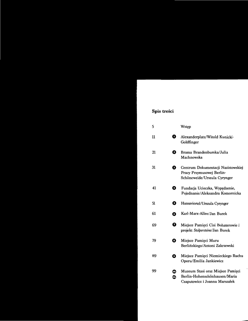 Spis treści 5 Wstęp 11 o 21 o 31 o 41 o Fundacja Ucieczka, Wypędzenie, Pojednanie/Aleksandra Komornicka 51 o Hansaviertel/Urszula Cyrynger 61 o Karl-Marx-Allee/Jan Burek 69 o Miejsce Pamięci Cisi Bohaterowie i projekt Sto/persteine/Jan Burek 79 o Miejsce Alexanderplatz/Witold KunickiGoldfinger Brama Brandenburska/Julia Mach nowska Centrum Dokumentacji Nazistowskiej Pracy Przymusowej BerlinSchoneweide/ Urszula Cyrynger · Pamięci Muru Zakrzewski Berlińskiego/ Antoni 89 o Miejsce Pamięci Niemieckiego Ruchu Oporu/ Emilia Jankiewicz 99 e Muzeum Stasi oraz Miejsce Pamięci Berlin-Hohenschonhausen/Maria Czaputowicz i Joanna Marszałek ~ 111 e Muzeum Żydowskie/ Aleksandra Ciecie ląg 119 (!) Nikolaiviertel/ Joanna 129 G Nowy Odwach/Grzegorz 137 • 145 4) 155 CI) Pałac Łez/Zofia Marszałek Dumała Antkiewicz Pomnik Chwały Żołnierzy Radzieckich w parku Treptow/Maria Czaputowicz Pomniki upamiętniające Zagłady/Maria ofiary Pawlak 165 G Potsdamer Platz/Weronika 173 C) Reichstag/Radosław 183 G> Topografia Terroru/ Anna Dobrowolska 193 $ Zamek Gońda Micka Berliński/ Anna 203 Zakończenie 211 Leksykon 223 Kalendarium Berlina 225 Polecana literatura Dobrowolska