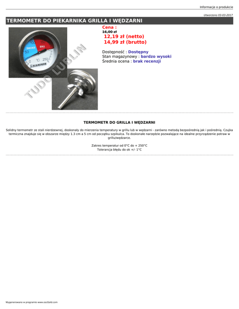 Informacje o produkcie Utworzono 03-03-2017 TERMOMETR DO PIEKARNIKA GRILLA I WĘDZARNI Cena : 16,00 zł 12,19 zł (netto) 14,99 zł (brutto) Dostępność : Dostępny Stan magazynowy : bardzo wysoki Średnia ocena : brak recenzji TERMOMETR DO GRILLA I WĘDZARNI Solidny termometr ze stali nierdzewnej, doskonały do mierzenia temperatury w grillu lub w wędzarni - zarówno metodą bezpośrednią jak i pośrednią. Czujka termiczna znajduje się w obszarze między 1.3 cm a 5 cm od początku szpikulca. To doskonałe narzędzie pozwalające na idealne przyrządzenie potraw w grillu/wędzarce. Zakres temperatur od 0°C do + 250°C Tolerancja błędu do ok +/- 1°C Wygenerowano w programie www.oscGold.com
