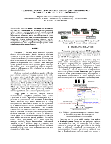 TECHNIKI KODOWANIA I WYZNACZANIA MAP GŁĘBI STEREOSKOPOWEJ W SYSTEMACH TELEWIZJI WIELOWIDOKOWEJ Olgierd Stankiewicz, [email protected] Politechnika Poznańska, Katedra Telekomunikacji Multimedialnej i Mikroelektroniki Ul. Polanka 3, 61-131 Poznań Streszczenie: Artykuł stanowi podsumowanie i streszczenie rozprawy doktorskiej [1]. Przedstawiono osiągnięcia autora związane z opracowaniem nowych technik estymacji głębi oraz nowej techniki kodowania głębi wykorzystującej reprezentację nieliniową, która została włączona do specyfikacji międzynarodowych norm opisujących nowe techniki kodowania obrazu trójwymiarowego. Opisano również udział autora w opracowaniu poznańskiego kodeka obrazu trójwymiarowego oraz eksperymentalnego systemu wielokamerowego i sekwencji testowych. 1. Mapa głębi Zarówno nawigacja swobodnego punktu widzenia, jak i autostereoskopia, wymagają znacznej liczby widoków sceny, których akwizycja, przetwarzanie i transmisja byłaby niepraktyczna. Sposobem, który umożliwia efektywny opis sceny trójwymiarowej jest zastosowanie reprezentacji MVD (Multiview Video plus Depth) [2]. Reprezentacja sceny trójwymiarowej w formacie MVD składa się z ograniczonej liczby widoków oraz odpowiadających im map głębi, które przenoszą dodatkową informację na temat trójwymiarowej struktury sceny. Mapy głębi są obrazami, których wartości odzwierciedlają odległości pomiędzy daną kamerą a punktami w scenie. Wykorzystanie map głębi (rys. 1) pozwala na generowanie tzw. widoków wirtualnych. Widok wirtualny, czyli widok pochodzący z kamery umiejscowionej wirtualnie w scenie, nie jest rejestrowany a powstaje syntetycznie na podstawie treści zarejestrowanej przez kamery rzeczywiste. Taka wirtualna kamera może być umieszczona w dowolnym położeniu – także w położeniu nieosiągalnym w rzeczywistym świecie lub w położeniu rzeczywistej kamery. Ta druga możliwość może być wykorzystana przy predykcji określonego widoku na postawie innych widoków. Jest to kluczowa zaleta reprezentacji MVD, gdyż umożliwia znaczną redukcję liczby bezpośrednio kodowanych widoków np. do 3 widoków, które są przesyłane wraz z odpowiadającymi im mapami głębi. Na tej podstawie pozostałe widoki mogą zostać zrekonstruowane po stronie dekodera/odbiornika. Obraz Obraz Obraz widoku wirtualnego położonego w arbitralnie wybranej pozycji w scenie trójwymiarowej Synteza widoku wirtualnego Rys. 1 Wykorzystanie reprezentacji MVD (np. 3 widoki + 3 mapy głębi) do syntezy widoku wirtualnego 2. WSTĘP Rozprawa [1] dotyczy nowej generacji systemów obrazu trójwymiarowego. Swoim zakresem obejmuje zwłaszcza systemy swobodnego punktu widzenia (free viewpoint navigation) i autostereoskopię. W stosunku do dotychczas znanych i stosowanych rozwiązań wykorzystujących stereoskopię, nowe systemy mają zapewnić lepsze wrażenia obrazu przestrzennego, lepszą reprodukcję struktury sceny oraz umożliwić widzowi oddziaływanie na widzianą scenę i jej oglądanie bez użycia specjalnych okularów. Mapa głębi Mapa głębi Obraz PROBLEMY BADAWCZE Wymagane przez reprezentację MVD mapy głębi trzeba wyznaczyć oraz efektywnie przesłać. Problemy te są rozważane w rozprawie w odniesieniu do czterech tez: T1÷T4. W szczególności: 1. Mapy głębi wysokiej jakości są potrzebne przy tworzeniu treści zawierających obraz trójwymiarowy. W rozprawie rozpatrywana jest algorytmiczna estymacja głębi, zaś opracowanie nowych algorytmów i technik estymacji map głębi jest jednym z celów pracy (tezy T1 i T2 rozprawy). Jest to zagadnienie skomplikowane, stanowiące spore wyzwanie badawcze, gdyż w przeciwieństwie do np. grafiki komputerowej, rozpatrywane są tutaj złożone sceny naturalne w których występują liczne problemy związane m.in. z odbiciami i przesłonięciami. ... Wiele kamer ... Przetwarzanie wstępne Wiele widoków (Multiview video) Zakres rozprawy MVD (Multiview Video + Depth) Estymacja głębi Wiele widoków Głębia +głębia Koder Transmisja strumienia binarnego Dekoder Zrekonstruowany wielowidokowy sygnał wizyjny Zrekonstruowane mapy głębi Synteza widoków ... Zbiór widoków Wyświetlacz trójwymiarowy Rys. 2 Zakres rozprawy (zaznaczony czerwoną linią) w kontekście systemu trójwymiarowego - estymacja i kompresja map głębi 2. Oczekuje się, iż mapy głębi powinny być spójne w dziedzinie czasu. Temat ten jest związany zarówno z estymacją głębi, jak i jej kompresją. Brak spójności czasowej wyznaczanych map głębi objawia się migotaniem w widokach wirtualnych syntezowanych z ich wykorzystaniem. Ponadto, ograniczona spójność map głębi w dziedzinie czasu wpływa negatywnie na spraw- ność ich kompresji. Poprawa spójności czasowej map głębi jest kolejnym z celów rozprawy (teza T3). 3. Stosownie formatu MVD stwarza potrzebę efektywnego przesyłania map głębi. Ponieważ mapy głębi różnią się pod względem charakteru swojej treści od obrazów naturalnych poszukuje się nowych, wydajnych metod ich kompresji. Zagadnienia tego dotyczy teza T4 rozprawy. 3. METODOLOGIA BADAŃ Celem rozprawy są badania nad poprawą efektywności kodowania map głębi i poprawą jakości map głębi estymowanych algorytmicznie. W przypadku obu tych problemów jedyną metodą rzetelnej oceny propozycji jest przeprowadzenie serii eksperymentów wykorzystujących sekwencje testowe. Z tego względu, na poparcie postawionych tez, w rozprawie przedstawiono wyniki licznych eksperymentów. Aby je przeprowadzić, propozycje przedstawione w rozprawie zaimplementowano i zintegrowano z istniejącymi pakietami oprogramowania, takimi jak Depth Estimation Reference Software (DERS) [3] i 3D-ATM (AVC based 3D Test Model) [4], stosowanymi w literaturze jako odniesienie do badań naukowych w tej dziedzinie. Sumarycznie, podczas tworzenia rozprawy, autor pracował z oprogramowaniem liczącym około 385 000 linii kodu źródłowego, wśród któryc