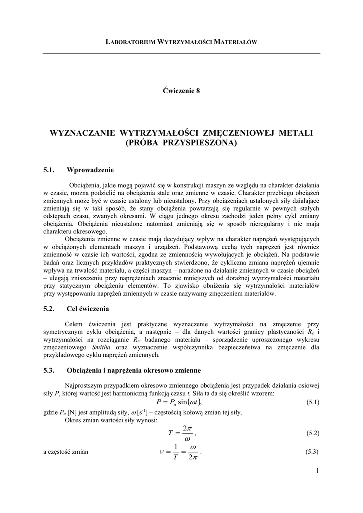 LABORATORIUM WYTRZYMAŁOŚCI MATERIAŁÓW Ćwiczenie 8 WYZNACZANIE WYTRZYMAŁOŚCI ZMĘCZENIOWEJ METALI (PRÓBA PRZYSPIESZONA) 5.1. Wprowadzenie Obciążenia, jakie mogą pojawić się w konstrukcji maszyn ze względu na charakter działania w czasie, można podzielić na obciążenia stałe oraz zmienne w czasie. Charakter przebiegu obciążeń zmiennych może być w czasie ustalony lub nieustalony. Przy obciążeniach ustalonych siły działające zmieniają się w taki sposób, że stany obciążenia powtarzają się regularnie w pewnych stałych odstępach czasu, zwanych okresami. W ciągu jednego okresu zachodzi jeden pełny cykl zmiany obciążenia. Obciążenia nieustalone natomiast zmieniają się w sposób nieregularny i nie mają charakteru okresowego. Obciążenia zmienne w czasie mają decydujący wpływ na charakter naprężeń występujących w obciążonych elementach maszyn i urządzeń. Podstawową cechą tych naprężeń jest również zmienność w czasie ich wartości, zgodna ze zmiennością wywołujących je obciążeń. Na podstawie badań oraz licznych przykładów praktycznych stwierdzono, że cykliczna zmiana naprężeń ujemnie wpływa na trwałość materiału, a części maszyn – narażone na działanie zmiennych w czasie obciążeń – ulegają zniszczeniu przy naprężeniach znacznie mniejszych od doraźnej wytrzymałości materiału przy statycznym obciążeniu elementów. To zjawisko obniżenia się wytrzymałości materiałów przy występowaniu naprężeń zmiennych w czasie nazywamy zmęczeniem materiałów. 5.2. Cel ćwiczenia Celem ćwiczenia jest praktyczne wyznaczenie wytrzymałości na zmęczenie przy symetrycznym cyklu obciążenia, a następnie – dla danych wartości granicy plastyczności Re i wytrzymałości na rozciąganie Rm badanego materiału – sporządzenie uproszczonego wykresu zmęczeniowego Smitha oraz wyznaczenie współczynnika bezpieczeństwa na zmęczenie dla przykładowego cyklu naprężeń zmiennych. 5.3. Obciążenia i naprężenia okresowo zmienne Najprostszym przypadkiem okresowo zmiennego obciążenia jest przypadek działania osiowej siły P, której wartość jest harmoniczną funkcją czasu t. Siła ta da się określić wzorem: P Pa sin t , (5.1) gdzie Pa [N] jest amplitudą siły, [s-1] – częstością kołową zmian tej siły. Okres zmian wartości siły wynosi: T a częstość zmian 2 , 1 . T 2 (5.2) (5.3) 1 Katedra Wytrzymałości Materiałów i Konstrukcji Wyznaczanie wytrzymałości zmęczeniowej metali Jeżeli n oznacza liczbę okresowych zmian zachodzących w ciągu l min, to: n 30 . (5.4) Jeśli pod wpływem działania tak zdefiniowanej siły w obciążonym elemencie wystąpi jednoosiowy stan napięcia, to wartość głównego naprężenia normalnego zmieniać się będzie według zależności: a sin t , (5.5) w której a określa tzw. amplitudę naprężenia. Naprężenie zmieniać się zatem będzie okresowo w zakresie od max= +a domin= –a, symetrycznie względem zera. Takie naprężenia nazywać będziemy wahającymi lub oscylującymi, a przebieg ich zmian w czasie określa sinusoida (rys. 5.1a). Jedną zmianę naprężenia od wartości np. max do najbliższej tej samej wartości max nazywamy cyklem, a czas tej zmiany mierzony w sekundach nazywamy okresem . W przypadku dowolnego, lecz okresowego przebiegu zmian naprężeń, wartości naprężeń są w każdej chwili inne, lecz zawsze zawarte między max i min. Przebieg ich zmian można zatem przedstawić również w postaci sinusoidy (patrz rys. 5.1b), której oś wyznaczona będzie przez średnie naprężenie cyklu wynoszące: max min m 2 . (5.6) Amplitudą zmian naprężeń takiego cyklu będzie połowa algebraicznej różnicy naprężeń skrajnych max i min , czyli: a max min 2 . (5.7) Dowolny zatem okresowy przebieg zmian naprężeń można uzyskać przez nałożenie naprężeń wahających na naprężenie stałe, równe naprężeniu średniemu m: max m a . (5.8) + t - max m a a - A +A min + min t Rysunek 5.1. Sinusoidalne przebiegi zmian naprężeń w czasie a) symetryczne względem zera oraz b) niesymetryczne względem zera – oś wyznacza się przez średnie naprężenie cyklu m. 2 Katedra Wytrzymałości Materiałów i Konstrukcji Wyznaczanie wytrzymałości zmęczeniowej metali Szczególnym przypadkiem takiego okresowego przebiegu zmian naprężeń jest przypadek tzw. tętniącego cyklu naprężeń, w czasie którego naprężenia zmieniają się od wartości min=0 do pewnej stałej wartości dodatniej lub ujemnej – bez zmiany znaku. Amplituda tych naprężeń wynosi a 12 . Stosunek naprężenia średniego m do amplitudy naprężenia a: m , a (5.9) nazywamy współczynnikiem stałości obciążenia, a stosunek najmniejszej wartości naprężeń min do wartości największej max nazywamy charakterystyką cyklu (lub współczynnikiem asymetrii). Podczas pracy maszyny przejście z jednego stanu pracy maszyny do innego może odbywać się na dwa sposoby: przy zachowaniu stałego stosunku wartości średniej do amplitudy naprężenia (rys. 5.2a) lub przy zachowaniu stałej wartości naprężenia średniego (rys. 5.2b). b) a) Rysunek 5.2. Dwa sposoby przejścia maszyny z jednego stanu pracy do innego. W zależności od wartości naprężeń max i min, w których zakresie mogą się zmieniać naprężenia okresowe , rozróżnić można następujące cykle (rys. 5.3): – – cykl jednostronny dodatni (rys. 5.3a) max>0, min>0, czyli 1 < < , 0 < r < 1; m>0, cykl tętniący dodatni (rys. 5.3b) max>0, min=0, czyli = 1, r = 0; m= – – max 2 , cykl dwustronny dodatni (rys. 5.4c) max>0, min<0, max> min czyli 0 < < 1, –1 < r < 0; m>0, cykl wahający (oscylujący) (rys. 5.3d) max=+a , min=a , czyli = 0, r = –1; m=0, 3 Katedra Wytrzymałości Materiałów i Konstrukcji Wyznaczanie wytrzymałości zmęczeniowej metali t 0 t 0 b) f) t 0 c) t 0 t 0 g) d) t t Rysunek 5.3. Rodzaje cykli w zależności od wartości naprężeń max i min. – – cykl dwu