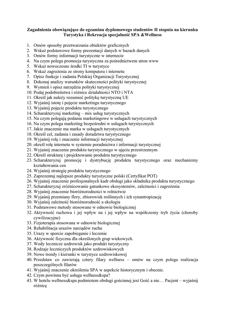 Zagadnienia obowiązujące do egzaminu dyplomowego studentów II stopnia na kierunku Turystyka i Rekreacja specjalność SPA &Wellness 1. Omów sposoby przetwarzania obiektów graficznych 2. Wskaż podstawowe formy prezentacji danych w bazach danych 3. Omów formy informacji turystyczne w internecie 4. Na czym polega promocja turystyczna za pośrednictwem stron www 5. Wskaż nowoczesne środki TI w turystyce 6. Wskaż zagrożenia ze strony komputera i internetu 7. Opisz funkcje i zadania Polskiej Organizacji Turystycznej 8. Dokonaj analizy warunków skuteczności polityki turystycznej 9. Wymień i opisz narzędzia polityki turystycznej 10. Podaj podobieństwa i różnice działalności NTO i NTA 11. Określ jak należy rozumieć politykę turystyczną UE 12. Wyjaśnij istotę i pojęcie marketingu turystycznego 13. Wyjaśnij pojęcie produktu turystycznego 14. Scharakteryzuj marketing – mix usług turystycznych 15. Na czym polegają podania marketingowe w usługach turystycznych 16. Na czym polega marketing bezpośredni w usługach turystycznych 17. Jakie znaczenie ma marka w usługach turystycznych 18. Określ cel, zadania i zasady doradztwa turystycznego 19. Wyjaśnij rolę i znaczenie informacji turystycznej 20. określ rolę internetu w systemie poradnictwa i informacji turystycznej 21. Wyjaśnij znaczenie produktu turystycznego w ujęciu przestrzennym 22. Określ strukturę i projektowanie produktu turystycznego 23. Scharakteryzuj promocję i dystrybucję produktu turystycznego oraz mechanizmy kształtowania cen 24. Wyjaśnij strategię produktu turystycznego 25. Zaprezentuj najlepsze produkty turystyczne polski (Certyfikat POT) 26. Wyjaśnij znaczenie profesjonalnych kadr obsługi jako składnika produktu turystycznego 27. Scharakteryzuj zróżnicowanie gatunkowe ekosystemów, zależności i zagrożenia 28. Wyjaśnij znaczenie bioróżnorodności w rolnictwie 29. Wyjaśnij przemiany flory, zbiorowisk roślinnych i ich synantropizację 30. Wyjaśnij zależność bioróżnorodność a ekologia 31. Podstawowe metody stosowane w odnowie biologicznej 32. Aktywność ruchowa i jej wpływ na i jej wpływ na współczesny tryb życia (choroby cywilizacyjne) 33. Fizjoterapia stosowana w odnowie biologicznej 34. Rehabilitacja urazów narządów ruchu 35. Urazy w sporcie zapobieganie i leczenie 36. Aktywność fizyczna dla określonych grup wiekowych. 37. Wody lecznicze uzdrowisk jako produkt turystyczny 38. Rodzaje leczniczych produktów uzdrowiskowych 39. Nowe trendy i kierunki w turystyce uzdrowiskowej 40. Przedstaw co zawierają cztery filary wellness – omów na czym polega realizacja poszczególnych filarów 41. Wyjaśnij znaczenie określenia SPA w aspekcie historycznym i obecnie. 42. Czym powinna być usługa wellness&spa? 43. W hotelu wellness&spa podmiotem obsługi gościnnej jest Gość a nie… Pacjent – wyjaśnij różnicę 44. Usługa wellness&spa czym powinna być? 45. Motto i misja hotelu – komu one mają służyć? 46. Program lojalnościowy – zasady działania i przykładamy 47. Marketing zewnętrzny hotelu welness&spa – główne elementy 48. Marketing wewnętrzny hotelu wellness&spa – na czym polega 49. Gość hotelu wellness&spa jako ambasador na linii hotel – środowisko zewnętrzne 50. Zmęczenie fizyczne oraz jego przyczyny 51. Formy aktywacji wypoczynku 52. Optymalny model aktywności ruchowej człowieka ze względu na jej biologiczne skutki 53. Biomedyczne podstawy rekreacji 54. Biegowe formy rekreacji 55. Gry i zabawy ruchowe, taniec, aerobik w rekreacji ruchowej 56. Mierniki zdrowia 57. Aktywność fizyczna czynnikiem podtrzymującym zdrowie