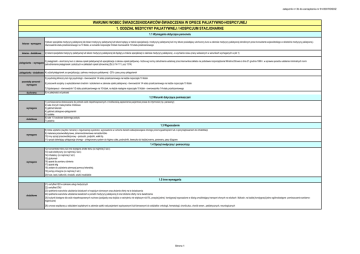 załącznik nr 3b do zarządzenia nr 61/2007/DSOZ WARUNKI WOBEC ŚWIADCZENIODAWCÓW-ŚWIADCZENIA W OPIECE PALIATYWNO-HOSPICYJNEJ 1. ODDZIAŁ MEDYCYNY PALIATYWNEJ / HOSPICJUM STACJONARNE 1.1 Wymagania dotyczące personelu lekarze - wymagane 1)lekarz specjalista medycyny paliatywnej lub lekarz medycyny paliatywnej lub lekarz będący w trakcie specjalizacji z medycyny paliatywnej lub inny lekarz posiadajacy ukończony kurs w zakresie medycyny paliatywnej określonym przez konsultanta wojewódzkiego w dziedzinie medycyny paliatywnej równoważnik etatu przeliczeniowego na 10 łóżek, a na każde rozpoczęte 5 łóżek równoważnik 1/2 etatu przeliczeniowego lekarze - dodatkowe 2) lekarz specjalista medycyny paliatywnej lub lekarz medycyny paliatywnej lub będący w trakcie specjalizacji z zakresie medycyny paliatywnej - w wymiarze czasu pracy wskazanym w warunkach wymaganych w pkt 1) pielęgniarka - wymagane 3) pielęgniarki - ukończony kurs z zakresu opieki paliatywnej lub specjalizacja z zakresu opieki palitywnej - liczba wg normy zatrudnienia ustalonej przez kierownika zakładu na podstawie rozporządzenia Ministra Zdrowia z dnia 21 grudnia 1999 r. w sprawie sposobu ustalania minimalnych norm zatrudnianiania pielęgniarek i położnych w zakładach opieki zdrowotnej (Dz.U. Nr 111, poz 1314) pielęgniarka - dodatkowe 4) udział pielęgniarek ze specjalizacją z zakresu medycyny paliatywnej - 25% czasu pracy pielęgniarek 5) psycholog kliniczny lub mgr psychologii - równoważnik 1/4 etatu przeliczeniowego na każde rozpoczęte 10 łóżek pozostały personel wymagane 6) pracownik socjalny z wykształceniem średnim i szkoleniem w zakresie opieki paliatywnej - równoważnik 1/4 etatu przeliczeniowego na każde rozpoczęte 10 łóżek 7) fizjoterapeuci - równoważnik 1/2 etatu przeliczeniowego na 10 łóżek, na każde następne rozpoczęte 10 łóżek - rownowaznika 1/4 etatu przeliczeniowego duchowny 8) w zależności od potrzeb 1.2 Warunki dotyczące pomieszczeń wymagane dodatkowe 1) pomieszczenia dostosowane do potrzeb osób niepełnosprawnych z możliwością zapewnienia pacjentowi prawa do intymności (np. parawany); 2) sale chorych maksymalnie 4 łóżkowe 3) gabinet lekarski 4) gabinet zabiegowo-pielęgniarski 5) izolatka 6) sale 1-3 osobowe dziennego pobytu 7) jadalnia 1.3 Wyposażenie wymagane 8) łóżka szpitalne (zwykłe i łamane) o regulowanej wysokości, wyposażone w ruchome barierki zabezpieczajace chorego przed wypadnięciem lub z oprzyrządowaniem do rehabilitacji 9) materace przeciwodleżynowe, zmiennociśnieniowe na każde łóżko 10) inny sprzęt przeciwodleżynowy - poduszki, podpórki, wałki itp. 11) sprzęt ułatwiający pielęgnację chorego - zintegrowany system do higieny ciała, podnośniki, ławeczka do każdej wanny, parawany, pasy ślizgowe 1.4 Sprzęt medyczny i pomocniczy wymagane 12) koncentrator tlenu lub inne dostępne źródło tlenu (co najmniej 3 szt.); 13) ssak elektryczny (co najmniej 2 szt.); 14) inhalatory (co najmniej 2 szt.) 15) glukometr 16) aparat do pomiaru ciśnienia 17) aparat ekg 18) zestaw do udzielania pierwszej pomocy lekarskiej; 19) pompy infuzyjne (co najmniej 3 szt.) 20) kule, laski, balkoniki, chodziki, wózki inwalidzkie 1.5 Inne wymagania dodatkowe 21) certyfikat ISO w zakresie usług medycznych 22) certyfikat CMJ 23) spełnienie warunków udzielania świadczeń w hospicjum domowym oraz złożenie oferty na te świadczenia 24) spełnienie warunków udzielania świadczeń w poradni medycyny paliatywnej d oraz złożenie oferty na te świadczenia 25) budynki dostępne dla osób niepełnosprawnych ruchowo (podjazdy oraz dojścia o nachyleniu nie większym niż 5%, powyżej jednej kondygnacji wyposażone w dźwig umożliwiający transport chorych na wózkach i łóżkach, na każdej kondygnacji jedno ogólnodostępne pomieszczenie sanitarnohigieniczne) 26) umowa współpracy z oddziałami szpitalnymi w zakresie opieki nad pacjentami wypisywanymi lub kierowanymi do oddziałów: onkologii, hematologii, chorób płuc, chorób wewn., pediatrycznych, neurologicznych Strona 1 załącznik nr 3b do zarządzenia nr 61/2007/DSOZ 2. HOSPICJUM DOMOWE HOSPICJUM DOMOWE DLA DZIECI HOSPICJUM DOMOWE DLA DOROSŁYCH 2.1 Wymagania dotyczące personelu lekarze - wymagane 1) lekarz specjalista medycyny paliatywnej lub lekarz medycyny paliatywnej lub lekarz będący w trakcie specjalizacji z medycyny paliatywnej lub inny lekarz posiadajacy ukończony kurs w zakresie medycyny paliatywnej określonym przez konsultanta wojewódzkiego w dziedzinie medycyny paliatywnej - równoważnik 1 etatu przeliczeniowego na każdych 30 chorych 1) lekarz specjalista medycyny paliatywnej lub pediatrii lub lekarz medycyny paliatywnej lub pediatrii lub lekarz będący w trakcie specjalizacji z medycyny paliatywnej lub inny lekarz posiadający ukończony kurs w zakresie medycyny paliatywnej określonym przez konsultanta wojewódzkiego w dziedzinie medycyny paliatywnej - równoważnik 1 etatu przeliczeniowego na każdych 20 chorych lekarze - dodatkowe 2) lekarz specjalista medycyny paliatywnej - w wymiarze czasu pracy wskazanym w warunkach wymaganych w pkt 1) 2) lekarz specjalista chirurgii dziecięcej lub anestezjologii lub psychiatrii lub stomatologii lub onkologii lub rehabilitacj medycznej 3) lekarz specjalista medycyny paliatywnej pielęgniarki - wymagane 3) pielęgniarki z ukończonym kursem z zakresu opieki paliatywnej lub specjalizacją z zakresu opieki paliatywnej lub w trakcie specjalizacji w zakresie pielęgniarstwa w opiece paliatywnej - równoważnik etatu przeliczeniowego na każdych 15 chorych 4) pielęgniarki z ukończonym kursem z zakresu opieki paliatywnej lub specjalizacją z zakresu opieki paliatywnej lub w trakcie specjalizacji w zakresie pielęgniarstwa w opiece paliatywnej - równoważnik 1 etatu przeliczeniowego na każdych 12 chorych pielęgniarki - dodatkowe 4) udział pielęgniarek ze specjalizacją z zakresu medycyny paliatywnej - 25% czasu pra