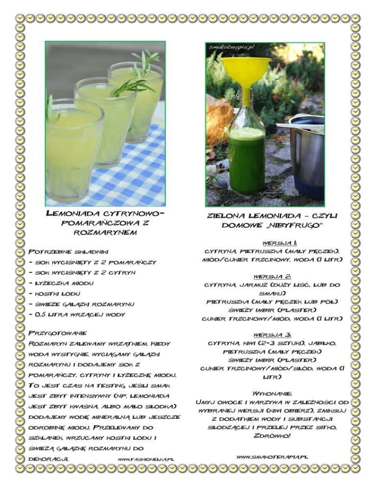 Lemoniada cytrynowopomarańczowa z rozmarynem zielona lemoniada – czyli domowe „nibyfrugo” wersja 1: cytryna, pietruszka (mały pęczek), Potrzebne składniki - sok wyciśnięty z 2 pomarańczy - sok wyciśnięty z 2 cytryn - łyżeczka miodu miód/cukier trzcinowy, woda (1 litr) wersja 2: cytryna, jarmuż (duży liść, lub do smaku) - kostki lodu - świeże gałązki rozmarynu - 0,5 litra wrzącej wody Przygotowanie pietruszka (mały pęczek lub pół) świeży imbir (plaster) cukier trzcinowy/miód, woda (1 litr) wersja 3: Rozmaryn zalewamy wrzątkiem. Kiedy woda wystygnie, wyciągamy gałązki rozmarynu i dodajemy sok z pomarańczy, cytryny i łyżeczkę miodu. cytryna, kiwi (2-3 sztuki), jabłko, pietruszka (mały pęczek) świeży imbir (plaster) cukier trzcinowy/miód/słód, woda (1 litr) To jest czas na testing, jeśli smak jest zbyt intensywny (np. lemoniada jest zbyt kwaśna, albo mało słodka) dodajemy wodę mineralną lub jeszcze Wykonanie: Umyj owoce i warzywa w zależności od wybranej wersji (kiwi obierz), zmiksuj z dodatkiem wody i substancji odrobinę miodu. Przelewamy do słodzącej i przelej przez sitko. szklanek, wrzucamy kostki lodu i Zdrówko! świeżą gałązkę rozmarynu do dekoracji. www.fashionelka.pl www.smakoterapia.pl