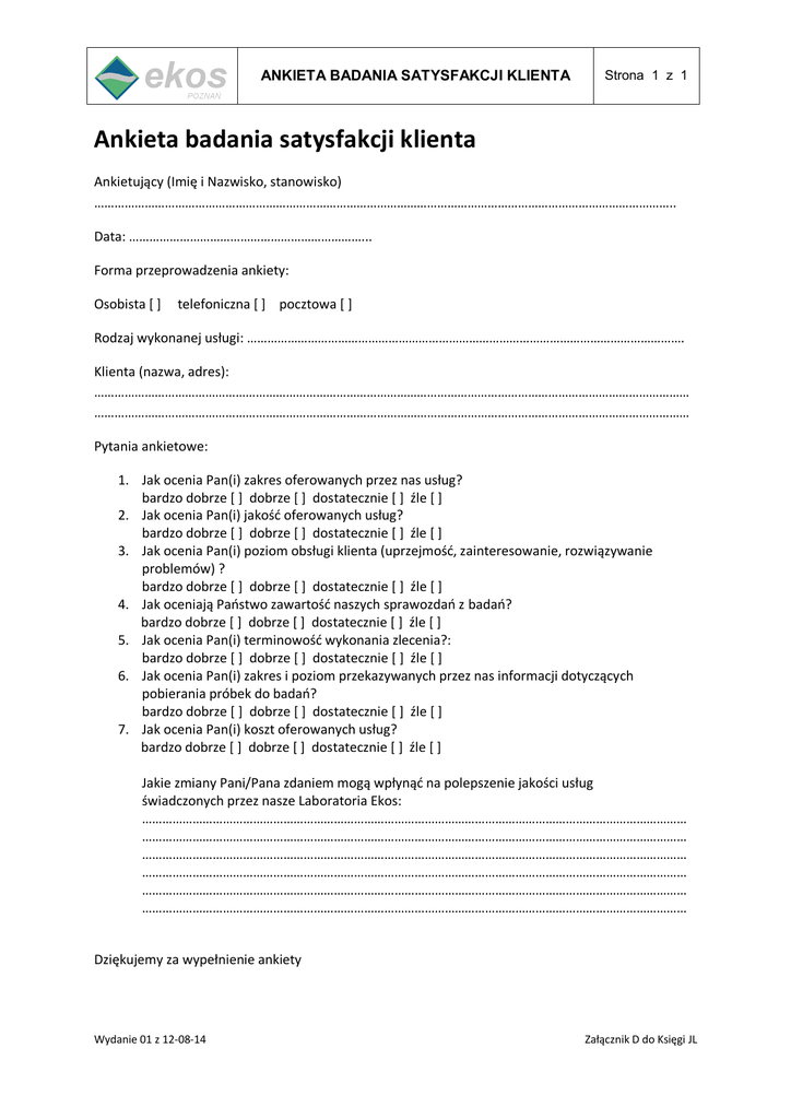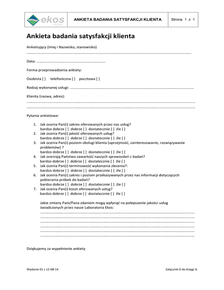 ANKIETA BADANIA SATYSFAKCJI KLIENTA Strona 1 z 1 Ankieta badania satysfakcji klienta Ankietujący (Imię i Nazwisko, stanowisko) ……………………………………………………………………………………………………………………………………………………….. Data: ……………………………………………………………... Forma przeprowadzenia ankiety: Osobista [ ] telefoniczna [ ] pocztowa [ ] Rodzaj wykonanej usługi: …………………………………………………………………………………………………………………. Klienta (nazwa, adres): …………………………………………………………………………………………………………………………………………………………… …………………………………………………………………………………………………………………………………………………………… Pytania ankietowe: 1. Jak ocenia Pan(i) zakres oferowanych przez nas usług? bardzo dobrze [ ] dobrze [ ] dostatecznie [ ] źle [ ] 2. Jak ocenia Pan(i) jakość oferowanych usług? bardzo dobrze [ ] dobrze [ ] dostatecznie [ ] źle [ ] 3. Jak ocenia Pan(i) poziom obsługi klienta (uprzejmość, zainteresowanie, rozwiązywanie problemów) ? bardzo dobrze [ ] dobrze [ ] dostatecznie [ ] źle [ ] 4. Jak oceniają Państwo zawartość naszych sprawozdań z badań? bardzo dobrze [ ] dobrze [ ] dostatecznie [ ] źle [ ] 5. Jak ocenia Pan(i) terminowość wykonania zlecenia?: bardzo dobrze [ ] dobrze [ ] dostatecznie [ ] źle [ ] 6. Jak ocenia Pan(i) zakres i poziom przekazywanych przez nas informacji dotyczących pobierania próbek do badań? bardzo dobrze [ ] dobrze [ ] dostatecznie [ ] źle [ ] 7. Jak ocenia Pan(i) koszt oferowanych usług? bardzo dobrze [ ] dobrze [ ] dostatecznie [ ] źle [ ] Jakie zmiany Pani/Pana zdaniem mogą wpłynąć na polepszenie jakości usług świadczonych przez nasze Laboratoria Ekos: ……………………………………………………………………………………………………………………………………………… ……………………………………………………………………………………………………………………………………………… ……………………………………………………………………………………………………………………………………………… ……………………………………………………………………………………………………………………………………………… ……………………………………………………………………………………………………………………………………………… ……………………………………………………………………………………………………………………………………………… Dziękujemy za wypełnienie ankiety Wydanie 01 z 12-08-14 Załącznik D do Księgi JL