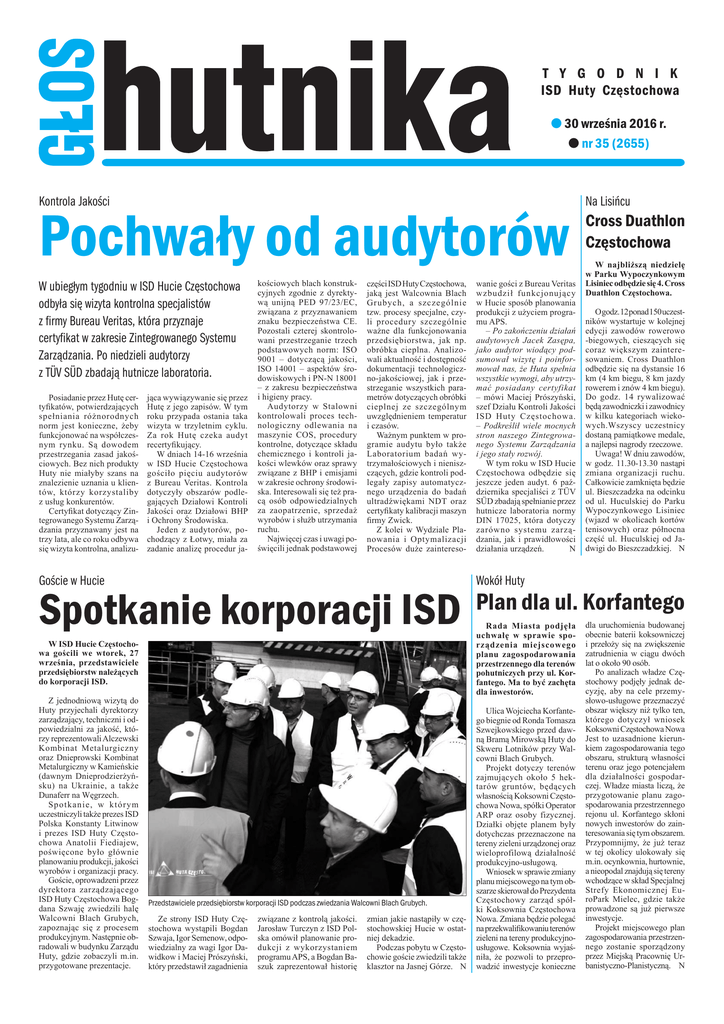t y g o d n i k ISD Huty Częstochowa l 30 września 2016 r. l nr 35 (2655) Kontrola Jakości Pochwały od audytorów W ubiegłym tygodniu w ISD Hucie Częstochowa odbyła się wizyta kontrolna specjalistów z firmy Bureau Veritas, która przyznaje certyfikat w zakresie Zintegrowanego Systemu Zarządzania. Po niedzieli audytorzy z TÜV SÜD zbadają hutnicze laboratoria. Posiadanie przez Hutę certyfikatów, potwierdzających spełniania różnorodnych norm jest konieczne, żeby funkcjonować na współczesnym rynku. Są dowodem przestrzegania zasad jakościowych. Bez nich produkty Huty nie miałyby szans na znalezienie uznania u klientów, którzy korzystaliby z usług konkurentów. Certyfikat dotyczący Zintegrowanego Systemu Zarządzania przyznawany jest na trzy lata, ale co roku odbywa się wizyta kontrolna, analizu- jąca wywiązywanie się przez Hutę z jego zapisów. W tym roku przypada ostania taka wizyta w trzyletnim cyklu. Za rok Hutę czeka audyt recertyfikujący. W dniach 14-16 września w ISD Hucie Częstochowa gościło pięciu audytorów z Bureau Veritas. Kontrola dotyczyły obszarów podlegających Działowi Kontroli Jakości oraz Działowi BHP i Ochrony Środowiska. Jeden z audytorów, pochodzący z Łotwy, miała za zadanie analizę procedur ja- kościowych blach konstrukcyjnych zgodnie z dyrektywą unijną PED 97/23/EC, związana z przyznawaniem znaku bezpieczeństwa CE. Pozostali czterej skontrolowani przestrzeganie trzech podstawowych norm: ISO 9001 – dotyczącą jakości, ISO 14001 – aspektów środowiskowych i PN-N 18001 – z zakresu bezpieczeństwa i higieny pracy. Audytorzy w Stalowni kontrolowali proces technologiczny odlewania na maszynie COS, procedury kontrolne, dotyczące składu chemicznego i kontroli jakości wlewków oraz sprawy związane z BHP i emisjami w zakresie ochrony środowiska. Interesowali się też pracą osób odpowiedzialnych za zaopatrzenie, sprzedaż wyrobów i służb utrzymania ruchu. Najwięcej czas i uwagi poświęcili jednak podstawowej części ISD Huty Częstochowa, jaką jest Walcownia Blach Grubych, a szczególnie tzw. procesy specjalne, czyli procedury szczególnie ważne dla funkcjonowania przedsiębiorstwa, jak np. obróbka cieplna. Analizowali aktualność i dostępność dokumentacji technologiczno-jakościowej, jak i przestrzeganie wszystkich parametrów dotyczących obróbki cieplnej ze szczególnym uwzględnieniem temperatur i czasów. Ważnym punktem w programie audytu było także Laboratorium badań wytrzymałościowych i nieniszczących, gdzie kontroli podlegały zapisy automatycznego urządzenia do badań ultradźwiękami NDT oraz certyfikaty kalibracji maszyn firmy Zwick. Z kolei w Wydziale Planowania i Optymalizacji Procesów duże zaintereso- wanie gości z Bureau Veritas wzbudził funkcjonujący w Hucie sposób planowania produkcji z użyciem programu APS. – Po zakończeniu działań audytowych Jacek Zasępa, jako audytor wiodący podsumował wizytę i poinformował nas, że Huta spełnia wszystkie wymogi, aby utrzymać posiadany certyfikat – mówi Maciej Prószyński, szef Działu Kontroli Jakości ISD Huty Częstochowa. – Podkreślił wiele mocnych stron naszego Zintegrowanego Systemu Zarządzania i jego stały rozwój. W tym roku w ISD Hucie Częstochowa odbędzie się jeszcze jeden audyt. 6 października specjaliści z TÜV SÜD zbadają spełnianie przez hutnicze laboratoria normy DIN 17025, która dotyczy zarówno systemu zarządzania, jak i prawidłowości działania urządzeń. N Goście w Hucie Wokół Huty W ISD Hucie Częstochowa gościli we wtorek, 27 września, przedstawiciele przedsiębiorstw należących do korporacji ISD. Rada Miasta podjęła uchwałę w sprawie sporządzenia miejscowego planu zagospodarowania przestrzennego dla terenów pohutniczych przy ul. Korfantego. Ma to być zachęta dla inwestorów. Spotkanie korporacji ISD Z jednodniową wizytą do Huty przyjechali dyrektorzy zarządzający, techniczni i odpowiedzialni za jakość, którzy reprezentowali Alczewski Kombinat Metalurgiczny oraz Dnieprowski Kombinat Metalurgiczny w Kamieńskie (dawnym Dnieprodzierżyńsku) na Ukrainie, a także Dunaferr na Węgrzech. Spotkanie, w którym uczestniczyli także prezes ISD Polska Konstanty Litwinow i prezes ISD Huty Częstochowa Anatolii Fiediajew, poświęcone było głównie planowaniu produkcji, jakości wyrobów i organizacji pracy. Goście, oprowadzeni przez dyrektora zarządzającego ISD Huty Częstochowa Bogdana Szwaję zwiedzili halę Walcowni Blach Grubych, zapoznając się z procesem produkcyjnym. Następnie obradowali w budynku Zarządu Huty, gdzie zobaczyli m.in. przygotowane prezentacje. Przedstawiciele przedsiębiorstw korporacji ISD podczas zwiedzania Walcowni Blach Grubych. Ze strony ISD Huty Częstochowa wystąpili Bogdan Szwaja, Igor Semenow, odpowiedzialny za wagi Igor Dawidkow i Maciej Prószyński, który przedstawił zagadnienia związane z kontrolą jakości. Jarosław Turczyn z ISD Polska omówił planowanie produkcji z wykorzystaniem programu APS, a Bogdan Baszuk zaprezentował historię zmian jakie nastąpiły w częstochowskiej Hucie w ostatniej dekadzie. Podczas pobytu w Częstochowie goście zwiedzili także klasztor na Jasnej Górze. N Na Lisińcu Cross Duathlon Częstochowa W najbliższą niedzielę w Parku Wypoczynkowym Lisiniec odbędzie się 4. Cross Duathlon Częstochowa. O godz. 12 ponad 150 uczestników wystartuje w kolejnej edycji zawodów rowerowo -biegowych, cieszących się coraz większym zainteresowaniem. Cross Duathlon odbędzie się na dystansie 16 km (4 km biegu, 8 km jazdy rowerem i znów 4 km biegu). Do godz. 14 rywalizować będą zawodniczki i zawodnicy w kilku kategoriach wiekowych.Wszyscy uczestnicy dostaną pamiątkowe medale, a najlepsi nagrody rzeczowe. Uwaga! W dniu zawodów, w godz. 11.30-13.30 nastąpi zmiana organizacji ruchu. Całkowicie zamknięta będzie ul. Bieszczadzka na odcinku od ul. Huculskiej do Parku Wypoczynkowego Li