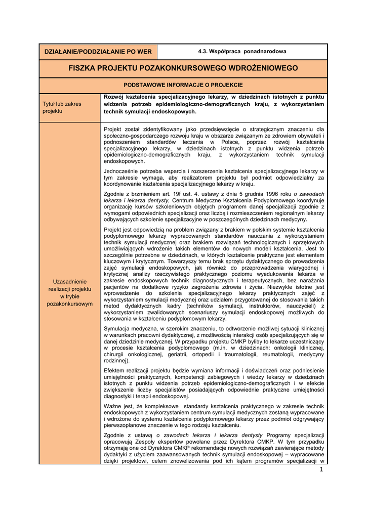 DZIAŁANIE/PODDZIAŁANIE PO WER 4.3. Współpraca ponadnarodowa FISZKA PROJEKTU POZAKONKURSOWEGO WDROŻENIOWEGO PODSTAWOWE INFORMACJE O PROJEKCIE Tytuł lub zakres projektu Rozwój kształcenia specjalizacyjnego lekarzy, w dziedzinach istotnych z punktu widzenia potrzeb epidemiologiczno-demograficznych kraju, z wykorzystaniem technik symulacji endoskopowych. Projekt został zidentyfikowany jako przedsięwzięcie o strategicznym znaczeniu dla społeczno-gospodarczego rozwoju kraju w obszarze związanym ze zdrowiem obywateli i podnoszeniem standardów leczenia w Polsce, poprzez rozwój kształcenia specjalizacyjnego lekarzy, w dziedzinach istotnych z punktu widzenia potrzeb epidemiologiczno-demograficznych kraju, z wykorzystaniem technik symulacji endoskopowych. Jednocześnie potrzeba wsparcia i rozszerzenia kształcenia specjalizacyjnego lekarzy w tym zakresie wymaga, aby realizatorem projektu był podmiot odpowiedzialny za koordynowanie kształcenia specjalizacyjnego lekarzy w kraju. Zgodnie z brzmieniem art. 19f ust. 4. ustawy z dnia 5 grudnia 1996 roku o zawodach lekarza i lekarza dentysty, Centrum Medyczne Kształcenia Podyplomowego koordynuje organizację kursów szkoleniowych objętych programem danej specjalizacji zgodnie z wymogami odpowiednich specjalizacji oraz liczbą i rozmieszczeniem regionalnym lekarzy odbywających szkolenie specjalizacyjne w poszczególnych dziedzinach medycyny. Uzasadnienie realizacji projektu w trybie pozakonkursowym Projekt jest odpowiedzią na problem związany z brakiem w polskim systemie kształcenia podyplomowego lekarzy wypracowanych standardów nauczania z wykorzystaniem technik symulacji medycznej oraz brakiem rozwiązań technologicznych i sprzętowych umożliwiających wdrożenie takich elementów do nowych modeli kształcenia. Jest to szczególnie potrzebne w dziedzinach, w których kształcenie praktyczne jest elementem kluczowym i krytycznym. Towarzyszy temu brak sprzętu dydaktycznego do prowadzenia zajęć symulacji endoskopowych, jak również do przeprowadzenia wiarygodnej i krytycznej analizy rzeczywistego praktycznego poziomu wyedukowania lekarza w zakresie endoskopowych technik diagnostycznych i terapeutycznych, bez narażania pacjentów na dodatkowe ryzyko zagrożenia zdrowia i życia. Niezwykle istotne jest wprowadzenie do szkolenia specjalizacyjnego lekarzy praktycznych zajęć z wykorzystaniem symulacji medycznej oraz udziałem przygotowanej do stosowania takich metod dydaktycznych kadry (techników symulacji, instruktorów, nauczycieli) z wykorzystaniem zwalidowanych scenariuszy symulacji endoskopowej możliwych do stosowania w kształceniu podyplomowym lekarzy. Symulacja medyczna, w szerokim znaczeniu, to odtworzenie możliwej sytuacji klinicznej w warunkach pracowni dydaktycznej, z możliwością interakcji osób specjalizujących się w danej dziedzinie medycznej. W przypadku projektu CMKP byliby to lekarze uczestniczący w procesie kształcenia podyplomowego (m.in. w dziedzinach: onkologii klinicznej, chirurgii onkologicznej, geriatrii, ortopedii i traumatologii, reumatologii, medycyny rodzinnej). Efektem realizacji projektu będzie wymiana informacji i doświadczeń oraz podniesienie umiejętności praktycznych, kompetencji zabiegowych i wiedzy lekarzy w dziedzinach istotnych z punktu widzenia potrzeb epidemiologiczno-demograficznych i w efekcie zwiększenie liczby specjalistów posiadających odpowiednie praktyczne umiejętności diagnostyki i terapii endoskopowej. Ważne jest, że kompleksowe standardy kształcenia praktycznego w zakresie technik endoskopowych z wykorzystaniem centrum symulacji medycznych zostaną wypracowane i wdrożone do systemu kształcenia podyplomowego lekarzy przez podmiot odgrywający pierwszoplanowe znaczenie w tego rodzaju kształceniu. Zgodnie z ustawą o zawodach lekarza i lekarza dentysty Programy specjalizacji opracowują Zespoły ekspertów powołane przez Dyrektora CMKP. W tym przypadku otrzymają one od Dyrektora CMKP rekomendacje nowych rozwiązań zawierające metody dydaktyki z użyciem zaawansowanych technik symulacji endoskopowej – wypracowane dzięki projektowi, celem znowelizowania pod ich kątem programów specjalizacji w 1 wybranych dziedzinach medycyny. Dyrektor CMKP przekaże je Ministrowi Zdrowia do zatwierdzenia, a następnie opublikuje je jako obowiązujące w szkoleniu specjalizacyjnym lekarzy. Praktycznym wdrożeniem rozwiązania (wypracowanego ze wsparciem partnera ponadnarodowego), będzie opracowanie zmian do programów specjalizacji w wybranych dziedzinach medycyny, przekazanie ich do formalnego zatwierdzenia przez Ministra Zdrowia oraz opublikowanie ich przez CMKP. W dalszej kolejności na podstawie zmienionych programów specjalizacji opracowane zostaną nowe programy kursów specjalizacyjnych (zgodnie z art. 19g ust 1 i nast. ustawy o zawodach lekarza i lekarza dentysty) uwzględniające elementy symulacji medycznej (czyli m.in. opracowane w ramach projektu ze wsparciem partnera ponadnarodowego scenariusze symulacyjne). Zmiany polegać będą na ujęciu określonych zabiegów endoskopowych z użyciem technik i urządzeń symulacji medycznej, jako obowiązkowych elementów programów specjalizacji obowiązujących w szkoleniu specjalizacyjnym lekarzy. Na niższym szczeblu wdrożenie polegać będzie na uwzględnieniu tych zabiegów, w postaci opracowanych scenariuszy – jako obowiązkowych elementów programów kursów szkoleniowych przewidzianych w ww. programach specjalizacji. Scenariusze te będą odpowiednikami realnych procedur medycznych przeprowadzanych dotychczas na pacjentach w warunkach klinicznych. Wdrożenie rozwiązania do praktyki nie wymaga zmian prawnych. Cel szczegółowy PO WER, w ramach którego projekt będzie realizowany Wdrożenie nowych rozwiązań, w szczególności z zakresu aktywizacji zawodowej, kształcenia przez całe życie i tworzenia oraz realizacji polityk publicznych, dzięki współpracy z partnerami zagranicznymi. 10 III Prioryte