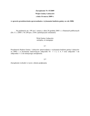 Zarządzenie Nr 15/2009 Wójta Gminy Lubaczów z dnia 16 marca 2009 r. w sprawie przedstawienia sprawozdania z wykonania budŜetu gminy za rok 2008. Na podstawie art. 199 ust 1 ustawy z dnia 20 grudnia 2005 r. o finansach publicznych (Dz. U. z 2005 r. Nr 249 poz. 2104 z późniejszymi zmianami) Wójt Gminy Lubaczów zarządza, co następuje: §1 Przedstawić Radzie Gminy Lubaczów sprawozdanie z wykonania budŜetu gminy Lubaczów za 2008 r. w brzmieniu stanowiącym załączniki Nr 1 i 2, 3, 4, 5 oraz załącznik 1 do załącznika 1 i 2 do niniejszego zarządzenia. §2 Zarządzenie wchodzi w Ŝycie z dniem podpisania Załącznik Nr 1, 2 do Zarządzenia Nr 15/2009 Wójta Gminy Lubaczów z dnia 16 marca 2009 r. Sprawozdanie Wójta Gminy Lubaczów z wykonania budŜetu za 2008 rok. Uchwałą Nr XV/160/2008 z dnia 7 lutego 2008 r. Rada Gminy Lubaczów uchwaliła dochody i wydatki budŜetowe Gminy Lubaczów na 2008 r. w następujących kwotach: - dochody budŜetowe ogółem - 20.590.860 zł - wydatki budŜetowe ogółem - 21.878.060 zł Uchwalono deficyt budŜetu na 2008 rok w kwocie 1.287.200 zł. Wyodrębniono wydatki na realizację zadań bieŜących z zakresu administracji rządowej zleconych gminie oraz dotacje celowe związane z realizacją, tych zadań w wysokości 3.717.214 złotych. Wyodrębniono środki na dofinansowanie doskonalenia zawodowego nauczycieli w tym organizację systemu doradztwa zawodowego w wysokości 1% planowanych rocznych wydatków przeznaczonych na wynagrodzenia osobowe nauczycieli w wysokości 37.339 zł. Określono wysokość dochodów z tytułu wydawania zezwoleń na sprzedaŜ napojów alkoholowych na kwotę 59.000 zł i wydatki na realizacje zadań ujętych w Programie Profilaktyki i Rozwiązywania Problemów Alkoholowych w wysokości 54.000 zł oraz Gminnym programie Przeciwdziałania Narkomanii w wysokości 5.000 zł. Ustalono w dziale 600 „Transport i łączność” rozdział 60013 „Drogi publiczne wojewódzkie” wydatki majątkowe w formie dotacji celowej na pomoc finansową w kwocie 15.000 zł dla Województwa Podkarpackiego na realizację zadania „Budowa chodnika w Baszni Dolnej przy drodze wojewódzkiej Nr 867 Sieniawa – Hrebenne j”. Ustalono w dziale 600 „Transport i łączność” rozdział 60014 „Drogi publiczne powiatowe” wydatki bieŜące w formie dotacji celowej na pomoc finansową w kwocie 231.00 zł dla Powiatu w Lubaczowie na realizację następujących zadań: - odnowa nawierzchni drogi powiatowej nr 1682 R Lubaczów - Borowa Góra w wysokości 32.000 zł, - odnowa nawierzchni drogi powiatowej nr 1691 R Basznia - Wólka Horyniecka w wysokości 25.000 zł, - odnowa nawierzchni drogi powiatowej nr 1688 R Lubaczów – Basznia w wysokości 40.000 zł, - odnowa nawierzchni drogi powiatowej nr 1693 R Krowica Hołodowska – śmijowiska Wielkie Oczy w wysokości 43.000 zł, - odnowa nawierzchni drogi powiatowej nr 1680 R Lisie Jamy – Dąbrowa w wysokości 54.000 zł, - odnowa nawierzchni drogi powiatowej nr 1664 R Lubaczów – Tymce w wysokości 15.000 zł, - odnowa nawierzchni drogi powiatowej nr 1679 R Lubaczów - Krowica Lasowa w wysokości 22.000 zł. Ustalono w dziale 600 „Transport i łączność” rozdział 60014 „Drogi publiczne powiatowe” wydatki majątkowe w formie dotacji celowej na pomoc finansową w kwocie 60.000 zł dla Powiatu Lubaczowskiego na realizację następującego zadania: − Budowa chodnika w ciągu drogi powiatowej Nr 1674 R Lubaczów – Szczutków – Duńkowice na odcinku Lubaczów – Opaka. 2 Wyodrębniono wydatki związane z wieloletnimi programami inwestycyjnymi na 2008 r. w kwocie 658.603 zł, w tym na program „Rozwiązanie gospodarki ściekowej w północnej części gminy Lubaczów” w kwocie 658.603 zł na zadanie: - Kompleksowe rozwiązanie gospodarki ściekowej w aglomeracji Cieszanów i ZałuŜe – 658.603 zł. Uchwalono: − plan przychodów funduszy celowych w kwocie 4.000 zł, − plan wydatków funduszy celowych w kwocie 6.000 zł, − plan przychodów zakładu budŜetowego pn. „Zakład Usług Komunalnych w ZałuŜu” w kwocie 332.108 zł, − plan wydatków zakładu budŜetowego pn. „Zakład Usług Komunalnych w ZałuŜu” w kwocie 332.108 zł, − wysokość dotacji dla instytucji kultury w kwocie 712.906 zł, − wysokość dotacji przedmiotowej z przeznaczeniem na dopłatę do taryf za zbiorowe odprowadzenie ścieków, wprowadzanych do urządzeń kanalizacyjnych w kwocie 43.507 zł, − wysokość dotacji celowej z budŜetu gminy na zadania własne gminy zlecone do realizacji innym podmiotom w wysokości 112.314 zł, − dotacje celowe na zadania realizowane na podstawie porozumień miedzy gminami w kwocie 601.103 zł, Ustalono: a) przychody budŜetu w wysokości 1.734.700 zł w tym - z kredytów i poŜyczek w wysokości 1.734.700 zł, b) rozchody budŜetu w wysokości 447.500 zł w tym - na spłatę rat kredytów i poŜyczek w wysokości 447.500 zł. Ustalono spłatę rat kredytów i poŜyczek w kwocie 447.500 zł. Spłata zaciągniętych poŜyczek i kredytów na dzień 31.12.2008 r. wynosi: − poŜyczka zaciągnięta w 2005 r. w Narodowym Funduszu Ochrony Środowiska i Gospodarki Wodnej w Warszawie - 84.000 zł, − poŜyczka zaciągnięta w 2005 r. w Wojewódzkim Funduszu Ochrony Środowiska i Gospodarki Wodnej w Rzeszowie – 56.000 zł, − poŜyczka zaciągnięta w 2006 r. w Wojewódzkim Funduszu Ochrony Środowiska i Gospodarki Wodnej w Rzeszowie – 32.500 zł, − kredyt zaciągnięty w 2006 r. w Banku Gospodarki śywnościowej w Rzeszowie – 95.000 zł, − kredyt zaciągnięty w Powiatowym Banku Spółdzielczym w Lubaczowie – 180.000 zł. W ciągu roku budŜet Gminy uległ zwiększeniu poprzez wprowadzenie uchwałami Rady Gminy dodatkowych środków po stronie dochodów i wydatków oraz Zarządzeniami Wójta Gminy dotacji celowych za realizację zadań zleconych. Uchwałą Rady Gminy Nr XXI/231/2008 Rady Gminy Lubaczów z dnia 3 lipca 2008 roku i Uchw