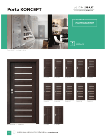 od 479,- | 589,17 Porta KONCEPT cena skrzydła netto | brutto (PLN) EKSPERT POLECA Tradycyjna konstrukcja ramiakowa to gwarancja wieloletniej trwałości. Kolekcja w stylu NOWOCZESNYM Porta KONCEPT A.9, Akacja Srebrna Porta KONCEPT A.9, Dąb Havana 52 model A.0 model A.1 model A.2 model A.3 model A.4 model A.5 model A.6 model A.7 model A.8 model A.9 model B.0 model B.1 SZCZEGÓŁOWA OFERTA DOSTĘPNA RÓWNIEŻ NA www.porta.com.pl 60 - 100 120 - 200 Porta XXX KONCEPT XXX RAMIAKOWE CENNIK NETTO | BRUTTO PLN KOLORYSTYKA Okleina Portadecor Biały Popielaty Euroinvest Buk Bawaria Orzech Bielony Orzech Verona 2 Orzech Verona 3* Wiśnia Orzech Wenge MODELE Portadecor, Portasynchro 3D Portadur, Portacortex Super Matt, Portaperfect 3D A.0 – A.9 509 | 626,07 559 | 687,57 579 | 712,17 B.0, B.1 479 | 589,17 529 | 650,67 549 | 675,27 * do wyczerpania zapasów NOWOŚĆ Okleina Portasynchro 3D NOWY Akacja Miodowa Akacja Srebrna Dąb Szkarłatny Dąb Ciemny Kora 3 Kora 4* Wenge White NOWY Zobacz nowe modele: www.porta.com.pl/dm/portakoncepth.wmv Sosna Norweska Okleina Portacortex Kora 1 Kora 2* * do wyczerpania zapasów Okleina Super Matt POLECAMY! Biały SPECJALNA KONSTRUKCJA WIELOWARSTWOWA DREWNIANA Okleina Portadur Orzech 2 Orzech 3 Orzech 4 Orzech 6 NOWOŚĆ Okleina Portaperfect 3D NOWY Dąb Hawana Dąb Kalifornia Dąb Malibu Dąb Skandynawski NOWY Dąb Klasyczny NOWY Dąb Syberyjski NOWY Dąb Południowy szyba matowa KONSTRUKCJA SKRZYDŁA Skrzydła w zależności od wzoru składają się z ramiaków poziomych i płycin oraz szyb matowych wykonanych ze szkła hartowanego. Szyby matowe o grubości 6 mm. AKCESORIA W CENIE SKRZYDŁA • Zamek dostępny w trzech wariantach: na klucz zwykły, z blokadą łazienkową lub dostosowany pod wkładkę patentową • Trzy zawiasy czopowe standard, dostępny także pakiet PRIME, patrz Dopłaty • Szyba hartowana matowa • Przygotowanie do skrótu, maksymalnie 60 mm • Pochwyt okrągły (do drzwi przesuwnych) OŚCIEŻNICE Rekomendowane ościeżnice przylgowe: • Porta SYSTEM str. 150 • MINIMAX str. 148 Rekomendowane ościeżnice bezprzylgowe: • Porta SYSTEM ELEGANCE str. 152 • LEVEL str. 154 panel płaski UWAGI • Aprobata Techniczna AT-15-6515/2009, ITB Warszawa. • Możliwość dowolnego zestawienia wymiarów skrzydeł w drzwiach podwójnych. Przy drzwiach podwójnych bezprzylgowych należy zamawiać skrzydło czynne i bierne. • Skrzydło podwójne niedostępne z zamkiem magnetycznym. DOPŁATY • • • • • • • • • rozmiar „100” tuleje wentylacyjne lub podcięcie wentylacyjne zawiasy PRIME (dotyczy dedykowanych ościeżnic) zamek PRIME z czołem połysk (srebrny lub złoty) trzeci zawias 3D zamek magnetyczny zamek hakowy z pochwytami bocznymi (drzwi przesuwne) nakładki na zawiasy standard (komplet na jedną sztukę) klamka z szyldem 50 | 61,50 26 | 31,98 20 | 24,60 10 | 12,30 66 | 81,18 45 | 55,35 151 | 185,73 4,66 | 5,73 (str. 176) 53 od 479,- | 589,17 Porta KONCEPT cena skrzydła netto | brutto (PLN) EKSPERT POLECA Tradycyjna konstrukcja ramiakowa to gwarancja wieloletniej trwałości. Kolekcja w stylu NOWOCZESNYM Porta KONCEPT H.4, H.0, Biały Porta KONCEPT H.4, Sosna Norweska 54 model C.0 model C.1 model C.2 model C.3 model C.5 model C.6 model H.0 model H.4 model K.0 model K.1 model K.2 model K.3 SZCZEGÓŁOWA OFERTA DOSTĘPNA RÓWNIEŻ NA www.porta.com.pl model C.4 Okleina Portadecor Orzech Bielony 120 - 200 CENNIK NETTO | BRUTTO PLN KOLORYSTYKA Biały 60 - 100 Porta XXX KONCEPT XXX RAMIAKOWE Popielaty Euroinvest Buk Bawaria Orzech Verona 2 Orzech Verona 3* Wiśnia Orzech Wenge MODELE Portadecor, Portasynchro 3D Portadur, Portacortex Super Matt, Portaperfect 3D C.0 - C.6 H.0 - H.4 K.0 - K.3 479 | 589,17 529 | 650,67 549 | 675,27 * do wyczerpania zapasów NOWOŚĆ Okleina Portasynchro 3D NOWY Akacja Miodowa Akacja Srebrna Dąb Szkarłatny Dąb Ciemny Kora 3 Kora 4* Wenge White NOWY Zobacz nowe modele: www.porta.com.pl/dm/portakoncepth.wmv Sosna Norweska Okleina Portacortex Kora 1 Kora 2* * do wyczerpania zapasów Okleina Super Matt POLECAMY! Biały SPECJALNA KONSTRUKCJA WIELOWARSTWOWA DREWNIANA Okleina Portadur Orzech 2 Orzech 3 Orzech 4 Orzech 6 NOWOŚĆ Okleina Portaperfect 3D NOWY Dąb Hawana Dąb Kalifornia Dąb Malibu Dąb Skandynawski NOWY Dąb Klasyczny NOWY Dąb Syberyjski NOWY Dąb Południowy szyba matowa KONSTRUKCJA SKRZYDŁA Skrzydła w zależności od wzoru składają się z ramiaków poziomych i płycin oraz szyb matowych wykonanych ze szkła hartowanego. Szyby matowe o grubości 6 mm. AKCESORIA W CENIE SKRZYDŁA • Zamek dostępny w trzech wariantach: na klucz zwykły, z blokadą łazienkową lub dostosowany pod wkładkę patentową • Trzy zawiasy czopowe standard, dostępny także pakiet PRIME, patrz Dopłaty • Szyba hartowana matowa lub „kratka” przezroczysta (biała i brązowa) • Przygotowanie do skrótu, maksymalnie 60 mm • Pochwyt okrągły (do drzwi przesuwnych) OŚCIEŻNICE Rekomendowane ościeżnice przylgowe: • Porta SYSTEM str. 150 • MINIMAX str. 148 Rekomendowane ościeżnice bezprzylgowe: • Porta SYSTEM ELEGANCE str. 152 • LEVEL str. 154 panel płaski UWAGI • Aprobata Techniczna AT-15-6515/2009, ITB Warszawa. • Możliwość dowolnego zestawienia wymiarów skrzydeł w drzwiach podwójnych. Przy drzwiach podwójnych bezprzylgowych należy zamawiać skrzydło czynne i bierne. • Skrzydło podwójne niedostępne z zamkiem magnetycznym. DOPŁATY • • • • • • • • • • rozmiar „100” szyby „kratka” mat (biała i brązowa) tuleje wentylacyjne lub podcięcie wentylacyjne zawiasy PRIME (dotyczy dedykowanych ościeżnic) zamek PRIME z czołem połysk (srebrny lub złoty) trzeci zawias 3D zamek magnetyczny zamek hakowy z pochwytami bocznymi (drzwi przesuwne) nakładki na zawiasy standard (komplet na jedną sztukę) klamka z szyldem 50 | 61,50 25 | 30,75 26 | 31,98 20 | 24,60 10 | 12,30 66 | 81,18 45 | 55,35 151 | 185,73 4,66 | 5,73 (str. 176) 55